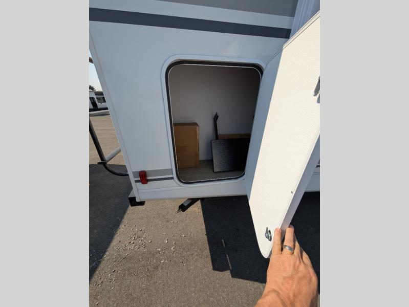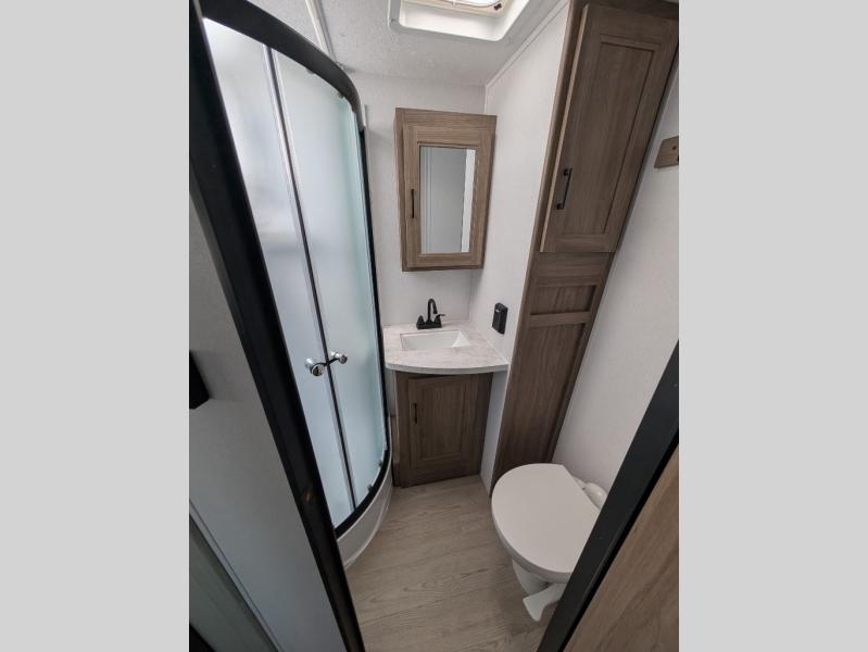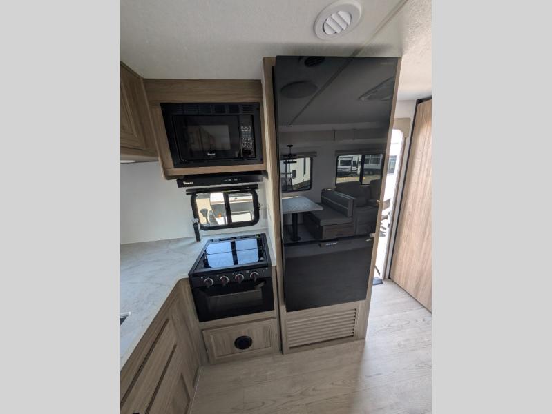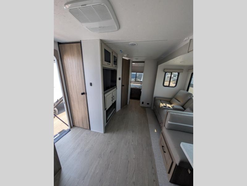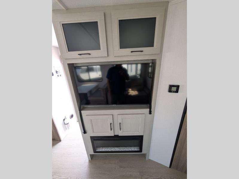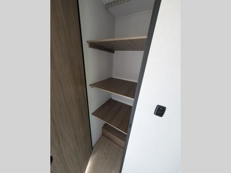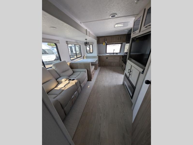 Comfort comes easy in this front kitchen travel trailer for four! You will love the rear master bedroom with its king bed slide out, spacious wardrobe, and a private entrance into the dual entry bath. There is a sofa that sits directly across from the fireplace and entertainment center, or you can choose the optional theater seat or optional hide-a-bed sofa in place of the standard sofa. The front kitchen features tons of counter space, an 8 cu. ft. double door refrigerator, plus a large pantry for dry good and snacks. There is also a pantry/closet just as you enter the trailer that will be perfect for shoes and jackets!