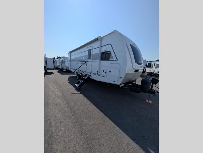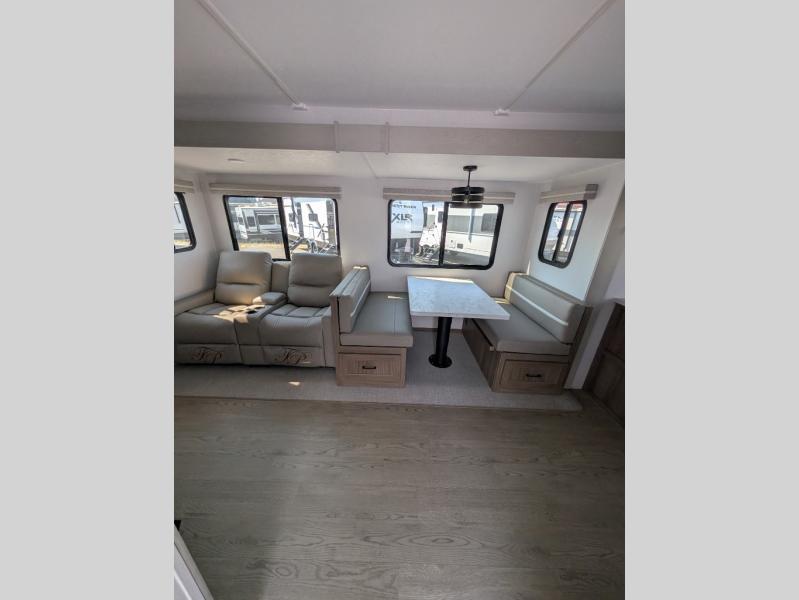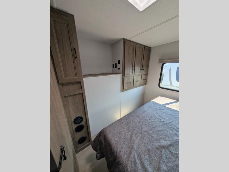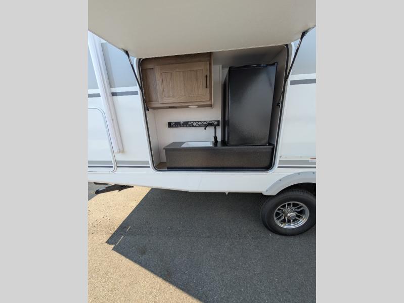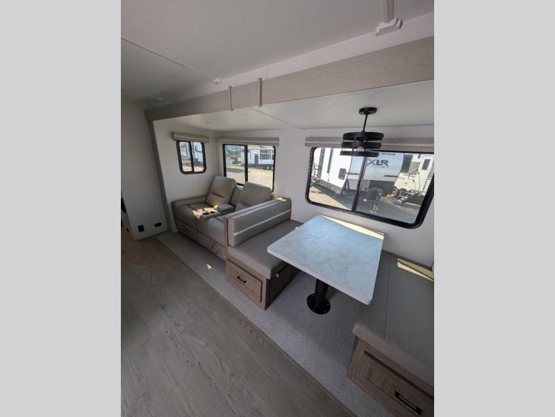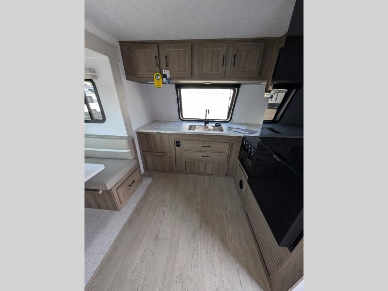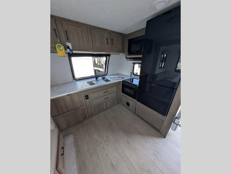 Comfort comes easy in this front kitchen travel trailer for four! You will love the rear master bedroom with its king bed slide out, spacious wardrobe, and a private entrance into the dual entry bath. There is a sofa that sits directly across from the fireplace and entertainment center, or you can choose the optional theater seat or optional hide-a-bed sofa in place of the standard sofa. The front kitchen features tons of counter space, an 8 cu. ft. double door refrigerator, plus a large pantry for dry good and snacks. There is also a pantry/closet just as you enter the trailer that will be perfect for shoes and jackets!