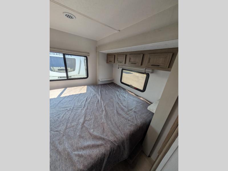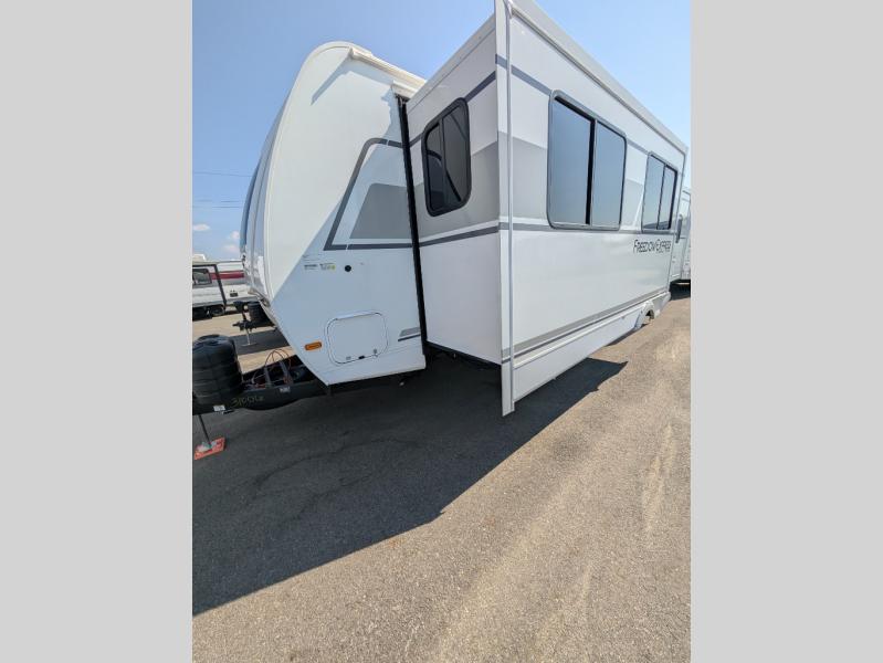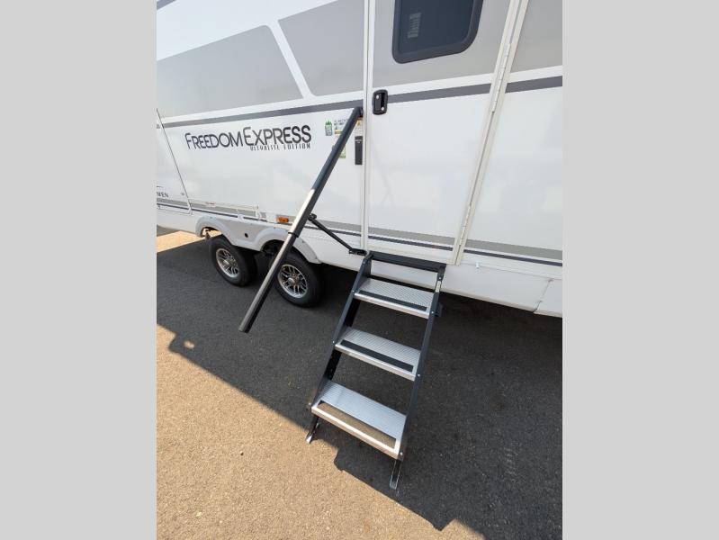 With any Freedom Express Ultra Lite travel trailer by Coachmen you will appreciate quality construction materials, such as vacuum bonded walls with Azdel composite, a 3/4 gel coated fiberglass cap with an automotive glass windshield, and a heated enclosed underbelly. Each model also features Tufflex PVC roofing, front rock guard, and E-Z Lube axles for smooth towing. Inside, you'll find kitchen backsplash, hidden hinge cabinetry, and wear-resistant vinyl flooring throughout. The power tongue jack included with the Ultra Lite Express Package will make set-up a breeze, and each model includes back-up camera prep and they are Freedom solar ready if you plan to go off-grid. Enjoy lightweight camping with a Freedom Express Ultra Lite travel trailer today!