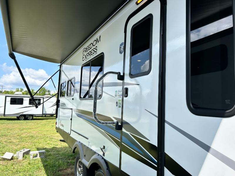 With any Freedom Express Ultra Lite travel trailer by Coachmen you will appreciate quality construction materials, such as vacuum bonded walls with Azdel composite, a 3/4 gel coated fiberglass cap with an automotive glass windshield, and a heated enclosed underbelly. Each model also features Tufflex PVC roofing, front rock guard, and E-Z Lube axles for smooth towing. Inside, you'll find kitchen backsplash, hidden hinge cabinetry, and wear-resistant vinyl flooring throughout. The power tongue jack included with the Ultra Lite Express Pack will make set-up a breeze, and each model includes back-up camera prep and they are Freedom solar ready if you plan to go off-grid. Enjoy lightweight camping with a Freedom Express Ultra Lite travel trailer today!