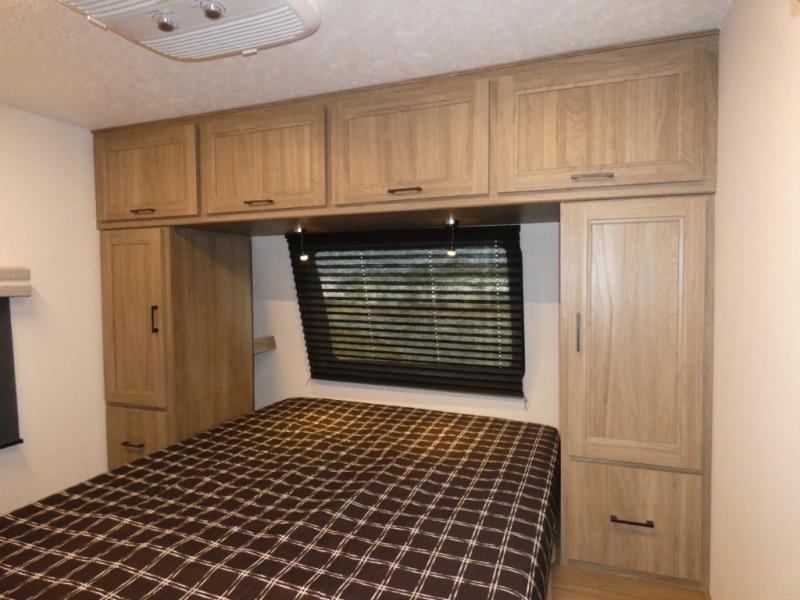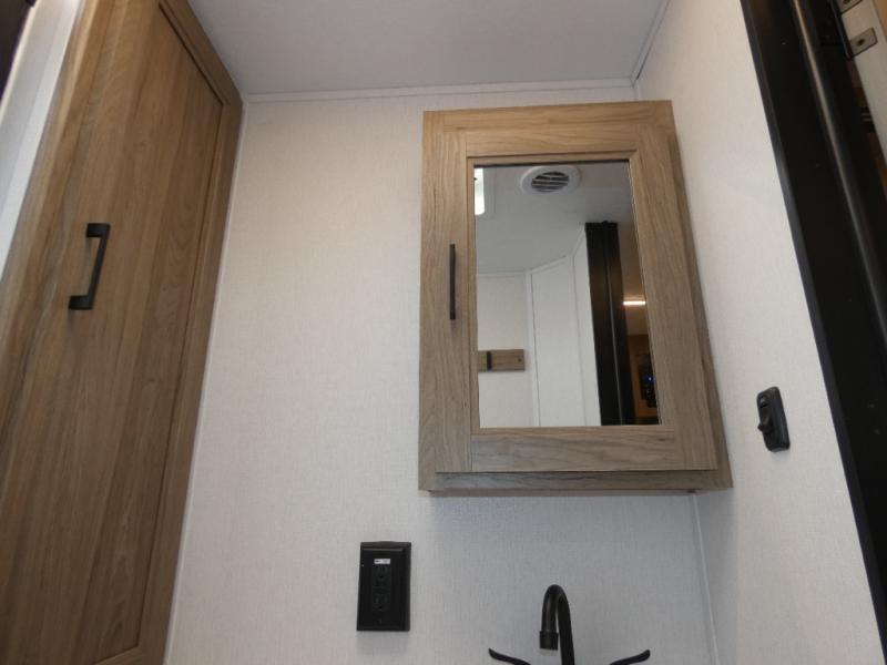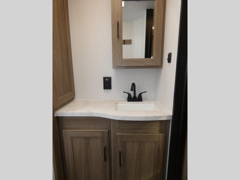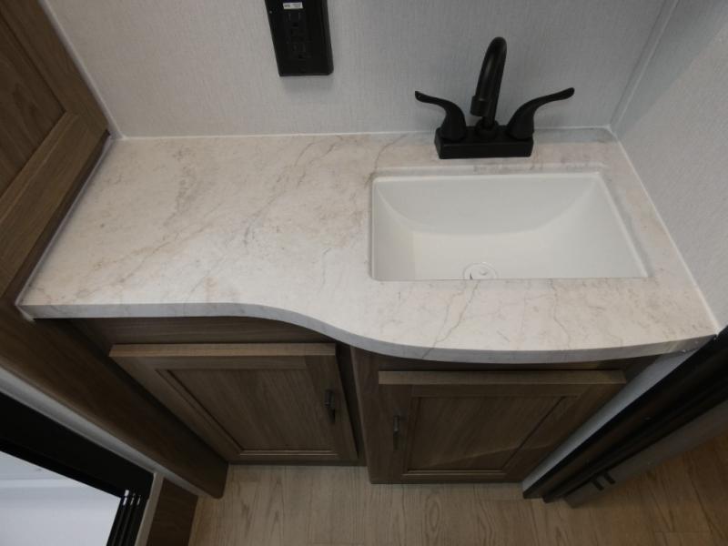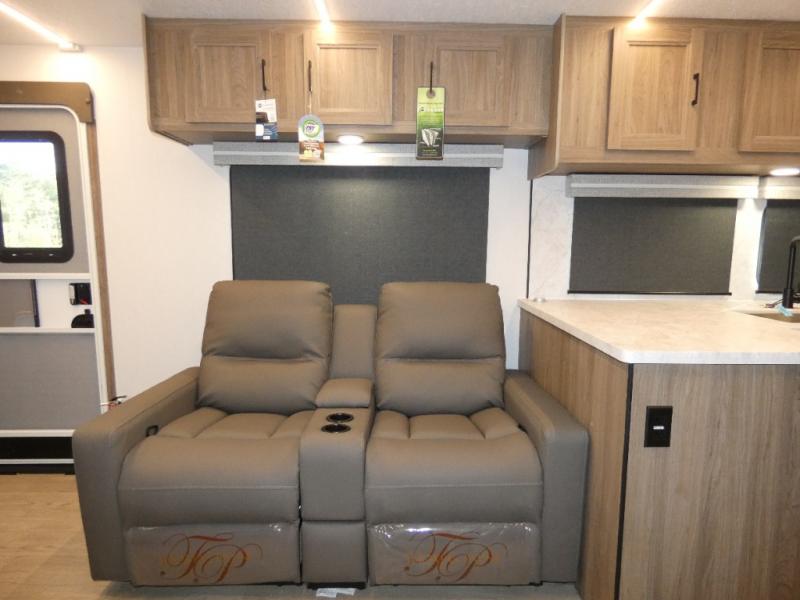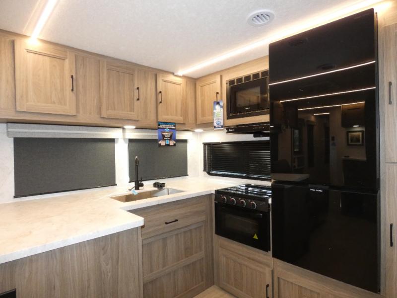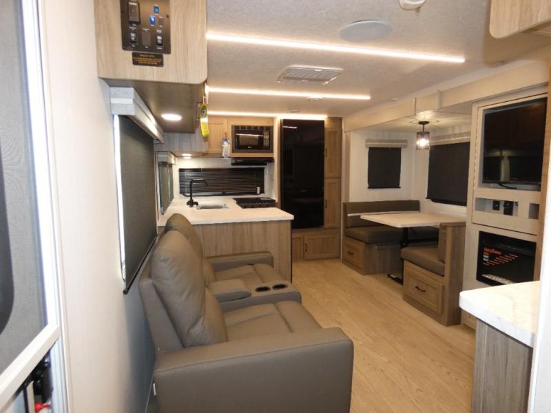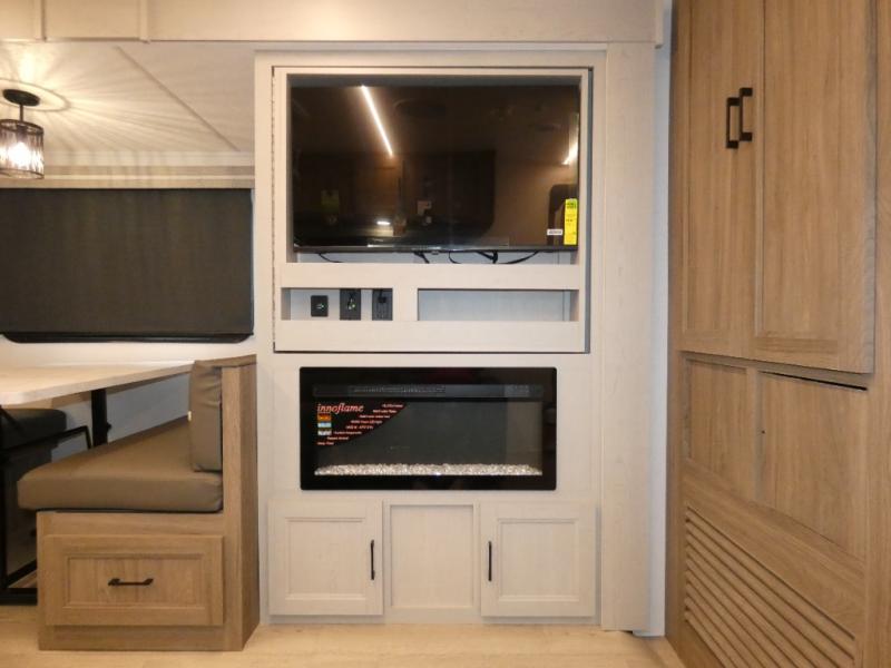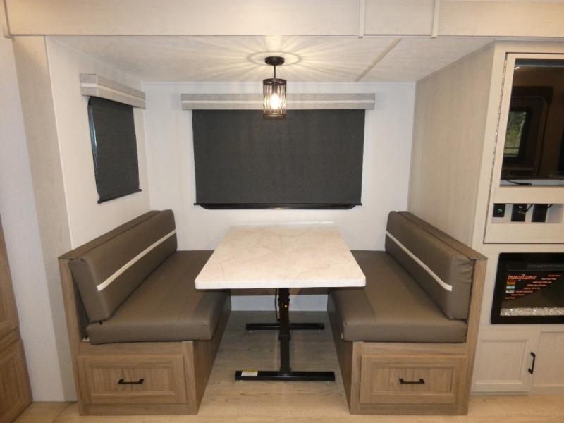 Are you looking for a travel trailer that will feel more like home? Look no further than this model that features a private bedroom up front, a full bath, plus a spacious rear kitchen. You will love to relax on the theatre sofa/hide-a-bed sofa across from the Smart TV and fireplace, and there is a booth dinette for dining. This model also includes a hidden pantry behind the TV for smart storage solutions. If the weather is nice you may just want to sit outdoors under the 18' power awning with LED lights. The chef of your group can prepare a meal on the pull-out camp kitchen, and the kids can grab their scooters from the pass-through storage.