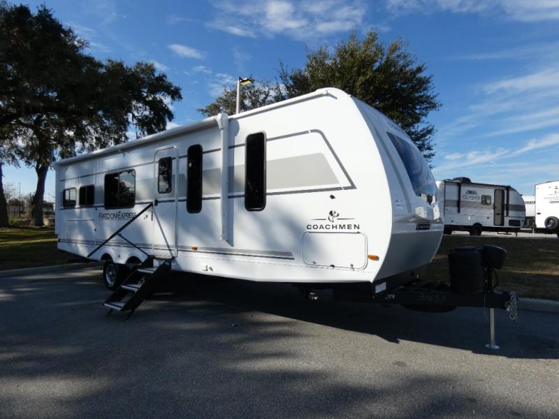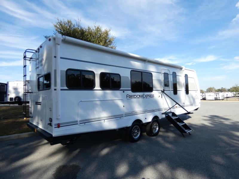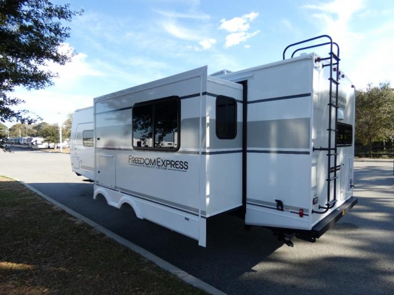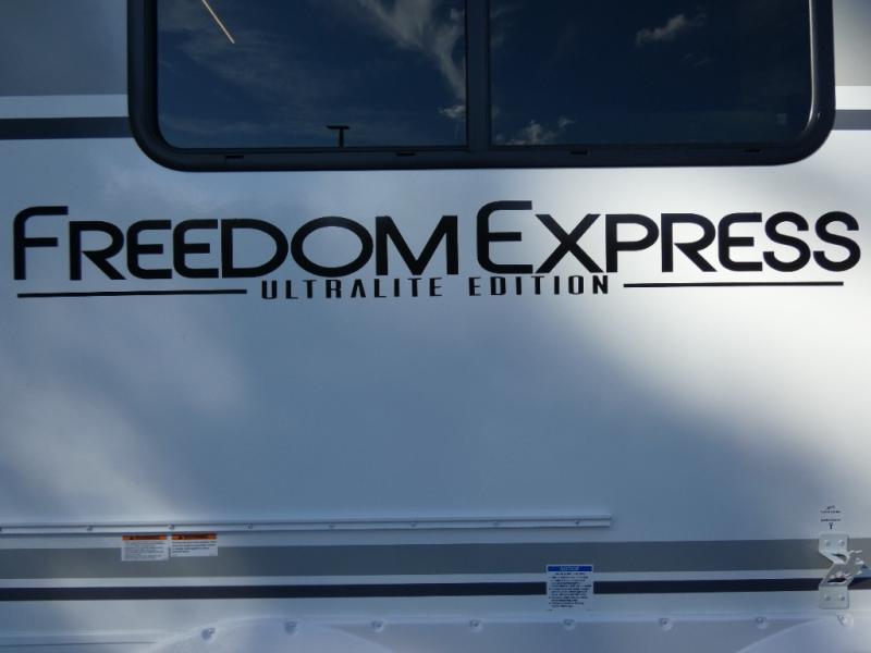 With any Freedom Express Ultra Lite travel trailer by Coachmen you will appreciate quality construction materials, such as vacuum bonded walls with Azdel composite, a 3/4 gel coated fiberglass cap with an automotive glass windshield, and a heated enclosed underbelly. Each model also features Tufflex PVC roofing, front rock guard, and E-Z Lube axles for smooth towing. Inside, you'll find kitchen backsplash, hidden hinge cabinetry, and wear-resistant vinyl flooring throughout. The power tongue jack included with the Ultra Lite Express Package will make set-up a breeze, and each model includes back-up camera prep and they are Freedom solar ready if you plan to go off-grid. Enjoy lightweight camping with a Freedom Express Ultra Lite travel trailer today!