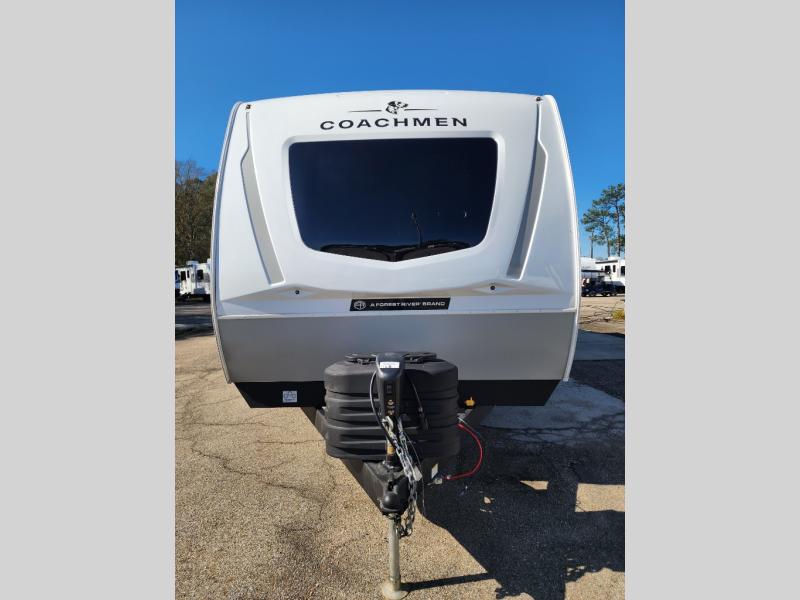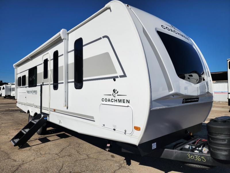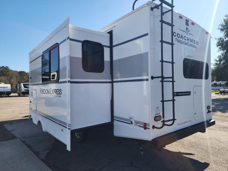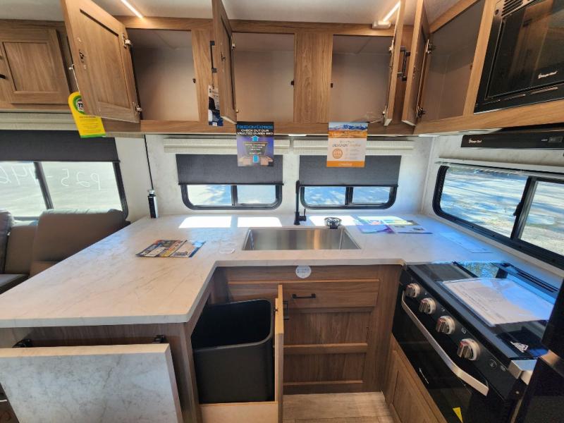 With any Freedom Express Ultra Lite travel trailer by Coachmen you will appreciate quality construction materials, such as vacuum bonded walls with Azdel composite, a 3/4 gel coated fiberglass cap with an automotive glass windshield, and a heated enclosed underbelly. Each model also features Tufflex PVC roofing, front rock guard, and E-Z Lube axles for smooth towing. Inside, you'll find kitchen backsplash, hidden hinge cabinetry, and wear-resistant vinyl flooring throughout. The power tongue jack included with the Ultra Lite Express Package will make set-up a breeze, and each model includes back-up camera prep and they are Freedom solar ready if you plan to go off-grid. Enjoy lightweight camping with a Freedom Express Ultra Lite travel trailer today!