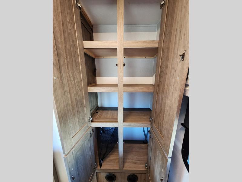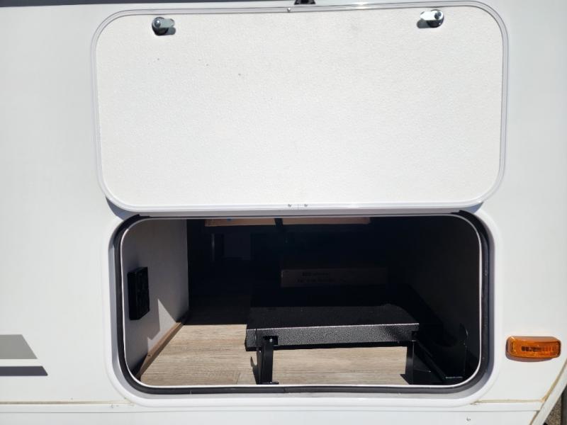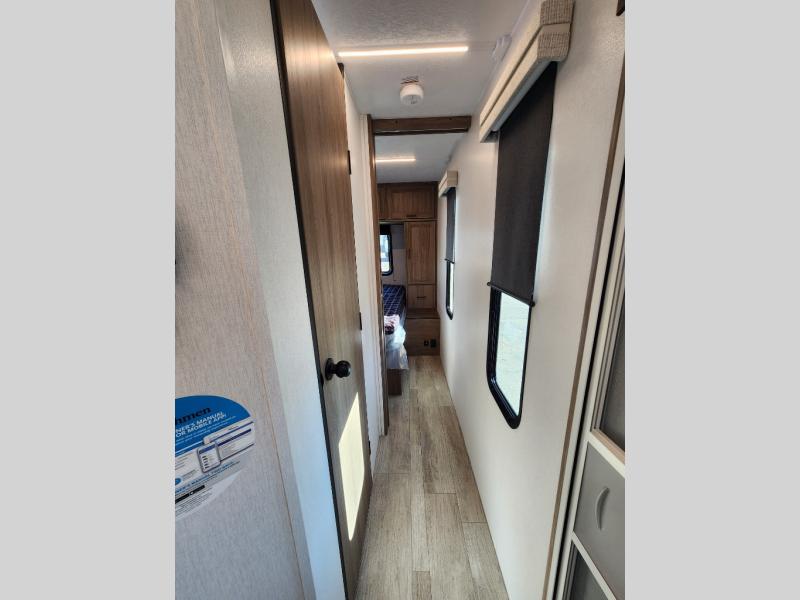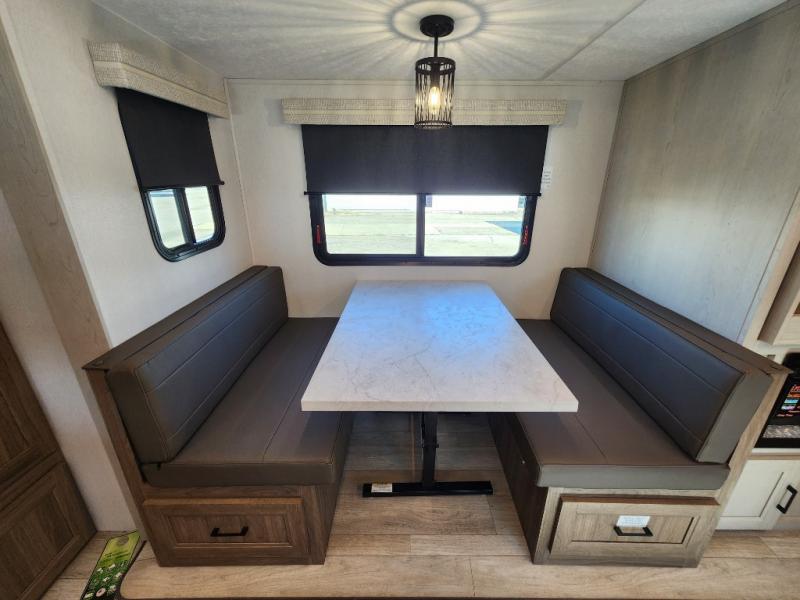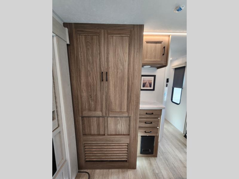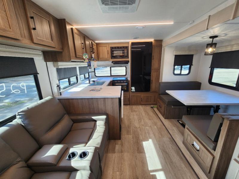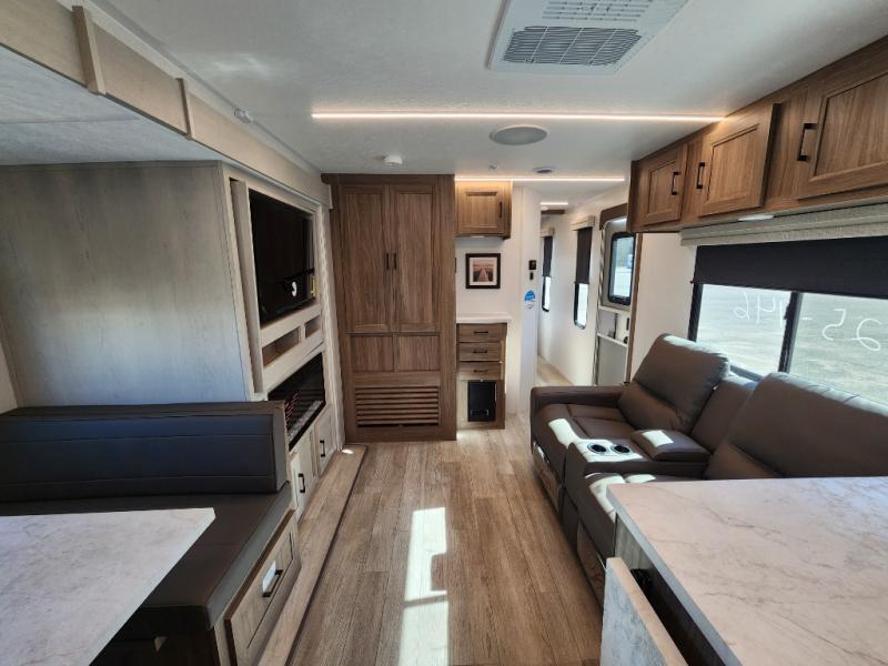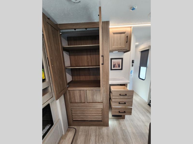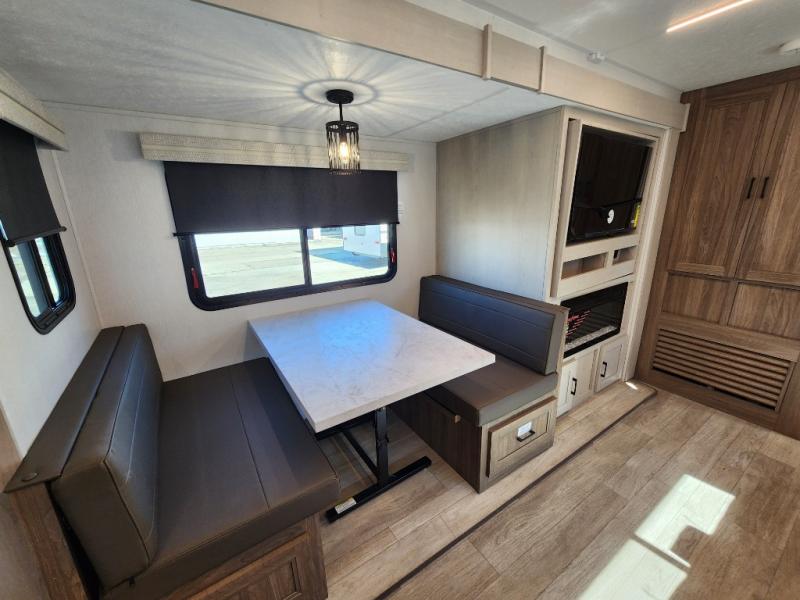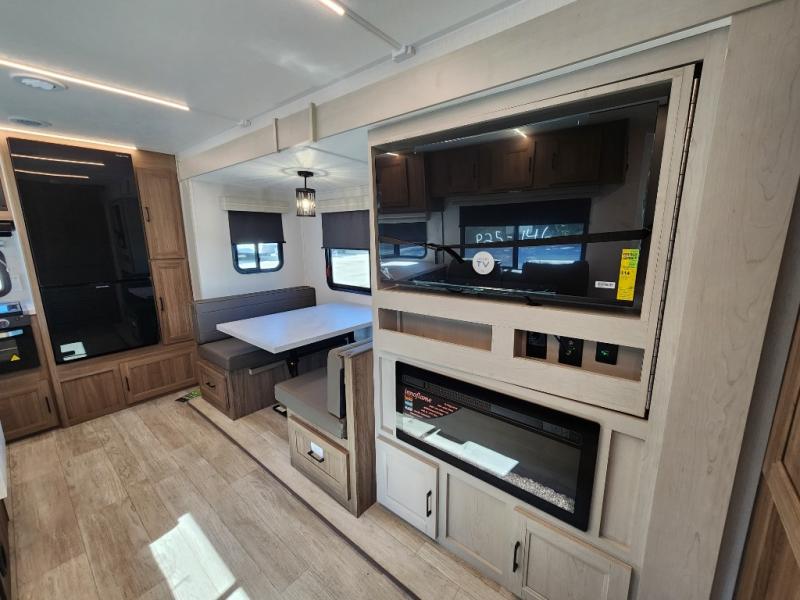 Are you looking for a travel trailer that will feel more like home? Look no further than this model that features a private bedroom up front, a full bath, plus a spacious rear kitchen. You will love to relax on the theatre sofa/hide-a-bed sofa across from the Smart TV and fireplace, and there is a booth dinette for dining. This model also includes a hidden pantry behind the TV for smart storage solutions. If the weather is nice you may just want to sit outdoors under the 18' power awning with LED lights. The chef of your group can prepare a meal on the pull-out camp kitchen, and the kids can grab their scooters from the pass-through storage.