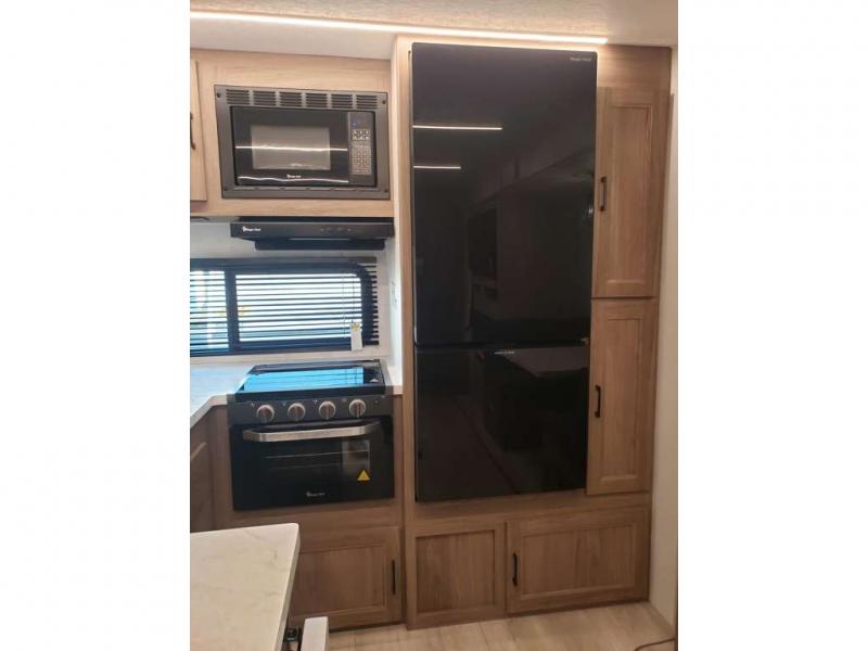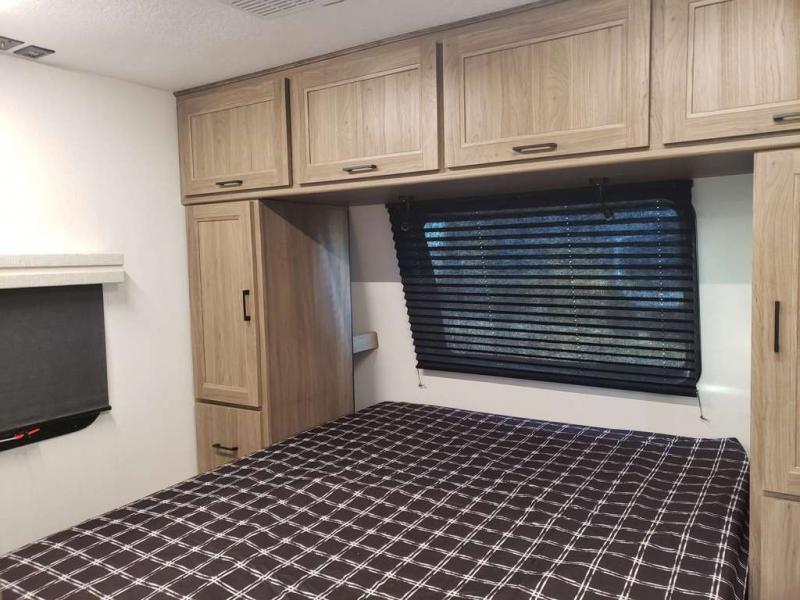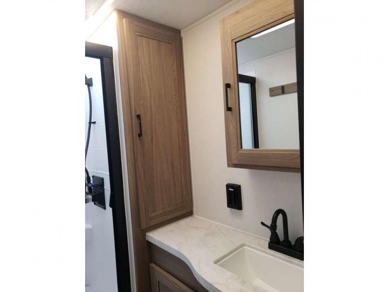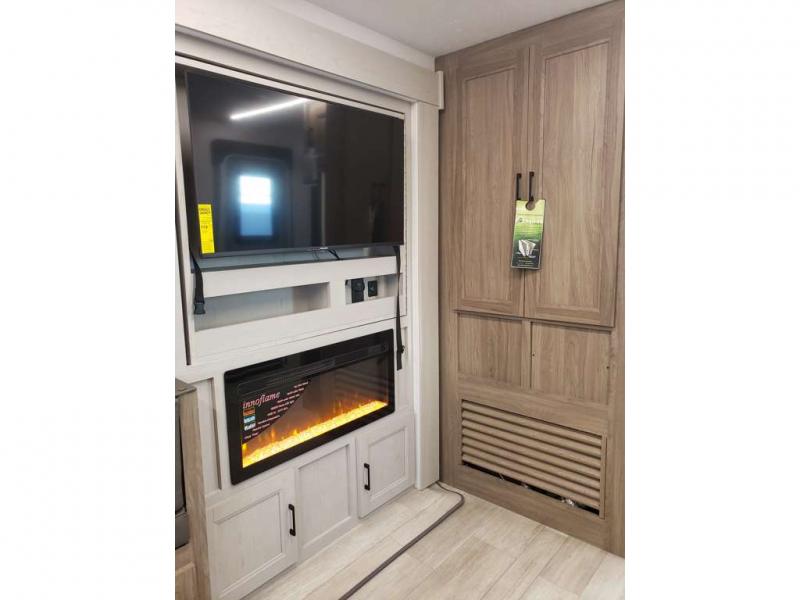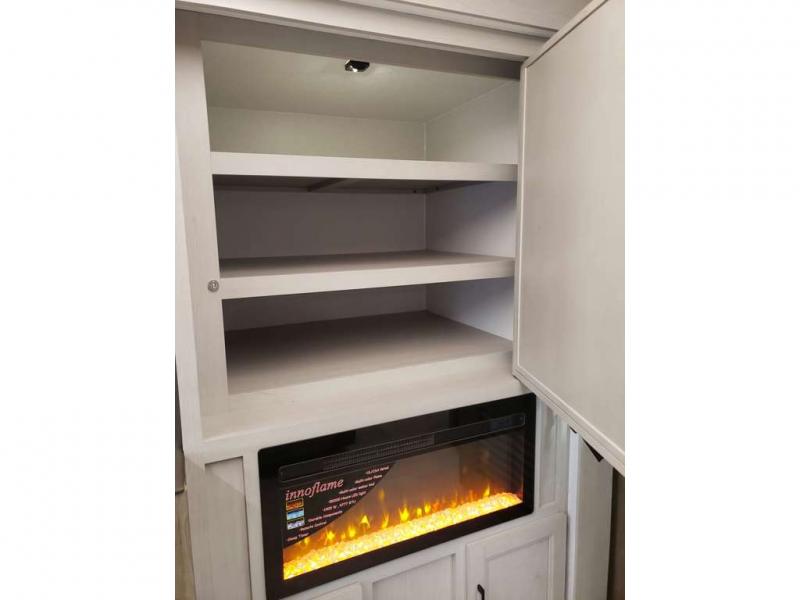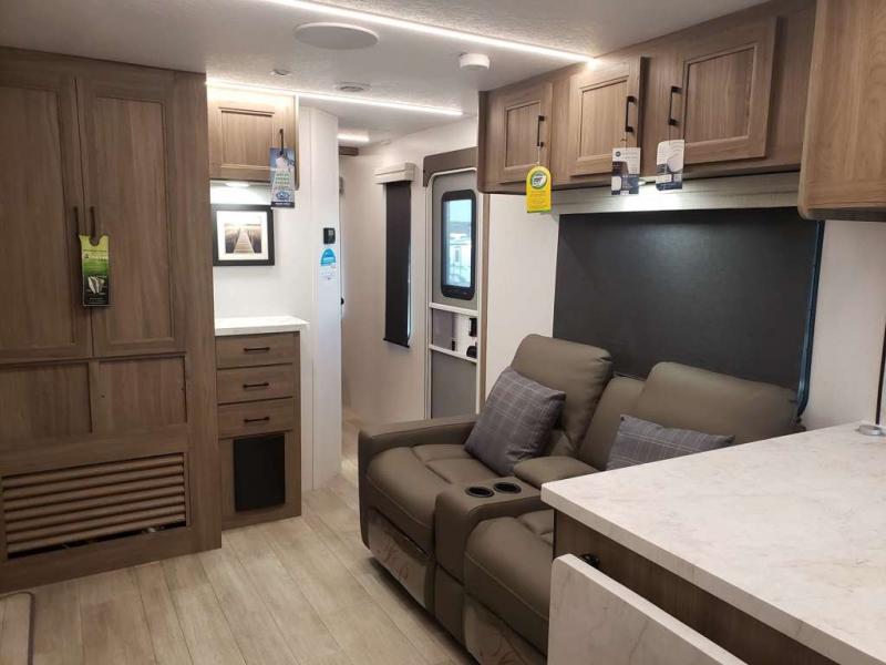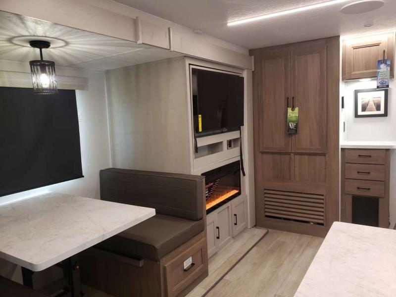 Are you looking for a travel trailer that will feel more like home? Look no further than this model that features a private bedroom up front, a full bath, plus a spacious rear kitchen. You will love to relax on the theatre sofa/hide-a-bed sofa across from the Smart TV and fireplace, and there is a booth dinette for dining. This model also includes a hidden pantry behind the TV for smart storage solutions. If the weather is nice you may just want to sit outdoors under the 18' power awning with LED lights. The chef of your group can prepare a meal on the pull-out camp kitchen, and the kids can grab their scooters from the pass-through storage.
