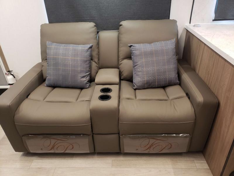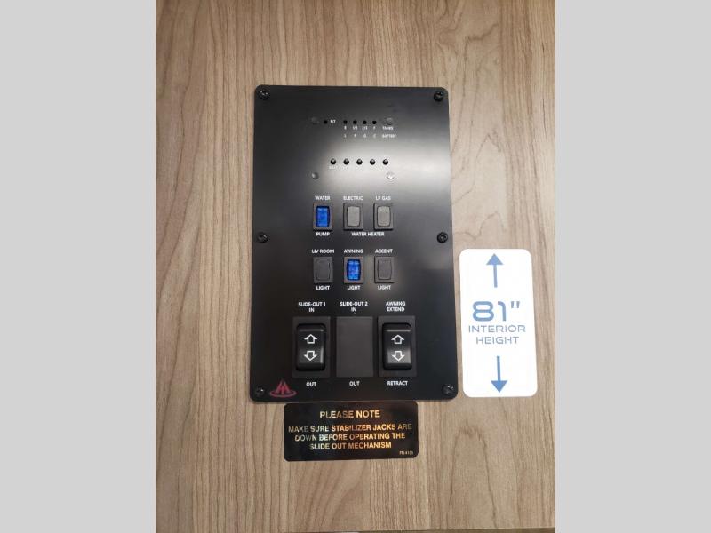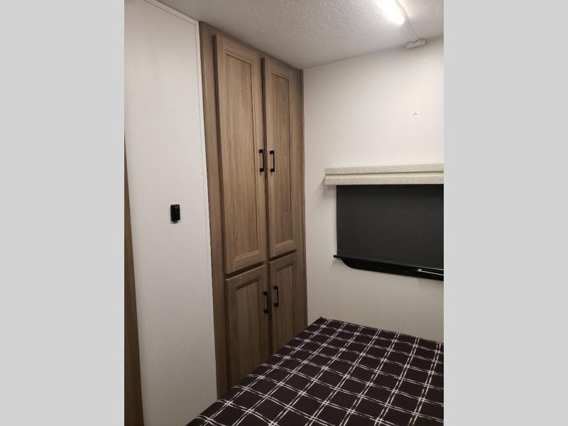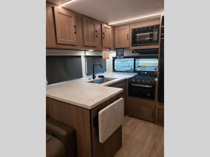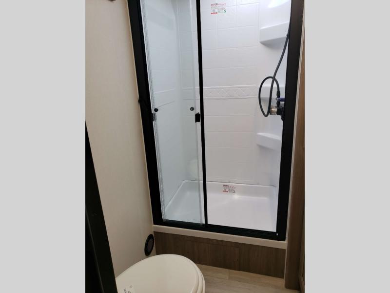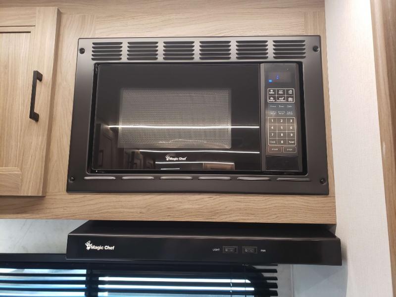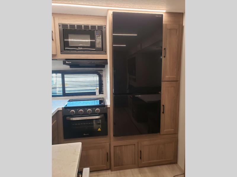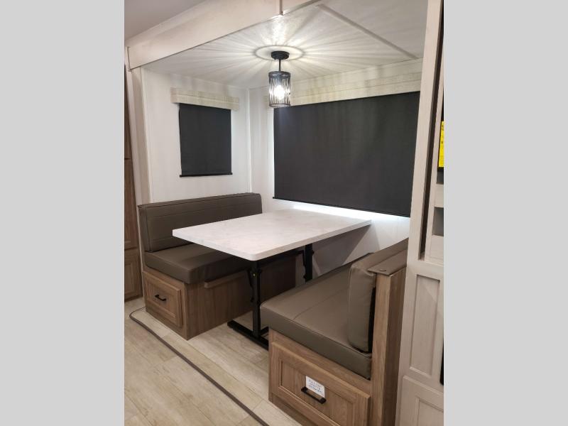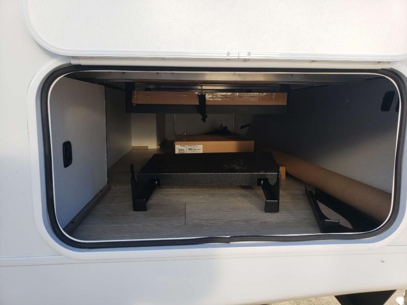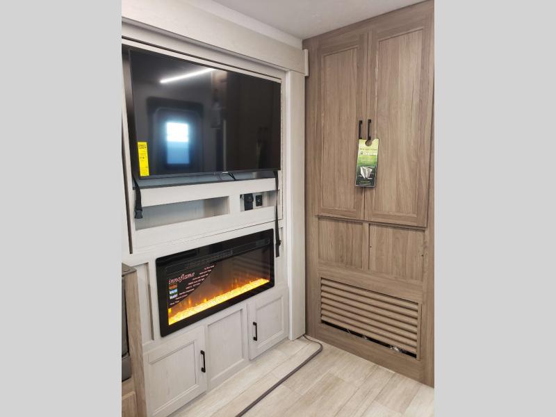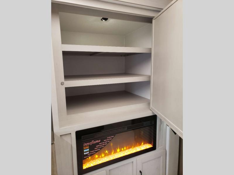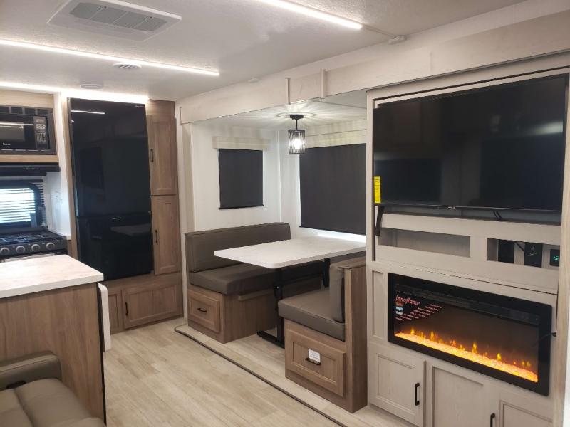 Are you looking for a travel trailer that will feel more like home? Look no further than this model that features a private bedroom up front, a full bath, plus a spacious rear kitchen. You will love to relax on the theatre sofa/hide-a-bed sofa across from the Smart TV and fireplace, and there is a booth dinette for dining. This model also includes a hidden pantry behind the TV for smart storage solutions. If the weather is nice you may just want to sit outdoors under the 18' power awning with LED lights. The chef of your group can prepare a meal on the pull-out camp kitchen, and the kids can grab their scooters from the pass-through storage.