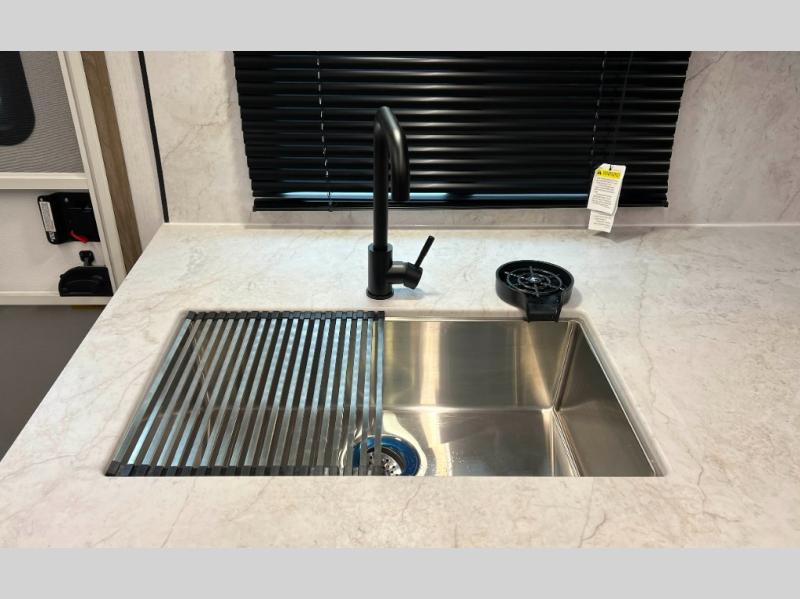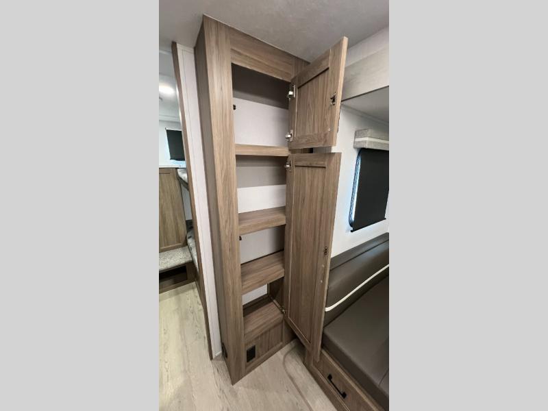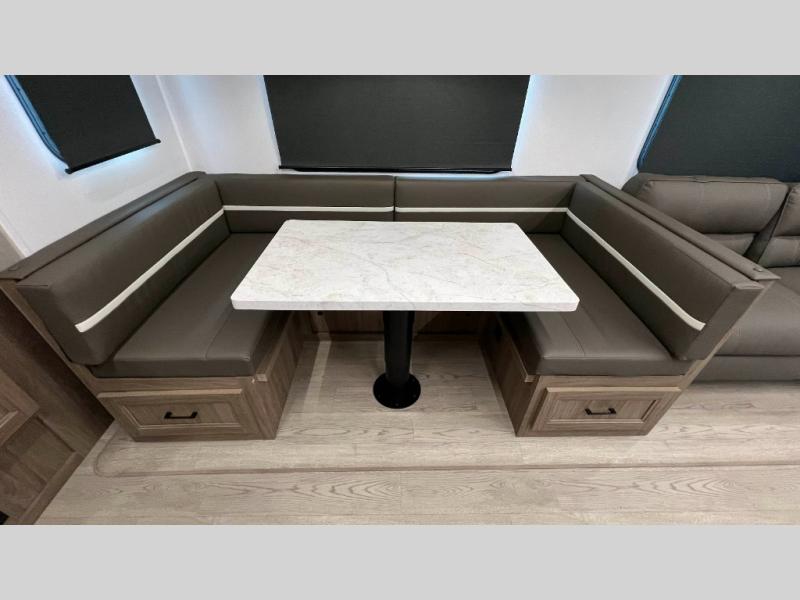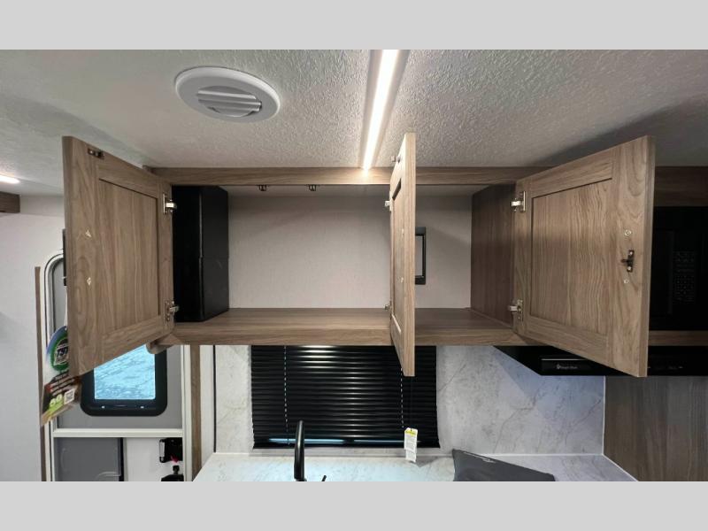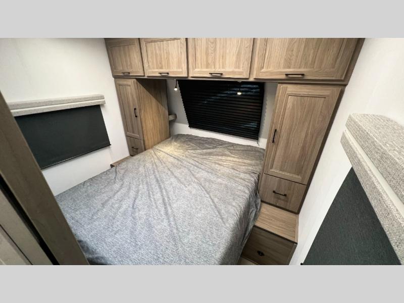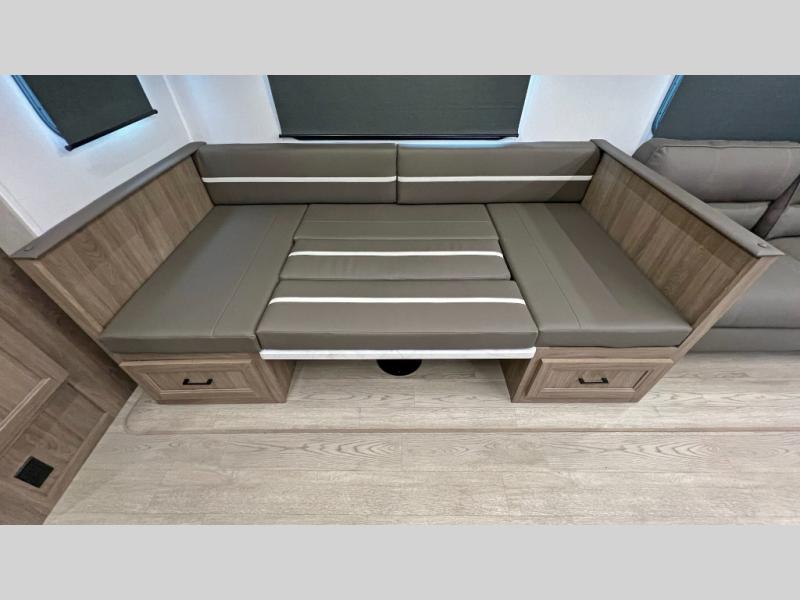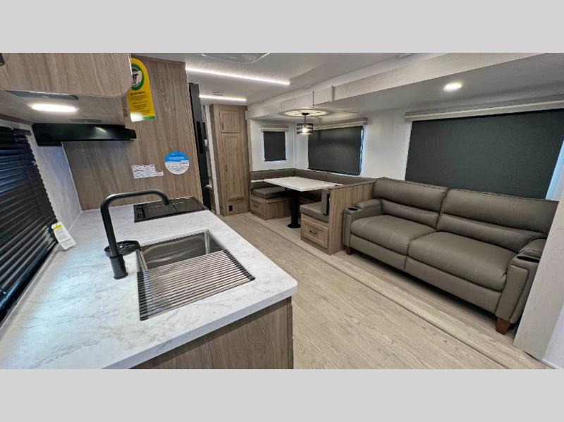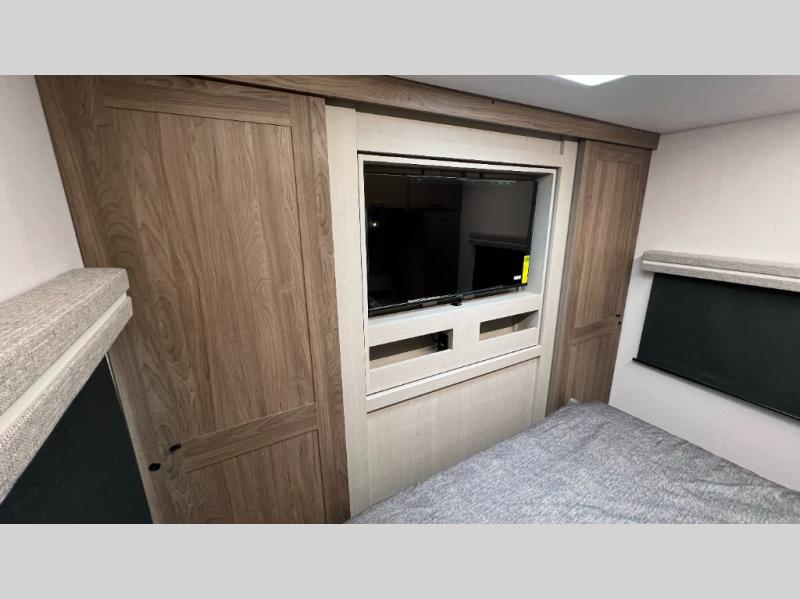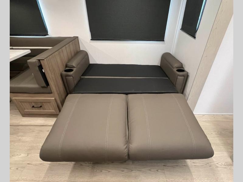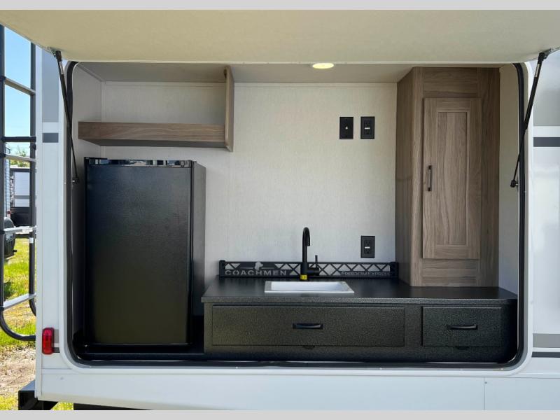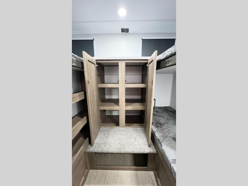 Camping trips with friends and family will be enjoyable in this spacious travel trailer. Your guests will love the rear private bunkhouse with triple bunks and a wardrobe with a countertop to set their things on. The front private bedroom includes a queen bed with vaulted underbed storage to store all your belongings, plus there are wardrobes on either side of the bed and sliding doors to the bedroom so you both can easily get in. The main living area will be a favorite hangout spot with its U-shaped dinette and hide-a-bed sofa within the large slide out, and there is a Smart TV here to make this space feel more like home. The chef of your group will not only have a full interior kitchen, but also a full outdoor camp kitchen; how convenient!
