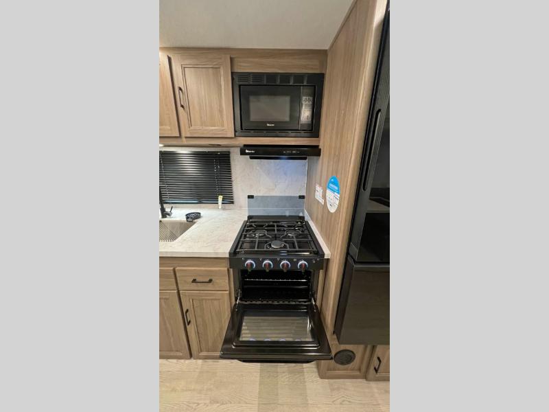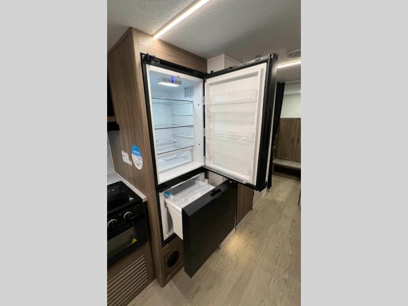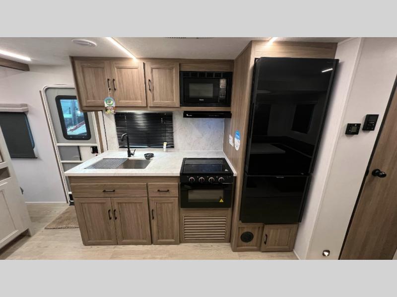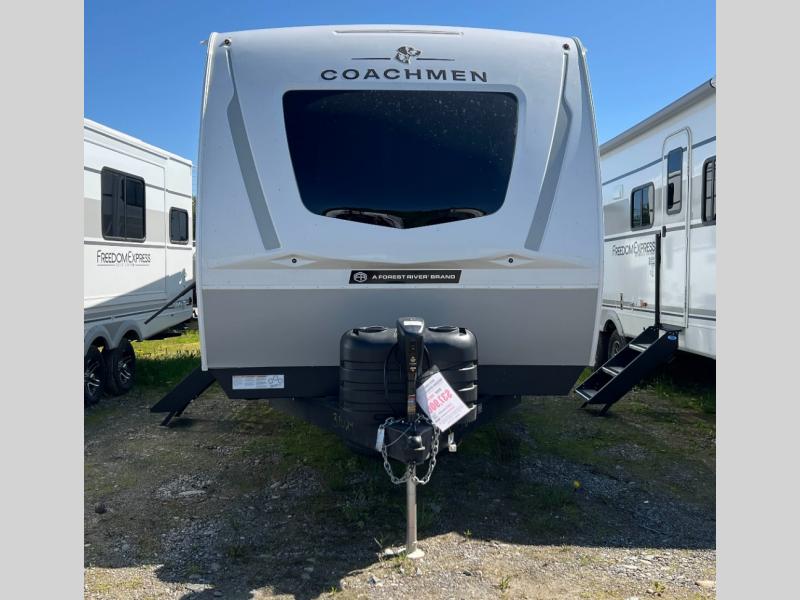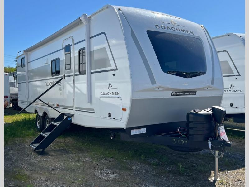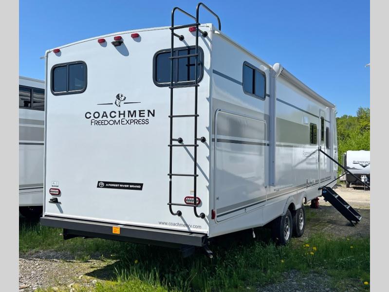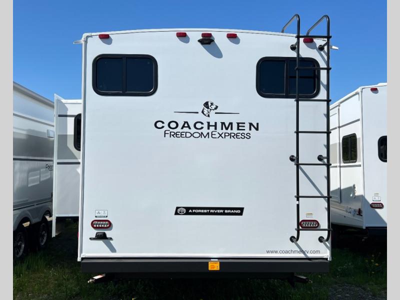 With any Freedom Express Ultra Lite travel trailer by Coachmen you will appreciate quality construction materials, such as vacuum bonded walls with Azdel composite, a 3/4 gel coated fiberglass cap with an automotive glass windshield, and a heated enclosed underbelly. Each model also features Tufflex PVC roofing, front rock guard, and E-Z Lube axles for smooth towing. Inside, you'll find kitchen backsplash, hidden hinge cabinetry, and wear-resistant vinyl flooring throughout. The power tongue jack included with the Ultra Lite Express Package will make set-up a breeze, and each model includes back-up camera prep and they are Freedom solar ready if you plan to go off-grid. Enjoy lightweight camping with a Freedom Express Ultra Lite travel trailer today!