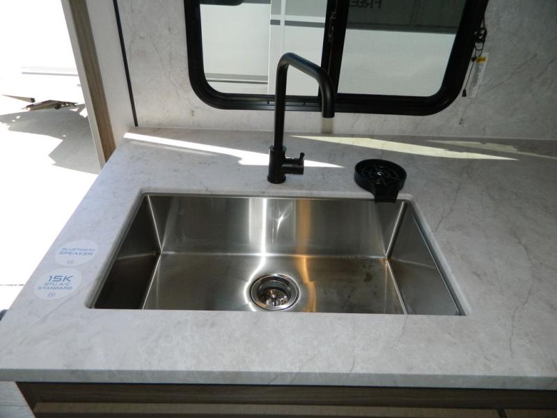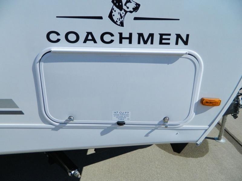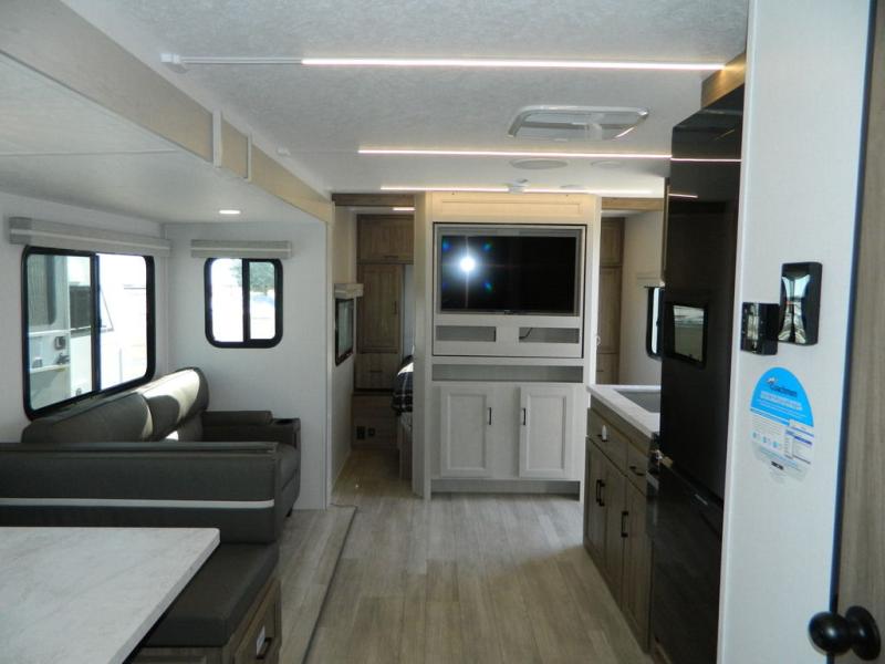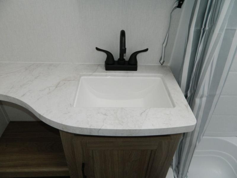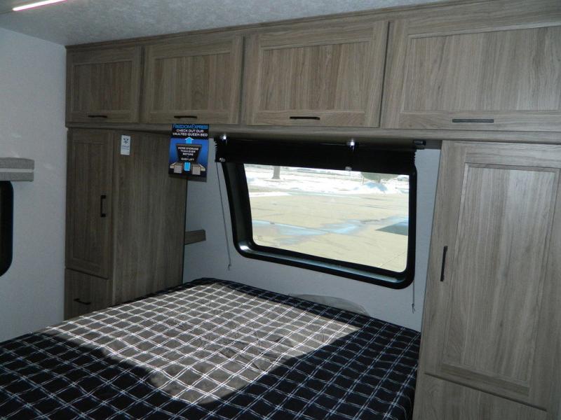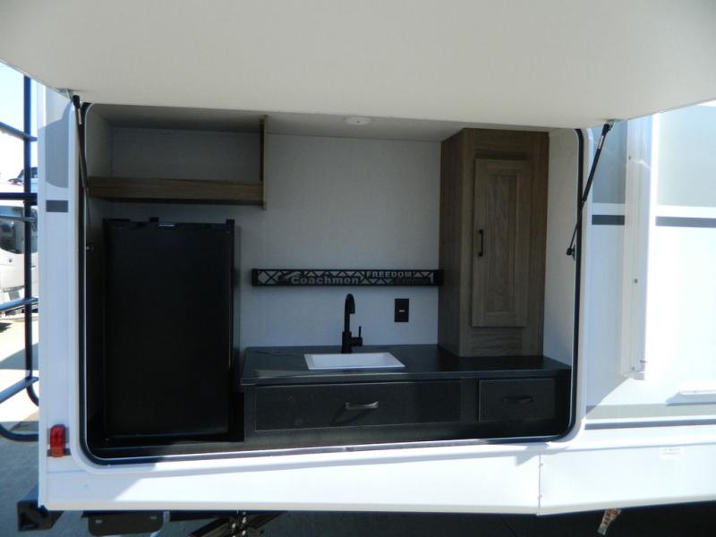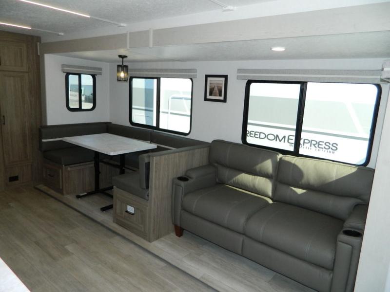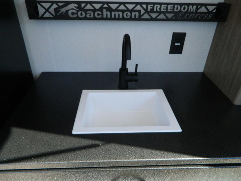 With any Freedom Express Ultra Lite travel trailer by Coachmen you will appreciate quality construction materials, such as vacuum bonded walls with Azdel composite, a 3/4 gel coated fiberglass cap with an automotive glass windshield, and a heated enclosed underbelly. Each model also features Tufflex PVC roofing, front rock guard, and E-Z Lube axles for smooth towing. Inside, you'll find kitchen backsplash, hidden hinge cabinetry, and wear-resistant vinyl flooring throughout. The power tongue jack included with the Ultra Lite Express Package will make set-up a breeze, and each model includes back-up camera prep and they are Freedom solar ready if you plan to go off-grid. Enjoy lightweight camping with a Freedom Express Ultra Lite travel trailer today!