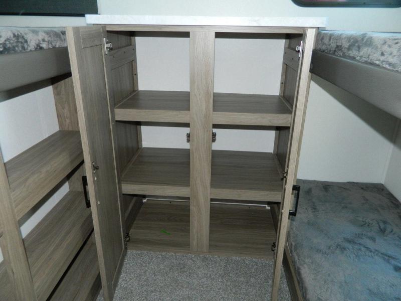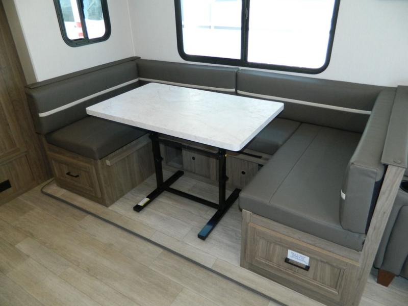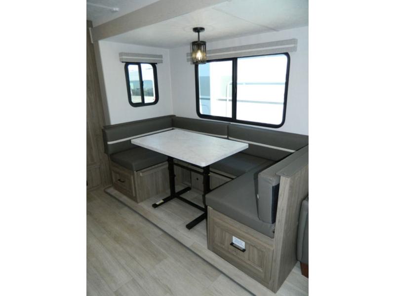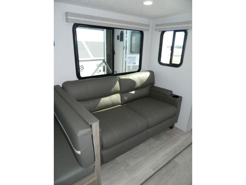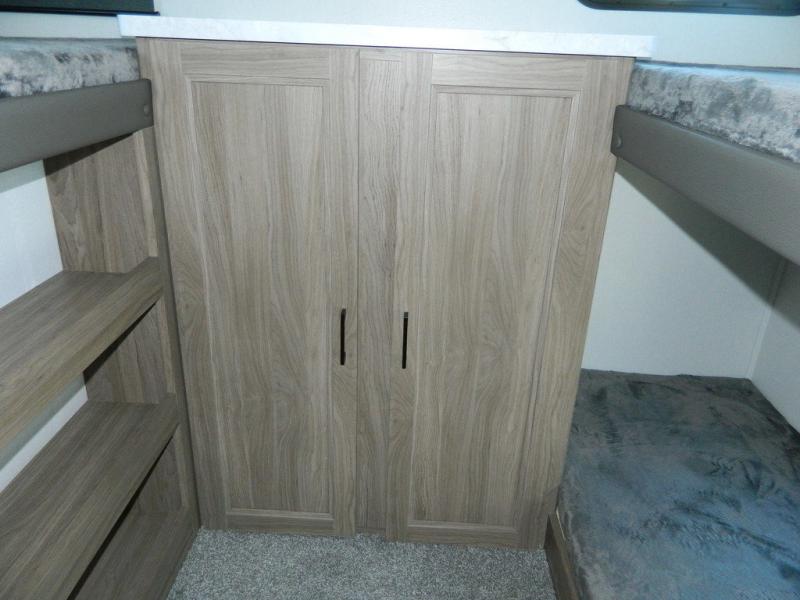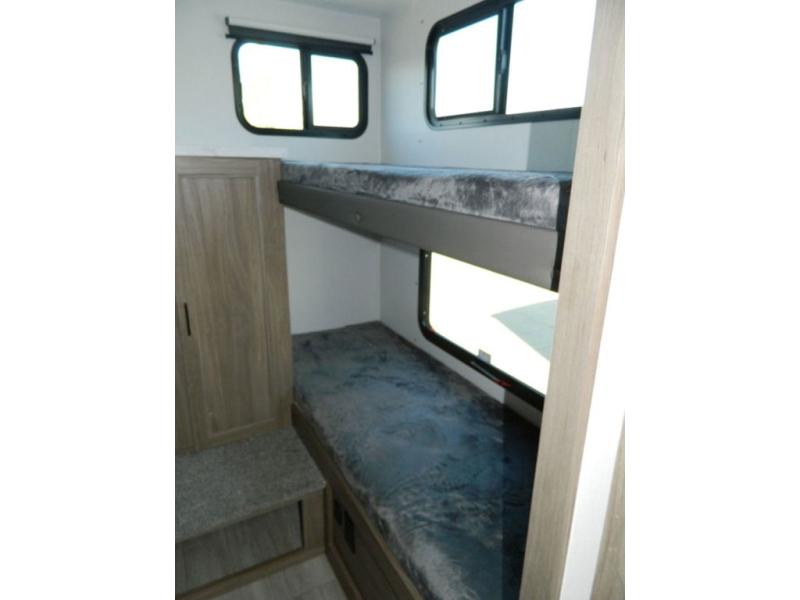 Camping trips with friends and family will be enjoyable in this spacious travel trailer. Your guests will love the rear private bunkhouse with triple bunks and a wardrobe with a countertop to set their things on. The front private bedroom includes a queen bed with vaulted underbed storage to store all your belongings, plus there are wardrobes on either side of the bed and sliding doors to the bedroom so you both can easily get in. The main living area will be a favorite hangout spot with its U-shaped dinette and hide-a-bed sofa within the large slide out, and there is a fireplace and Smart TV here to make this space feel more like home. The chef of your group will not only have a full interior kitchen, but also a full outdoor camp kitchen; how convenient!
