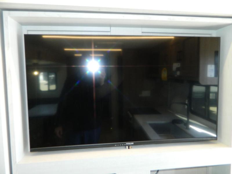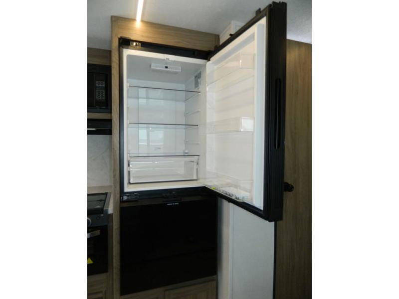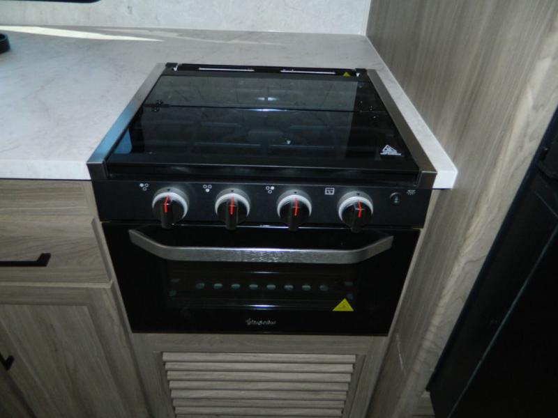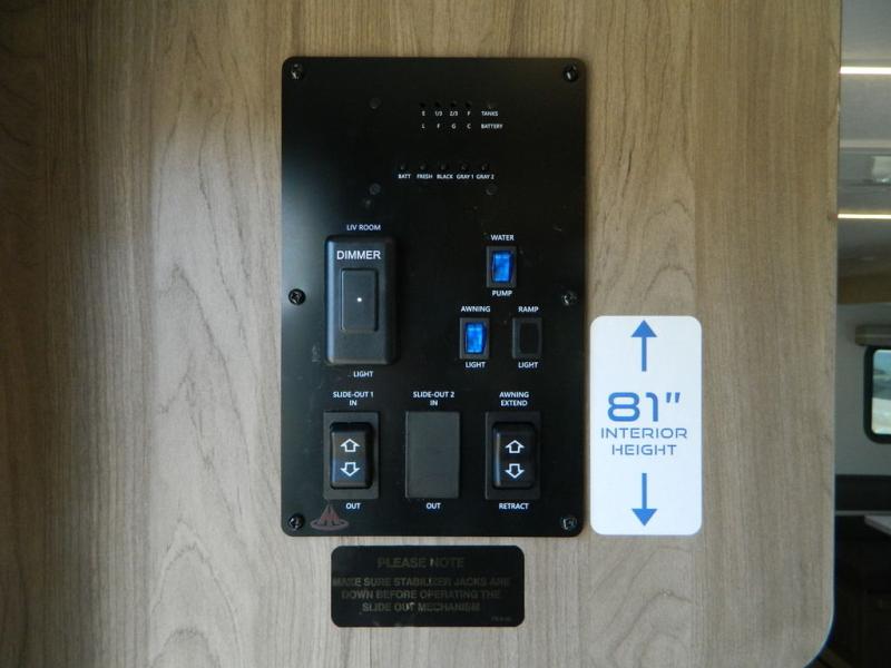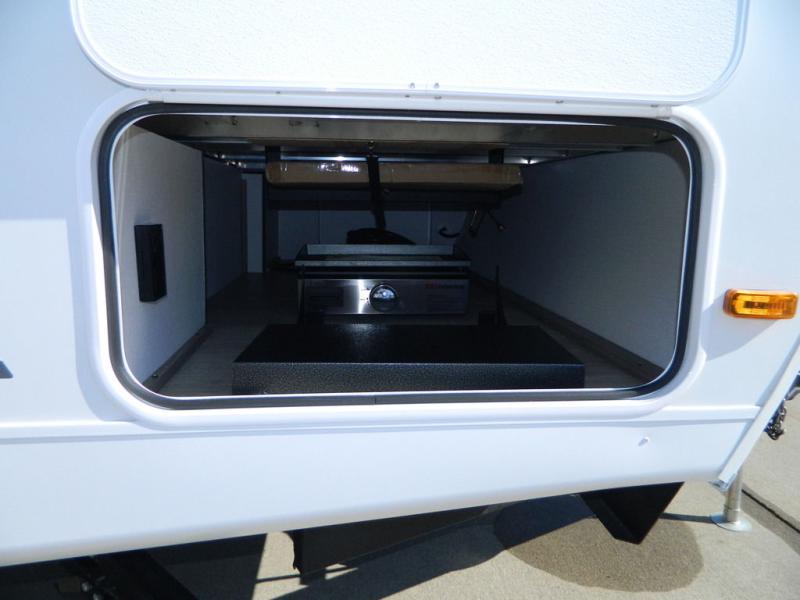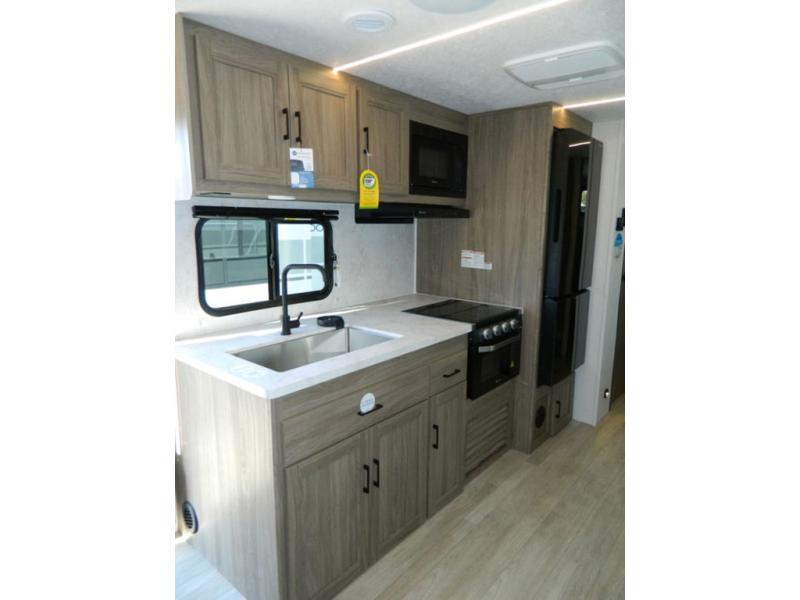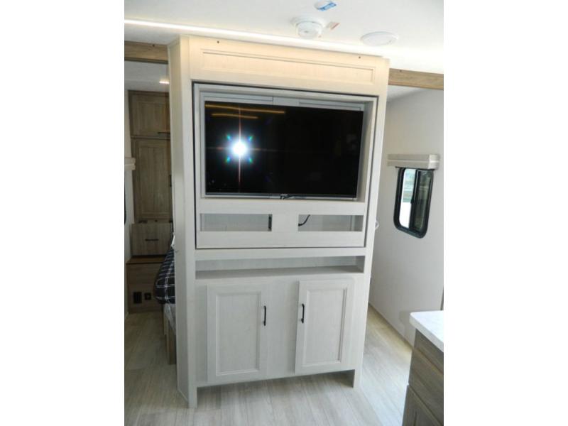 Camping trips with friends and family will be enjoyable in this spacious travel trailer. Your guests will love the rear private bunkhouse with triple bunks and a wardrobe with a countertop to set their things on. The front private bedroom includes a queen bed with vaulted underbed storage to store all your belongings, plus there are wardrobes on either side of the bed and sliding doors to the bedroom so you both can easily get in. The main living area will be a favorite hangout spot with its U-shaped dinette and hide-a-bed sofa within the large slide out, and there is a fireplace and Smart TV here to make this space feel more like home. The chef of your group will not only have a full interior kitchen, but also a full outdoor camp kitchen; how convenient!