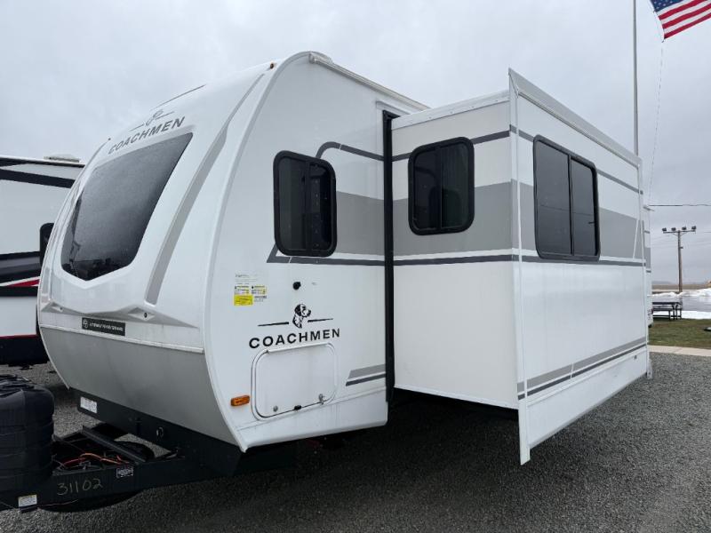 With any Freedom Express Ultra Lite travel trailer by Coachmen you will appreciate quality construction materials, such as vacuum bonded walls with Azdel composite, a 3/4 gel coated fiberglass cap with an automotive glass windshield, and a heated enclosed underbelly. Each model also features Tufflex PVC roofing, front rock guard, and E-Z Lube axles for smooth towing. Inside, you'll find kitchen backsplash, hidden hinge cabinetry, and wear-resistant vinyl flooring throughout. The power tongue jack included with the Ultra Lite Express Package will make set-up a breeze, and each model includes back-up camera prep and they are Freedom solar ready if you plan to go off-grid. Enjoy lightweight camping with a Freedom Express Ultra Lite travel trailer today!