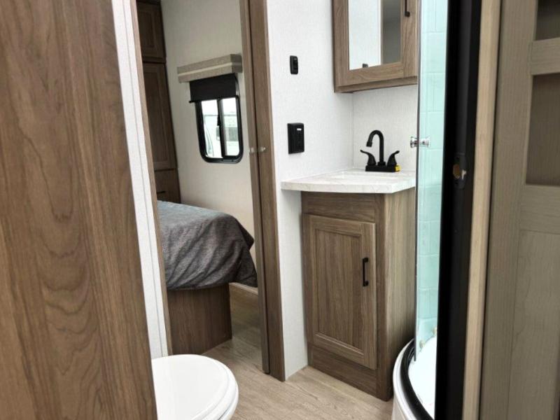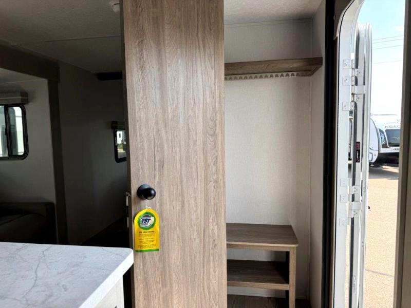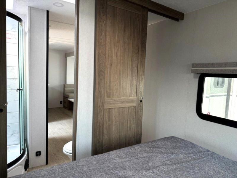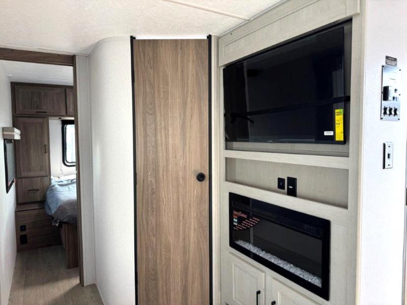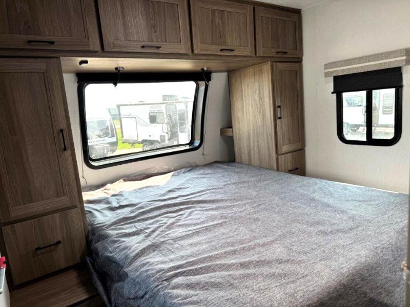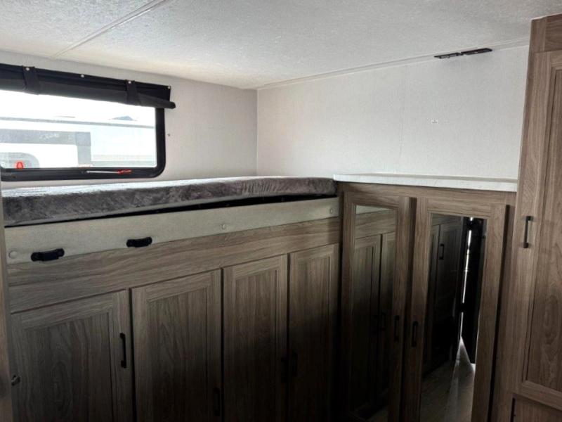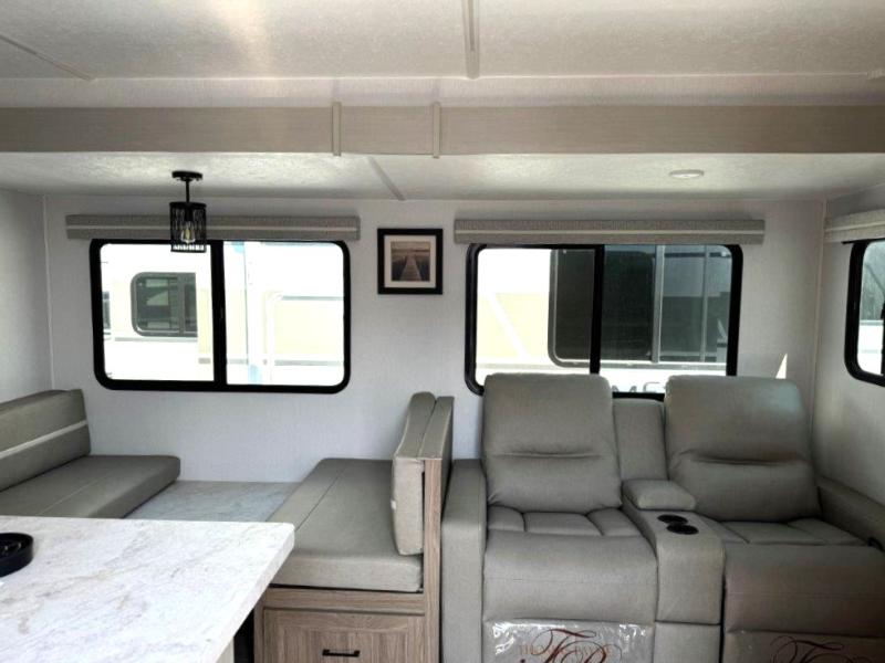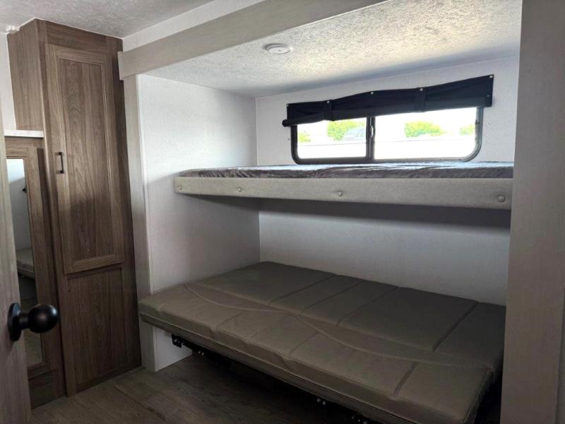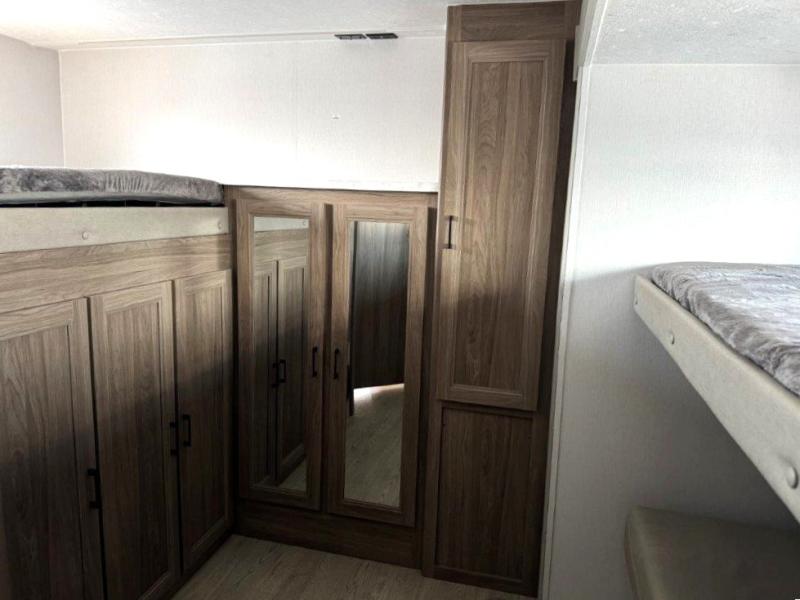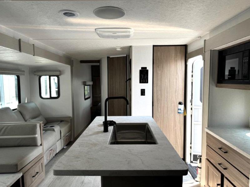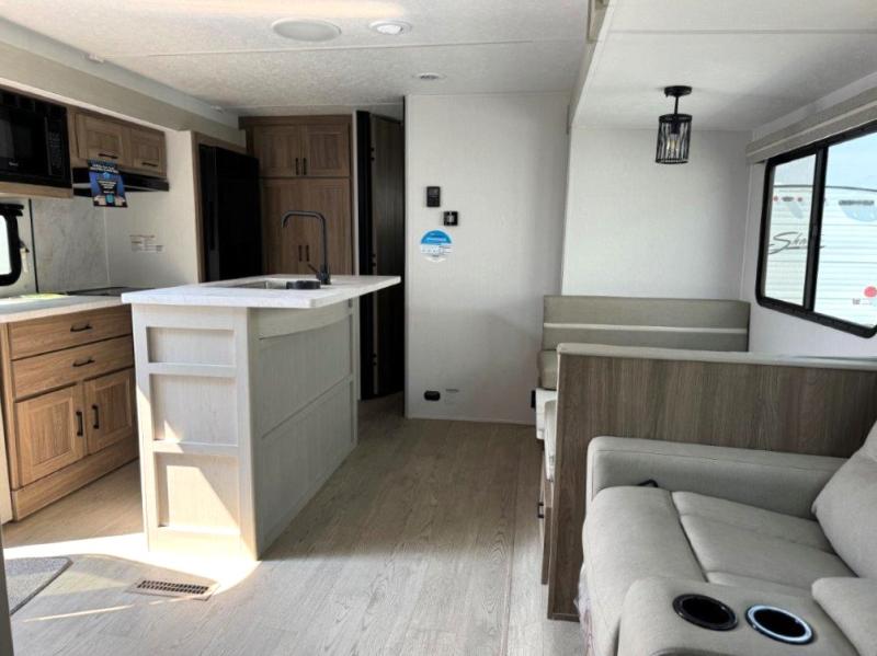 It won't be hard to find comfort and convenience in this travel trailer for eight. Once you've checked in at your campsite, grab your gear from the pass-through storage, put out the 20' awning, then start lunch on the full camp kitchen! If you'd rather cook inside, you'll find a three burner range and a microwave oven to cook meals, along with an 8 cu. ft. double door refrigerator and pantry for food storage, plus a kitchen island for more prep space! The booth dinette provides a place to dine or play games, and the hide-a-bed sofa can be switched out for an optional theater seat if you don't need the additional sleeping space. A stand-out feature on this model is the rear private bunkhouse with a flip-up bunk and roll-over sofa within a slide out, a second bunk across the room, a wardrobe with space for a TV, plus a second wardrobe for storage. And don't overlook the dual entry bath that leads to the front master bedroom, complete with a queen bed with underbed storage and dual wardrobes!