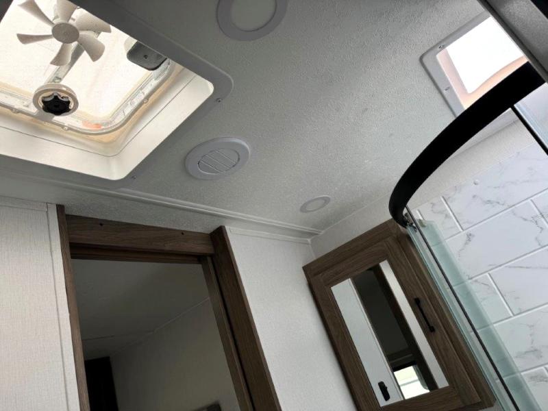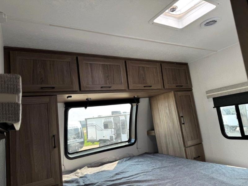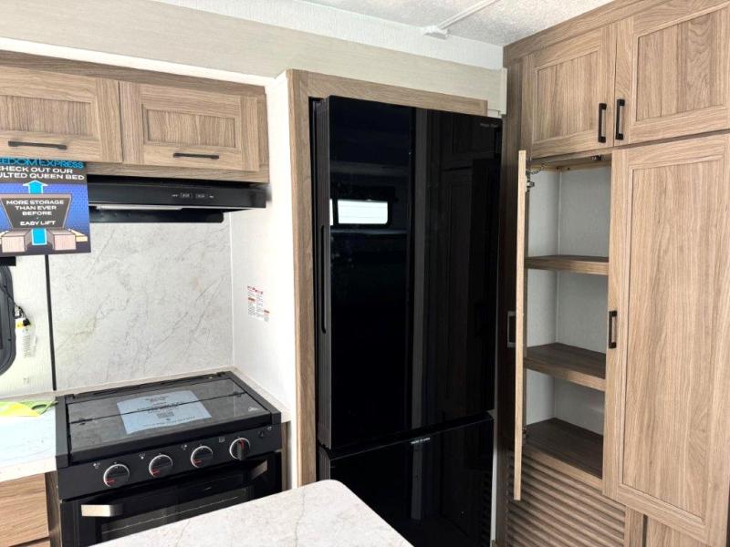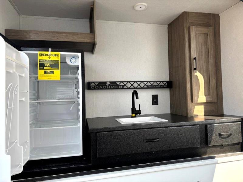 With any Freedom Express Ultra Lite travel trailer by Coachmen you will appreciate quality construction materials, such as vacuum bonded walls with Azdel composite, a 3/4 gel coated fiberglass cap with an automotive glass windshield, and a heated enclosed underbelly. Each model also features Tufflex PVC roofing, front rock guard, and E-Z Lube axles for smooth towing. Inside, you'll find kitchen backsplash, hidden hinge cabinetry, and wear-resistant vinyl flooring throughout. The power tongue jack included with the Ultra Lite Express Package will make set-up a breeze, and each model includes back-up camera prep and they are Freedom solar ready if you plan to go off-grid. Enjoy lightweight camping with a Freedom Express Ultra Lite travel trailer today!