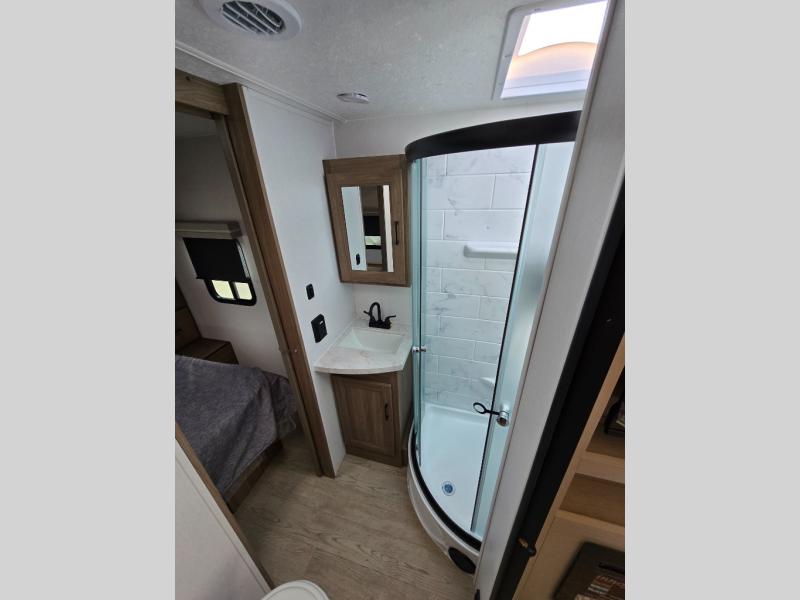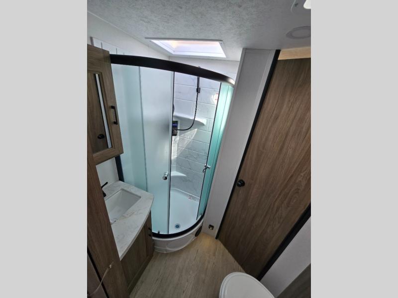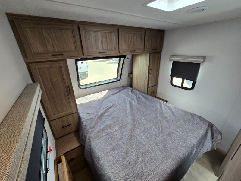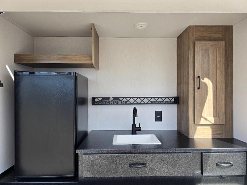 With any Freedom Express Ultra Lite travel trailer by Coachmen you will appreciate quality construction materials, such as vacuum bonded walls with Azdel composite, a 3/4 gel coated fiberglass cap with an automotive glass windshield, and a heated enclosed underbelly. Each model also features Tufflex PVC roofing, front rock guard, and E-Z Lube axles for smooth towing. Inside, you'll find kitchen backsplash, hidden hinge cabinetry, and wear-resistant vinyl flooring throughout. The power tongue jack included with the Ultra Lite Express Package will make set-up a breeze, and each model includes back-up camera prep and they are Freedom solar ready if you plan to go off-grid. Enjoy lightweight camping with a Freedom Express Ultra Lite travel trailer today!