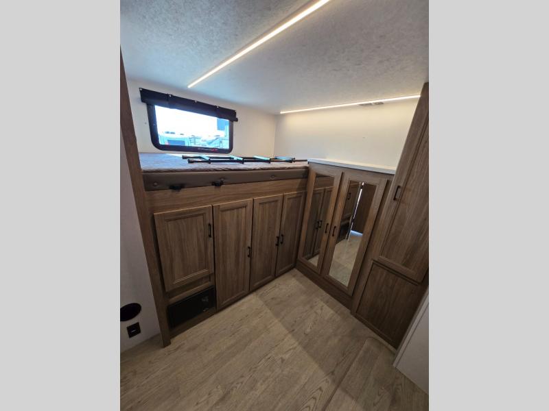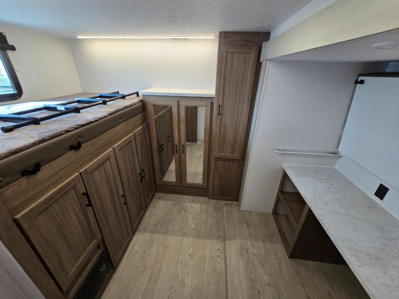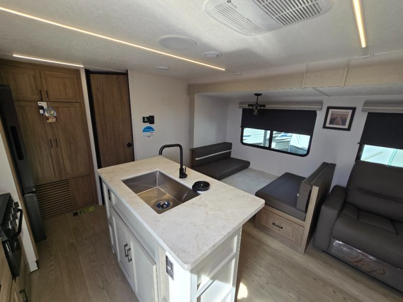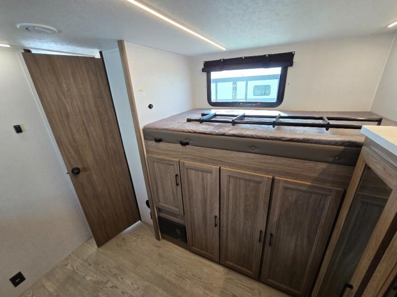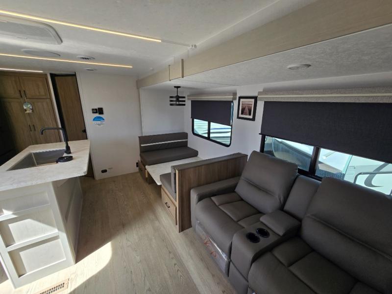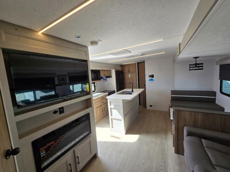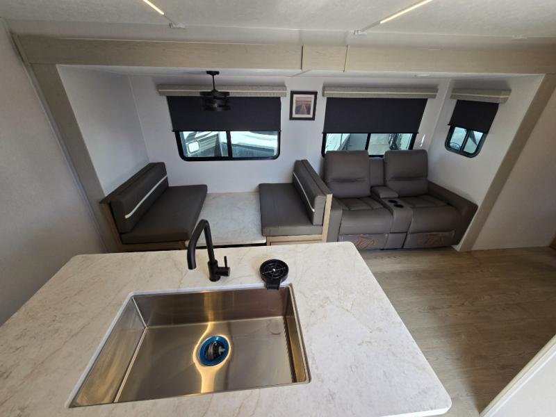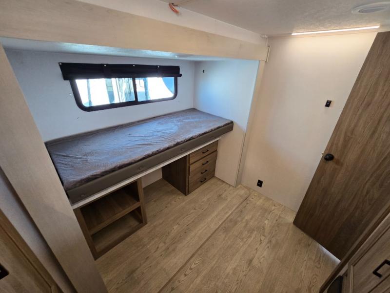 It won't be hard to find comfort and convenience in this travel trailer for eight. Once you've checked in at your campsite, grab your gear from the pass-through storage, put out the 20' awning, then start lunch on the full camp kitchen! If you'd rather cook inside, you'll find a three burner range and a microwave oven to cook meals, along with an 8 cu. ft. double door refrigerator and pantry for food storage, plus a kitchen island for more prep space! The booth dinette provides a place to dine or play games, and the hide-a-bed sofa can be switched out for an optional theater seat if you don't need the additional sleeping space. A stand-out feature on this model is the rear private bunkhouse with a flip-up bunk and roll-over sofa within a slide out, a second bunk across the room, a wardrobe with space for a TV, plus a second wardrobe for storage. And don't overlook the dual entry bath that leads to the front master bedroom, complete with a queen bed with underbed storage and dual wardrobes!