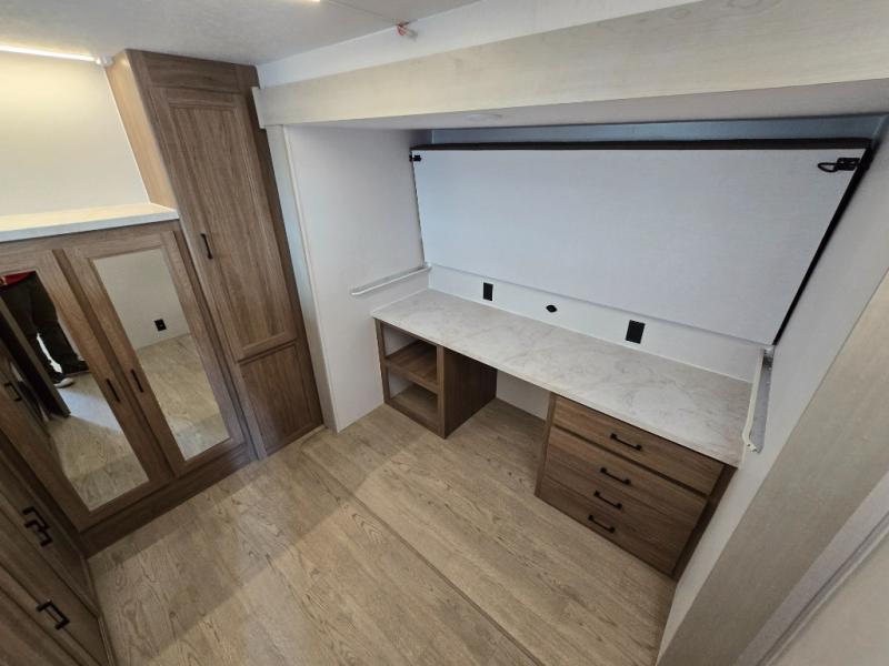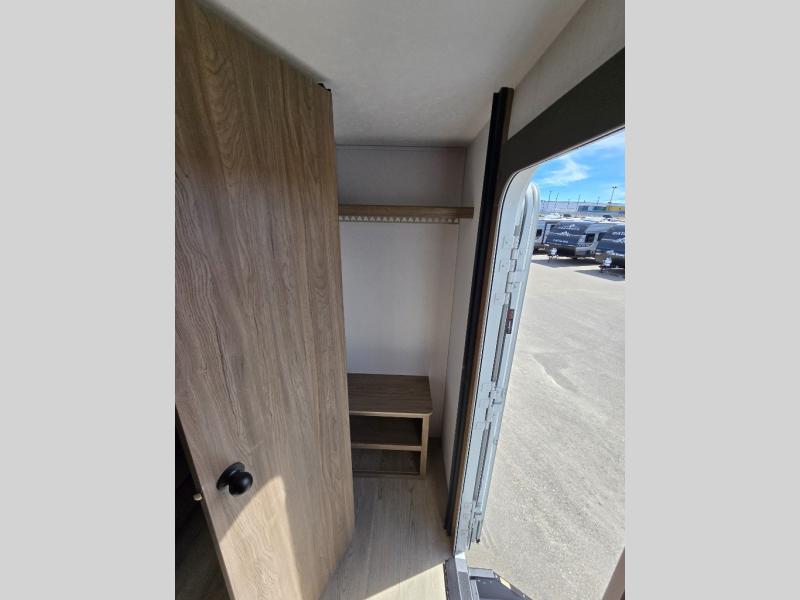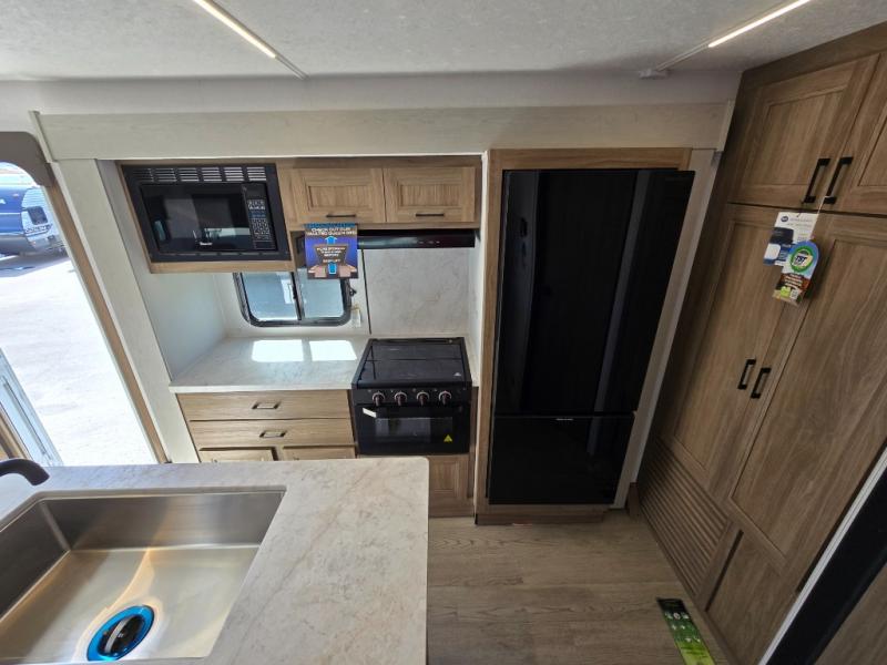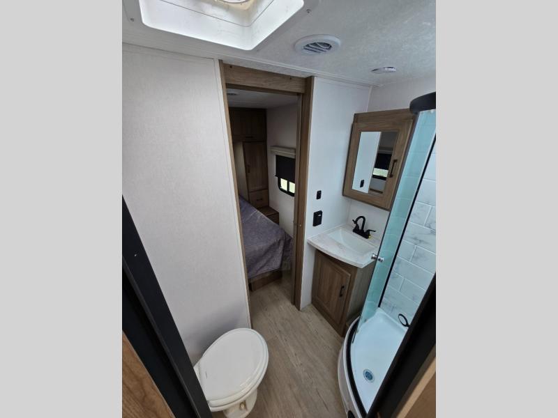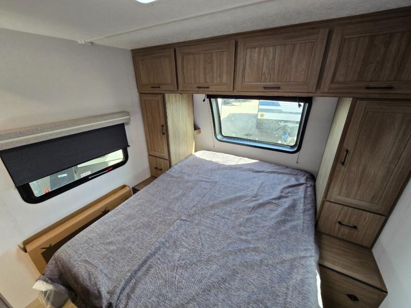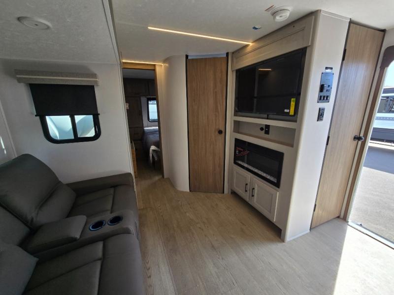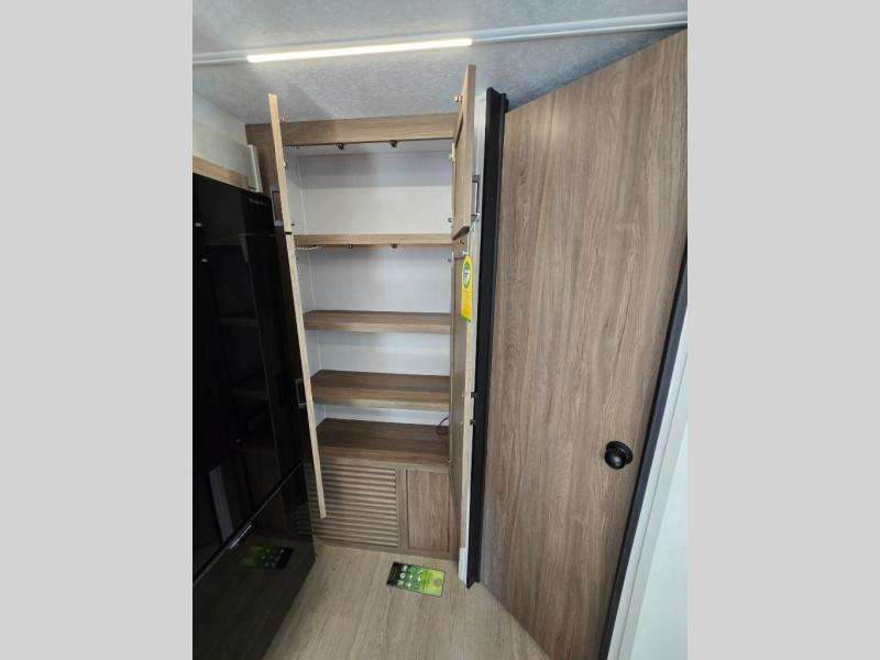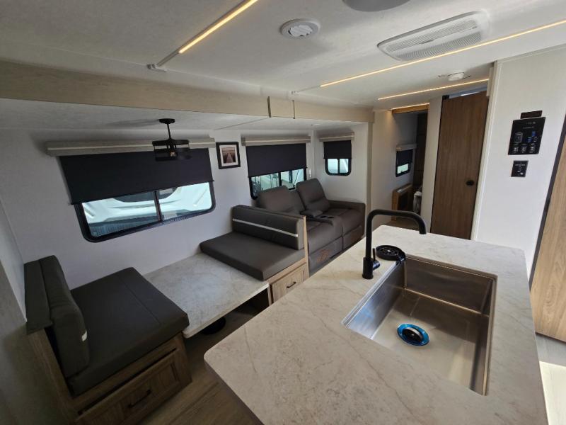 It won't be hard to find comfort and convenience in this travel trailer for eight. Once you've checked in at your campsite, grab your gear from the pass-through storage, put out the 20' awning, then start lunch on the full camp kitchen! If you'd rather cook inside, you'll find a three burner range and a microwave oven to cook meals, along with an 8 cu. ft. double door refrigerator and pantry for food storage, plus a kitchen island for more prep space! The booth dinette provides a place to dine or play games, and the hide-a-bed sofa can be switched out for an optional theater seat if you don't need the additional sleeping space. A stand-out feature on this model is the rear private bunkhouse with a flip-up bunk and roll-over sofa within a slide out, a second bunk across the room, a wardrobe with space for a TV, plus a second wardrobe for storage. And don't overlook the dual entry bath that leads to the front master bedroom, complete with a queen bed with underbed storage and dual wardrobes!