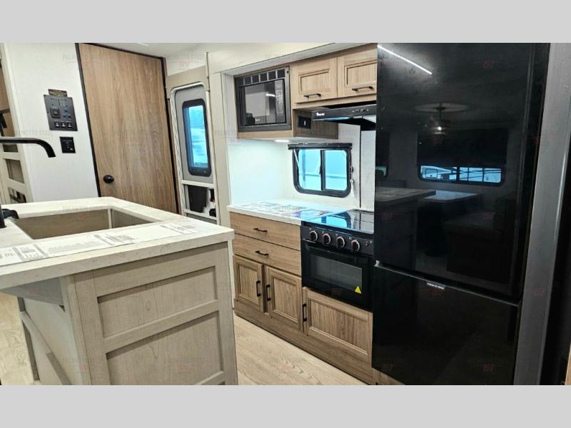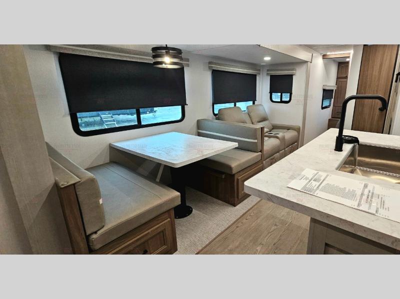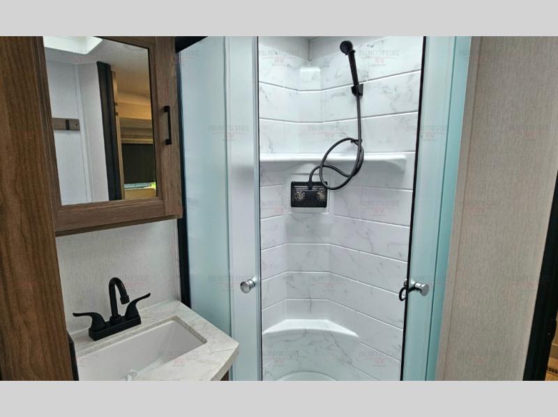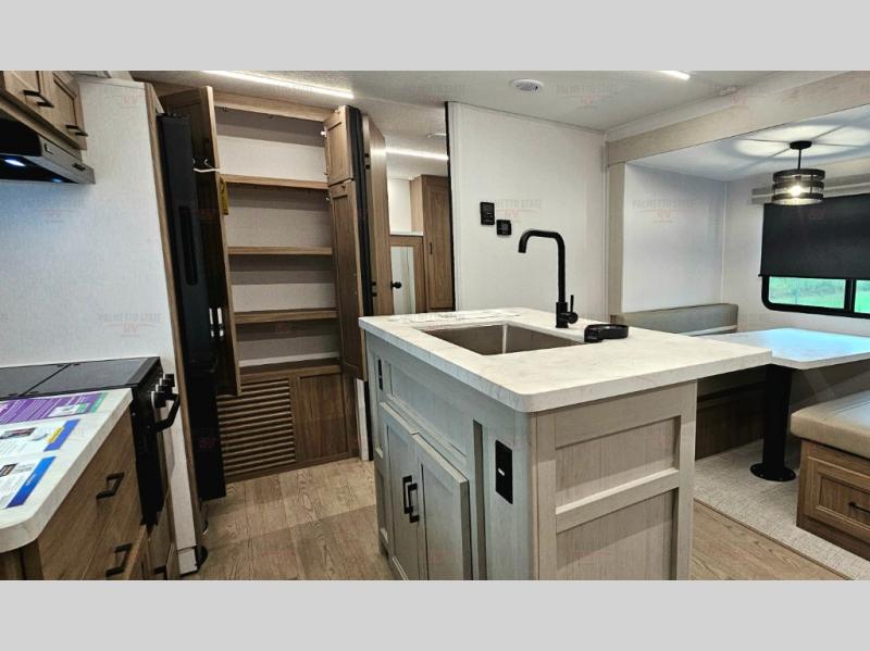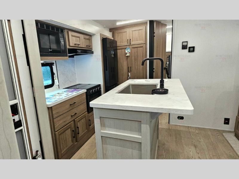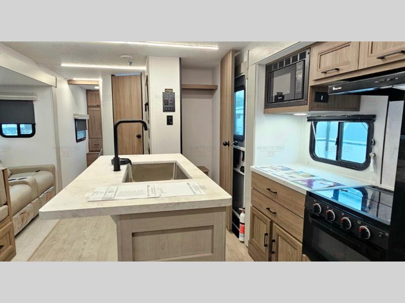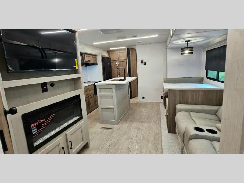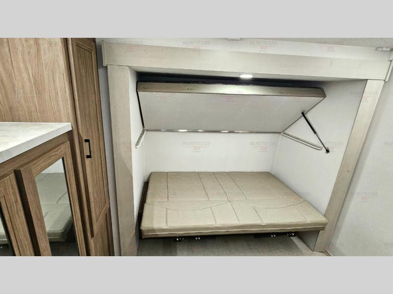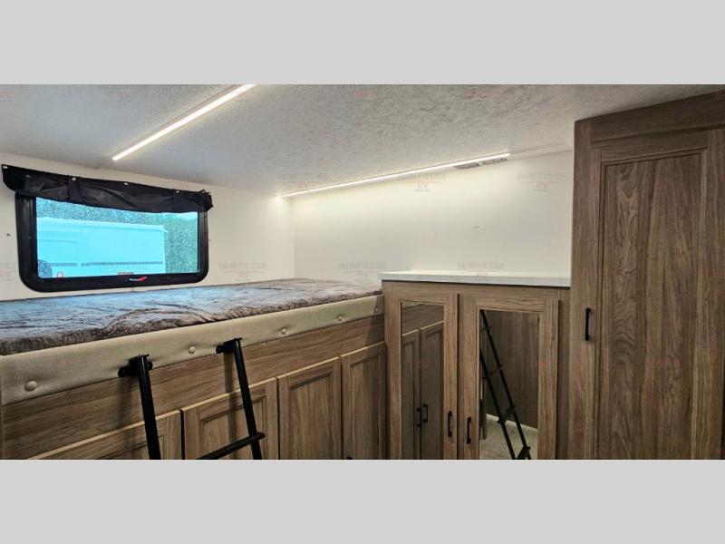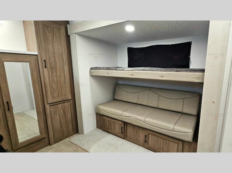 It won't be hard to find comfort and convenience in this travel trailer for eight. Once you've checked in at your campsite, grab your gear from the pass-through storage, put out the 20' awning, then start lunch on the full camp kitchen! If you'd rather cook inside, you'll find a three burner range and a microwave oven to cook meals, along with an 8 cu. ft. double door refrigerator and pantry for food storage, plus a kitchen island for more prep space! The booth dinette provides a place to dine or play games, and the hide-a-bed sofa can be switched out for an optional theater seat if you don't need the additional sleeping space. A stand-out feature on this model is the rear private bunkhouse with a flip-up bunk and roll-over sofa within a slide out, a second bunk across the room, a wardrobe with space for a TV, plus a second wardrobe for storage. And don't overlook the dual entry bath that leads to the front master bedroom, complete with a queen bed with underbed storage and dual wardrobes!