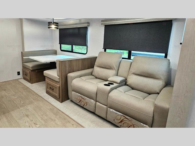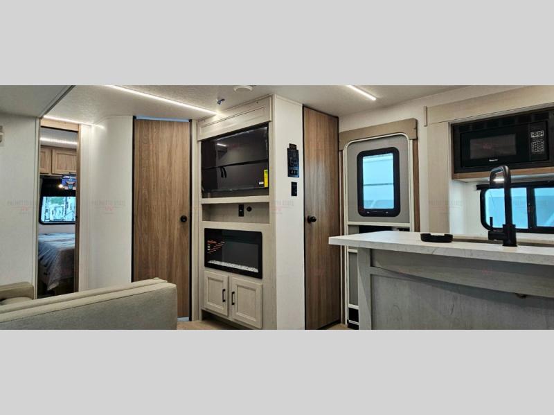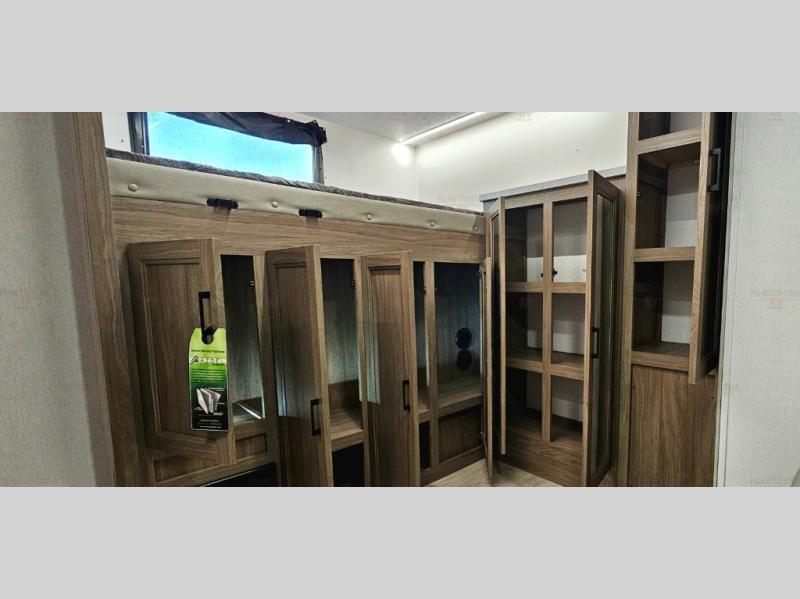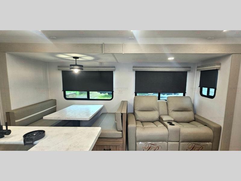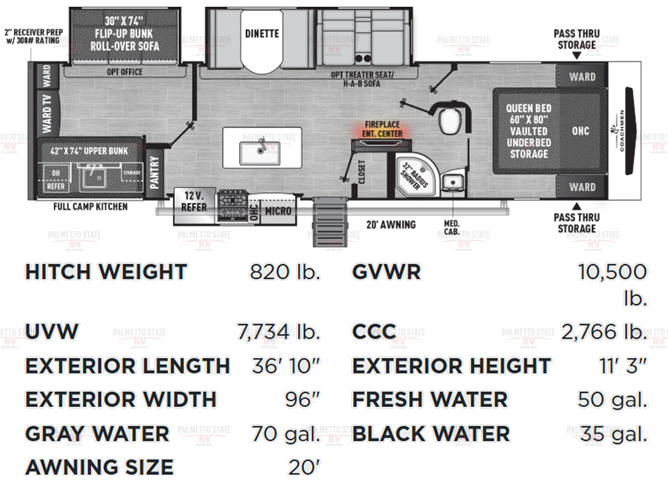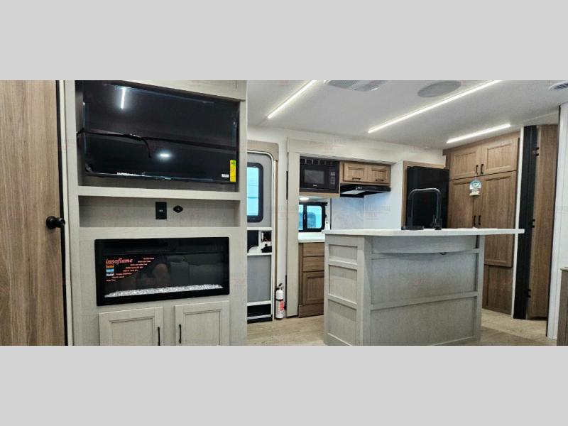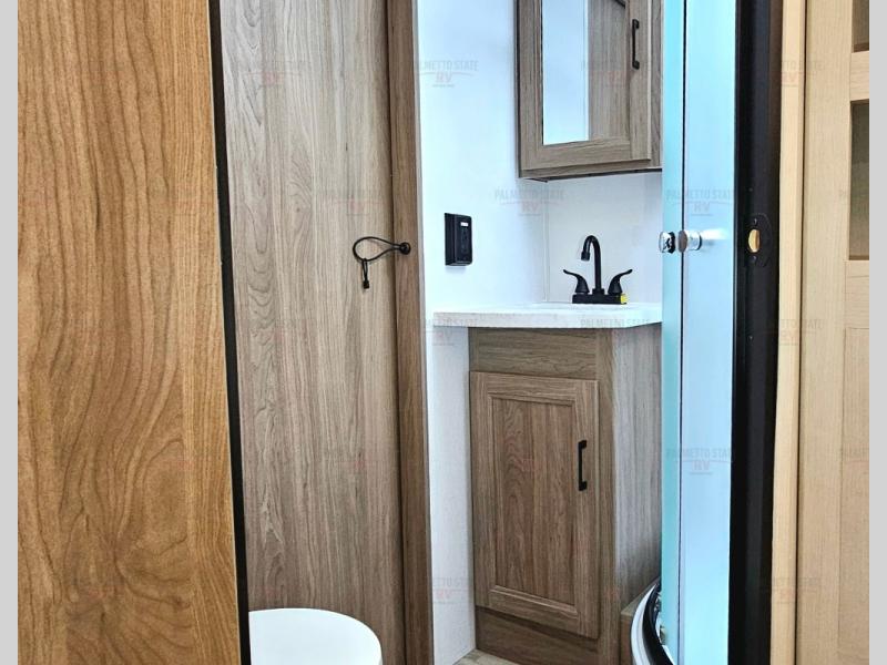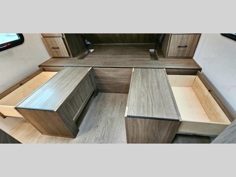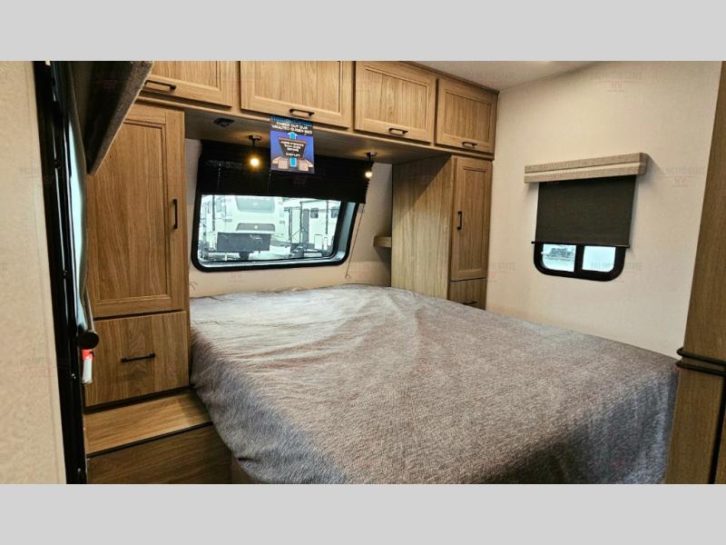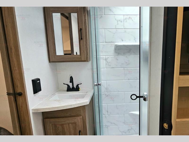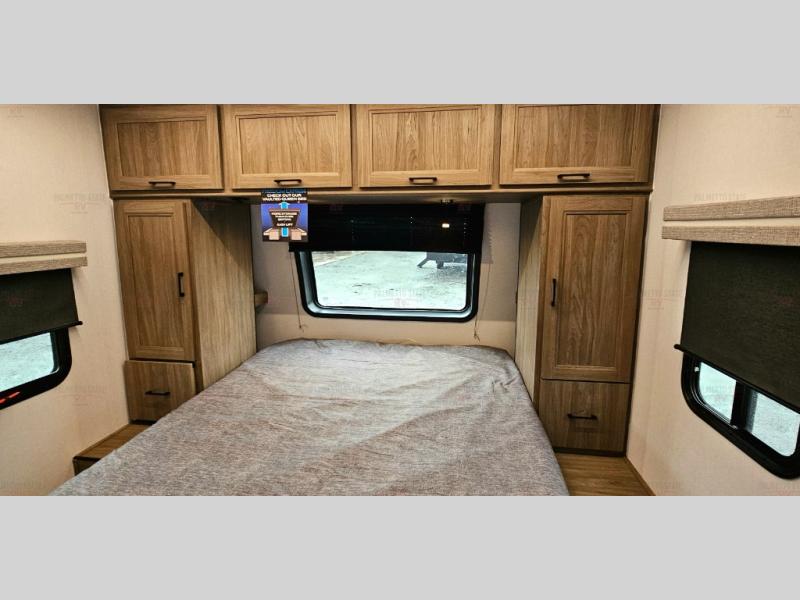 It won't be hard to find comfort and convenience in this travel trailer for eight. Once you've checked in at your campsite, grab your gear from the pass-through storage, put out the 20' awning, then start lunch on the full camp kitchen! If you'd rather cook inside, you'll find a three burner range and a microwave oven to cook meals, along with an 8 cu. ft. double door refrigerator and pantry for food storage, plus a kitchen island for more prep space! The booth dinette provides a place to dine or play games, and the hide-a-bed sofa can be switched out for an optional theater seat if you don't need the additional sleeping space. A stand-out feature on this model is the rear private bunkhouse with a flip-up bunk and roll-over sofa within a slide out, a second bunk across the room, a wardrobe with space for a TV, plus a second wardrobe for storage. And don't overlook the dual entry bath that leads to the front master bedroom, complete with a queen bed with underbed storage and dual wardrobes!