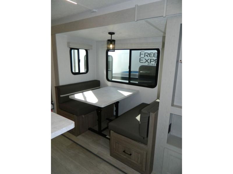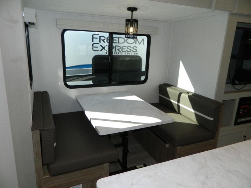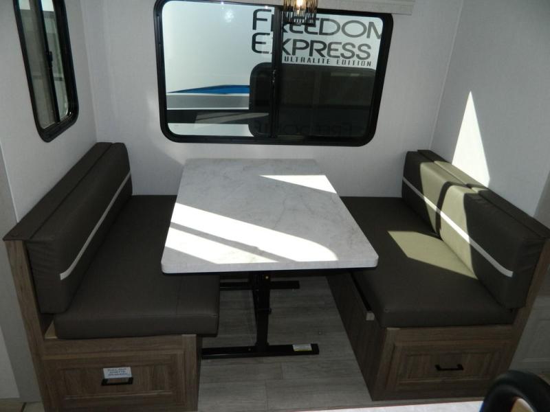 With any Freedom Express Ultra Lite travel trailer by Coachmen you will appreciate quality construction materials, such as vacuum bonded walls with Azdel composite, a 3/4 gel coated fiberglass cap with an automotive glass windshield, and a heated enclosed underbelly. Each model also features Tufflex PVC roofing, front rock guard, and E-Z Lube axles for smooth towing. Inside, you'll find kitchen backsplash, hidden hinge cabinetry, and wear-resistant vinyl flooring throughout. The power tongue jack included with the Ultra Lite Express Package will make set-up a breeze, and each model includes back-up camera prep and they are Freedom solar ready if you plan to go off-grid. Enjoy lightweight camping with a Freedom Express Ultra Lite travel trailer today!