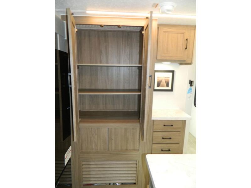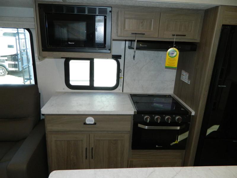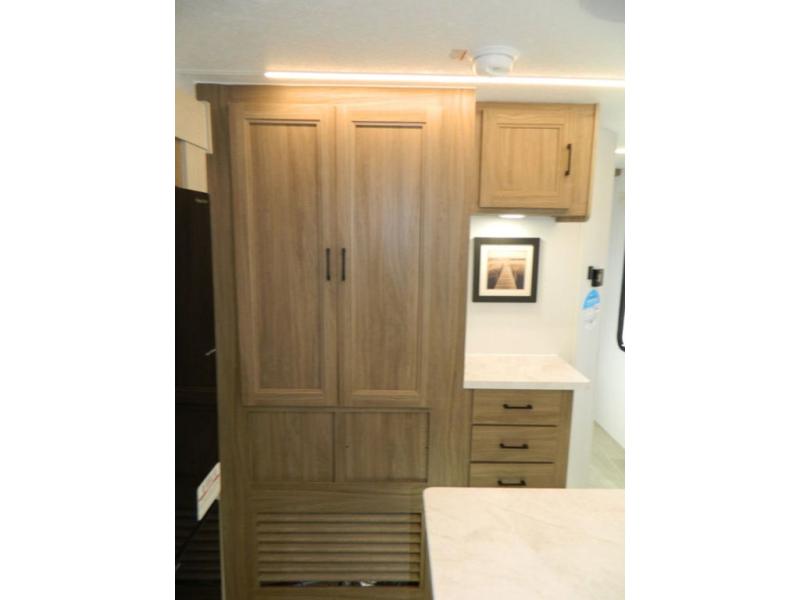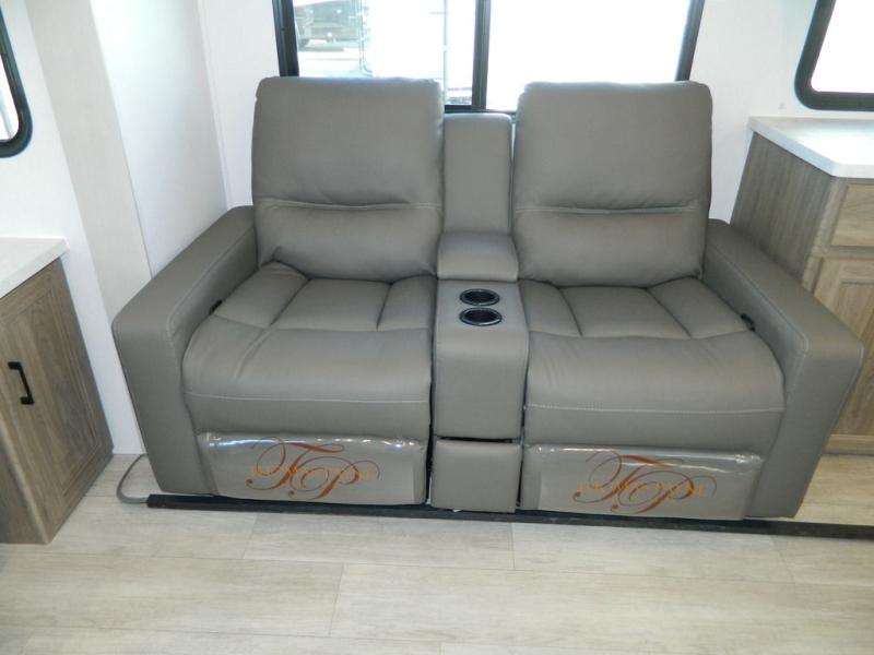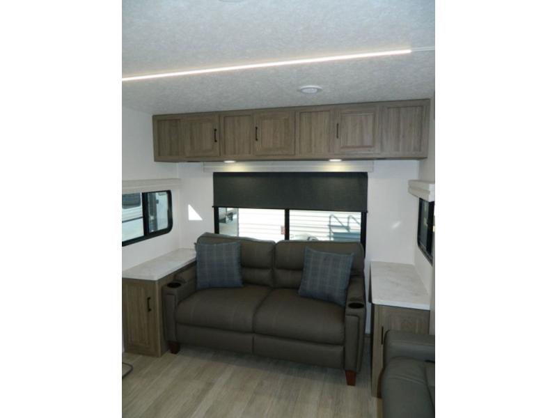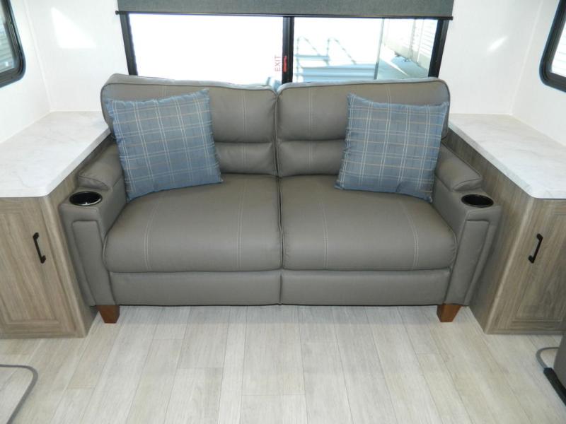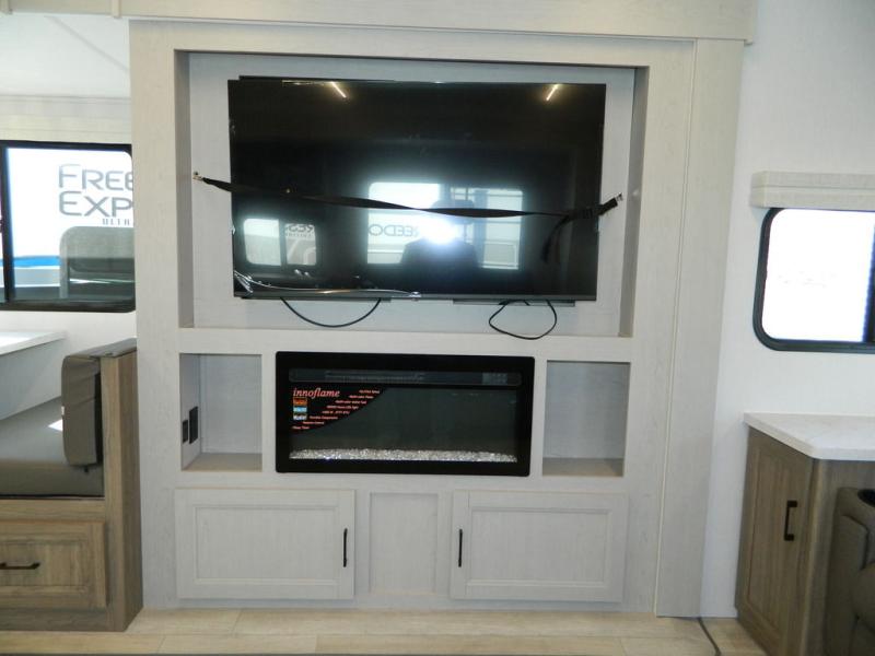This travel trailer has fantastic spaces both inside and out! The rear living area is ready for your group with a pair of theater seats and a hide-a-bed sofa. Everyone will enjoy gathering by the entertainment center which features a cozy fireplace for those chilly nights. The kitchen has a convenient island with sink for easy meal prep. A roomy booth dinette is great for meals or snacks. The queen bedroom offers privacy plus a ton of storage like dual wardrobes and dressers, and even a linen closet equipped with a convenient laundry bag. The full bath has a 30" x 36" shower. Outside you'll find even more room to gather with two power awnings and a camp kitchen with refrigerator so you can grab drinks or snacks on the go.