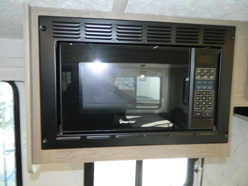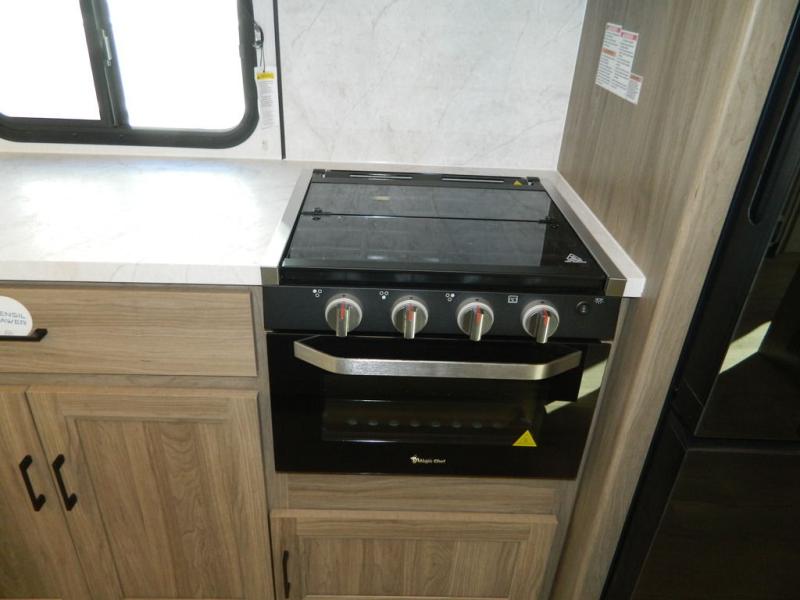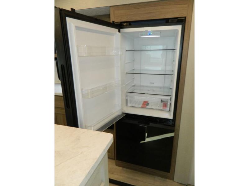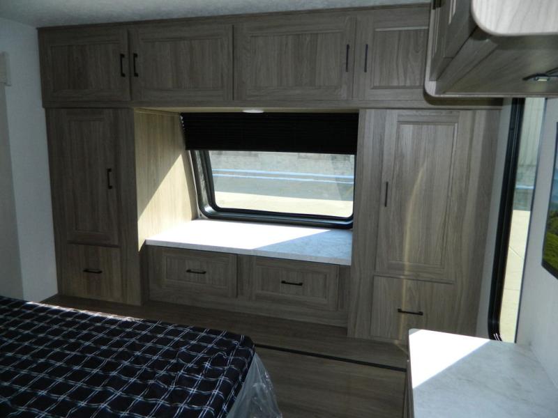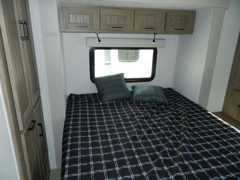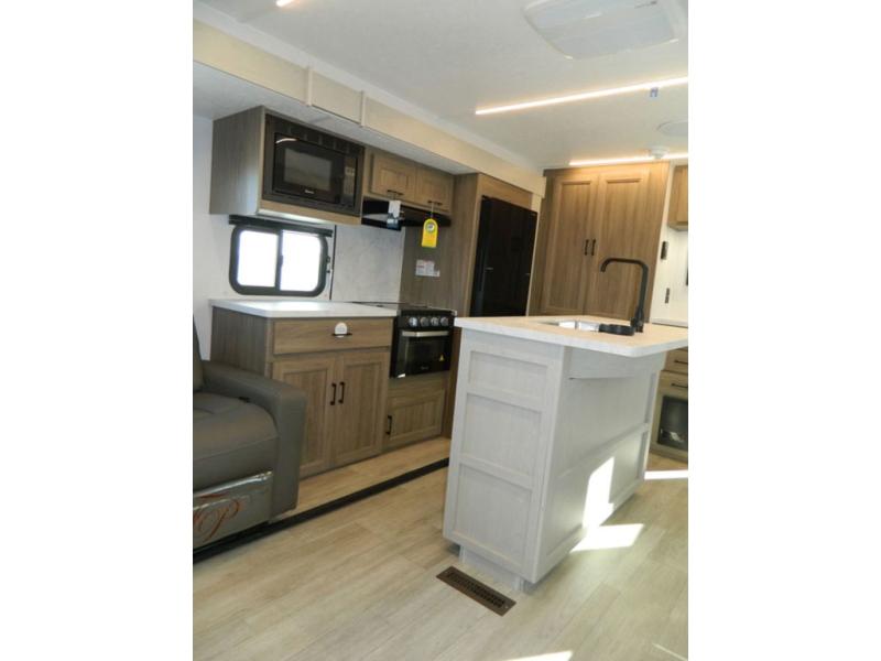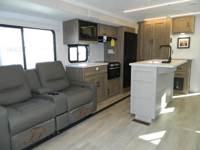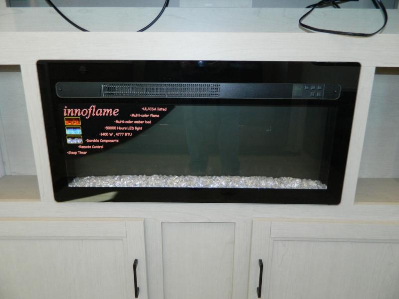 This travel trailer has fantastic spaces both inside and out! The rear living area is ready for your group with a pair of theater seats and a hide-a-bed sofa. Everyone will enjoy gathering by the entertainment center which features a cozy fireplace for those chilly nights. The kitchen has a convenient island with sink for easy meal prep. A roomy booth dinette is great for meals or snacks. The queen bedroom offers privacy plus a ton of storage like dual wardrobes and dressers, and even a linen closet equipped with a convenient laundry bag. The full bath has a 30" x 36" shower. Outside you'll find even more room to gather with two power awnings and a camp kitchen with refrigerator so you can grab drinks or snacks on the go.