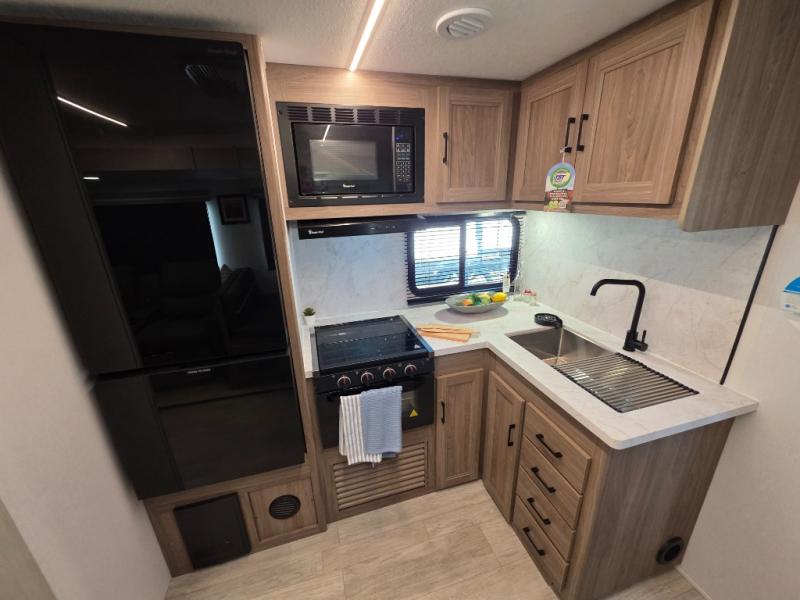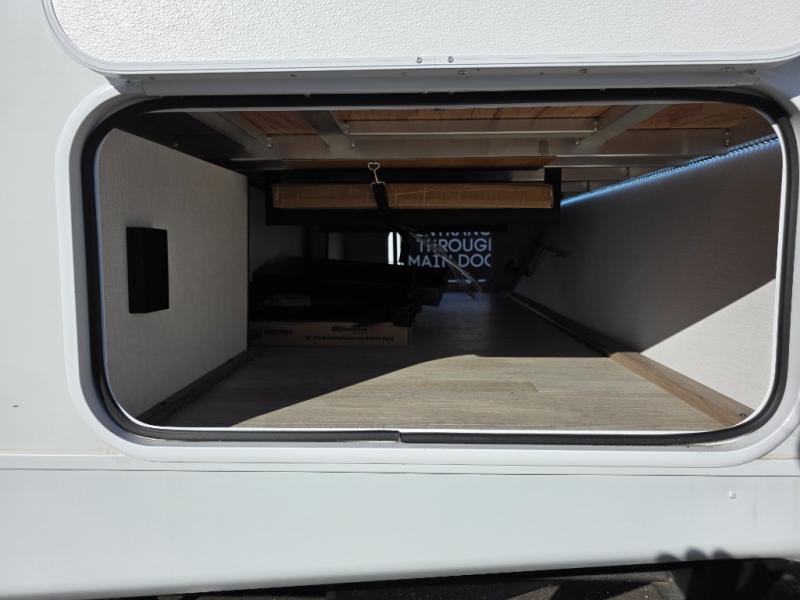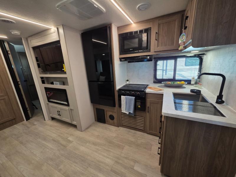 You will love taking a big group camping in this spacious travel trailer! The rear bunkhouse offers a flexible space with bunks plus a roll-over sofa. A half bath in the bunkhouse is ultra convenient, while the full bath includes a 30" x 36" shower. At the front you will enjoy privacy in the queen bedroom, which has vaulted underbed storage, dual wardrobes, plus a linen closet with its own laundry bag for extra convenience. Everyone will want to gather in the living area with its entertainment center with fireplace. The hide-a-bed sofa offers even more sleeping space, or swap it out for the optional theater seats for extra relaxation. The kitchen is well-equipped and the 76" dinette booth will have plenty of room. There's an outdoor camp kitchen as well if you'd prefer to cook outside.