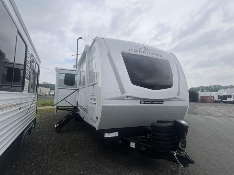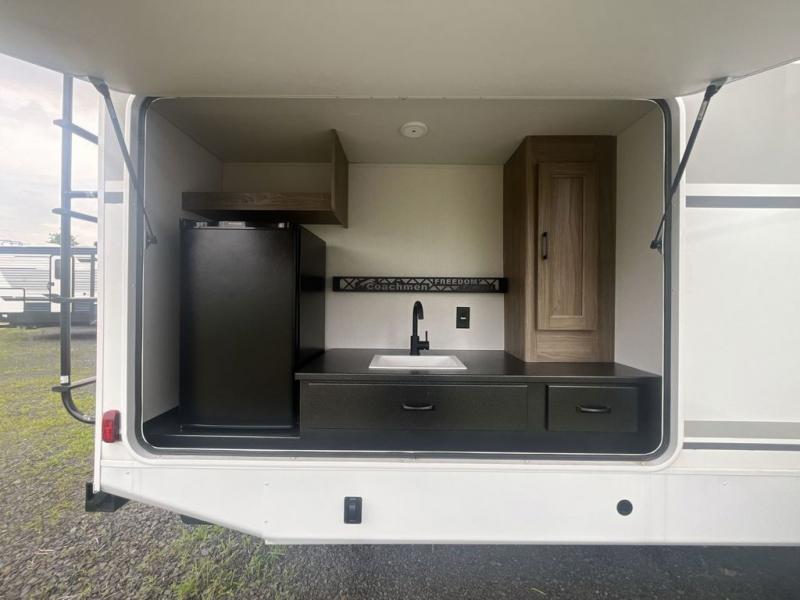 With any Freedom Express Ultra Lite travel trailer by Coachmen you will appreciate quality construction materials, such as vacuum bonded walls with Azdel composite, a 3/4 gel coated fiberglass cap with an automotive glass windshield, and a heated enclosed underbelly. Each model also features Tufflex PVC roofing, front rock guard, and E-Z Lube axles for smooth towing. Inside, you'll find kitchen backsplash, hidden hinge cabinetry, and wear-resistant vinyl flooring throughout. The power tongue jack included with the Ultra Lite Express Package will make set-up a breeze, and each model includes back-up camera prep and they are Freedom solar ready if you plan to go off-grid. Enjoy lightweight camping with a Freedom Express Ultra Lite travel trailer today!