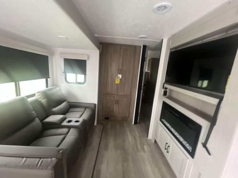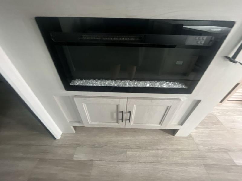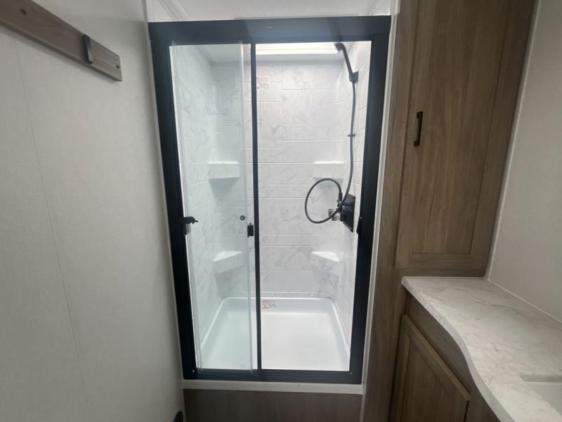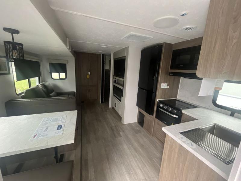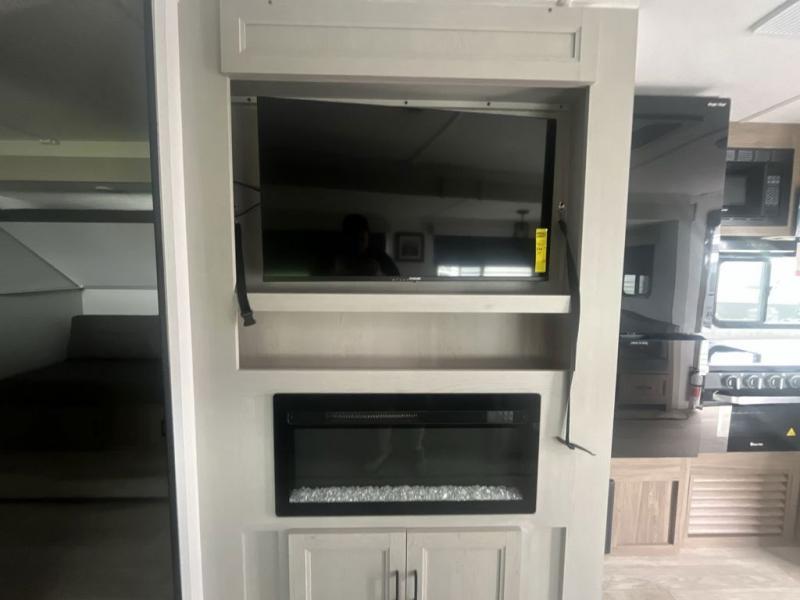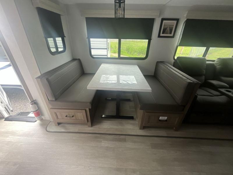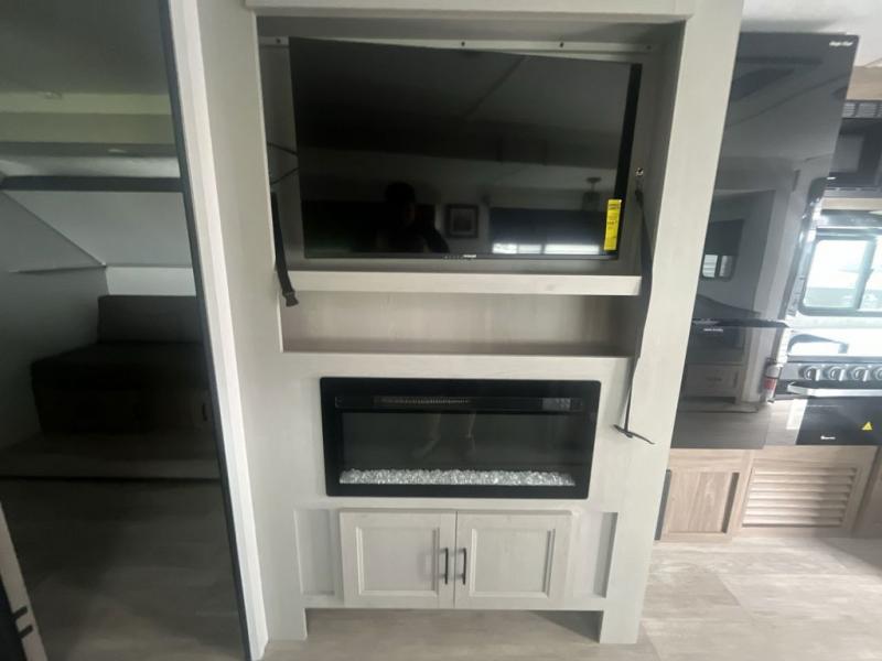 You will love taking a big group camping in this spacious travel trailer! The rear bunkhouse offers a flexible space with bunks plus a roll-over sofa. A half bath in the bunkhouse is ultra convenient, while the full bath includes a 30" x 36" shower. At the front you will enjoy privacy in the queen bedroom, which has vaulted underbed storage, dual wardrobes, plus a linen closet with its own laundry bag for extra convenience. Everyone will want to gather in the living area with its entertainment center with fireplace. The hide-a-bed sofa offers even more sleeping space, or swap it out for the optional theater seats for extra relaxation. The kitchen is well-equipped and the 76" dinette booth will have plenty of room. There's an outdoor camp kitchen as well if you'd prefer to cook outside.