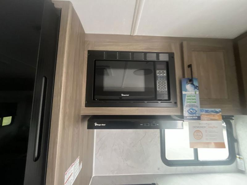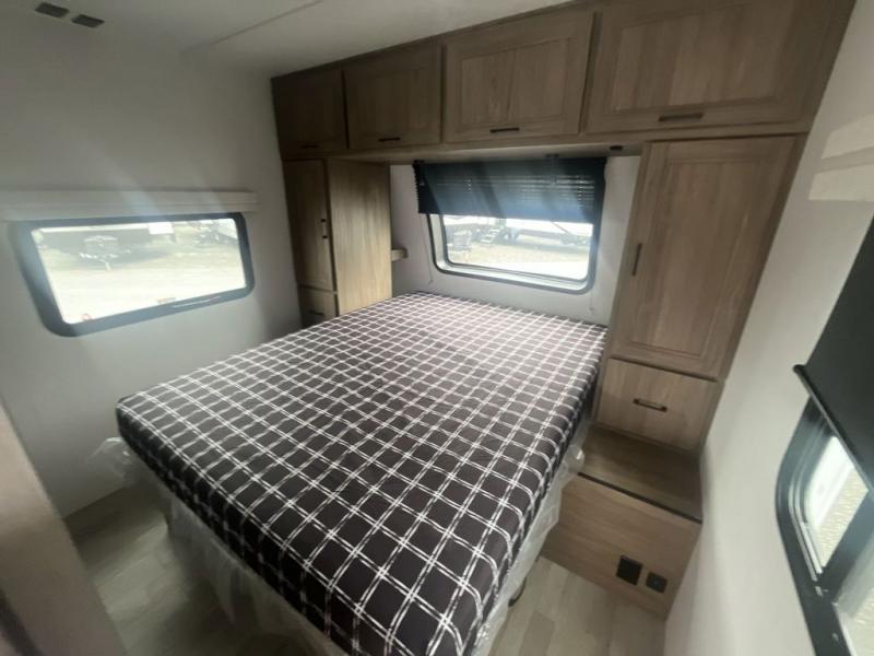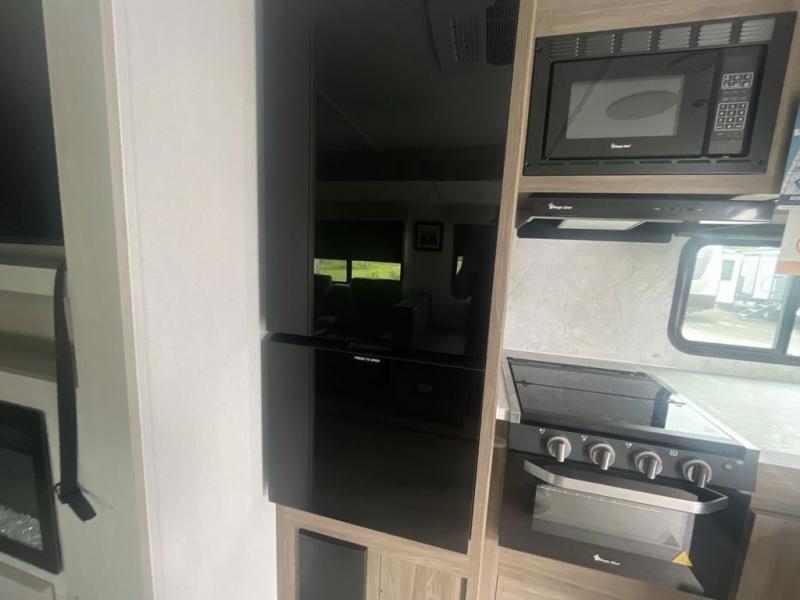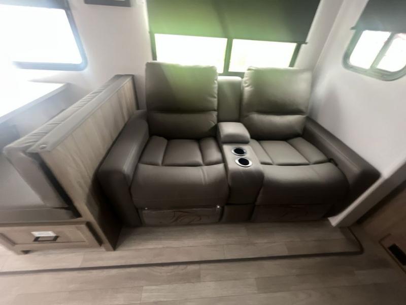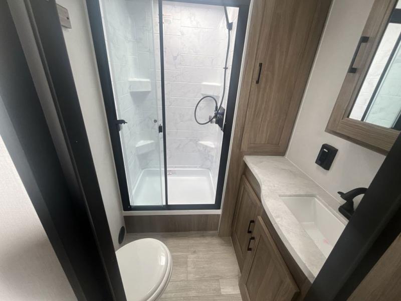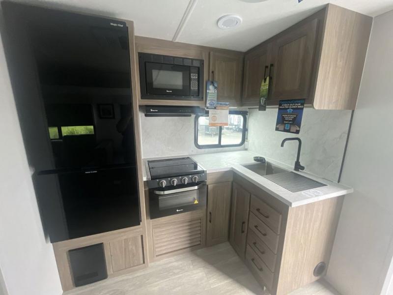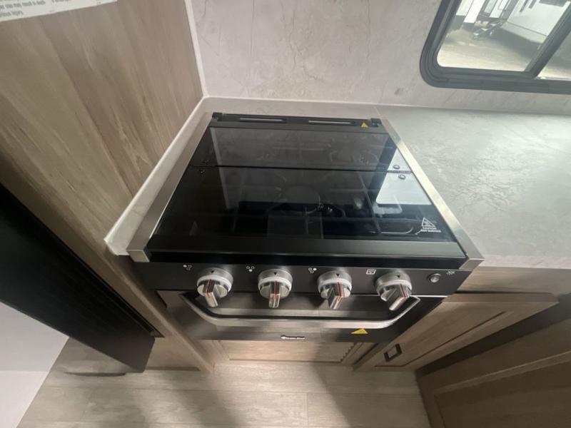 You will love taking a big group camping in this spacious travel trailer! The rear bunkhouse offers a flexible space with bunks plus a roll-over sofa. A half bath in the bunkhouse is ultra convenient, while the full bath includes a 30" x 36" shower. At the front you will enjoy privacy in the queen bedroom, which has vaulted underbed storage, dual wardrobes, plus a linen closet with its own laundry bag for extra convenience. Everyone will want to gather in the living area with its entertainment center with fireplace. The hide-a-bed sofa offers even more sleeping space, or swap it out for the optional theater seats for extra relaxation. The kitchen is well-equipped and the 76" dinette booth will have plenty of room. There's an outdoor camp kitchen as well if you'd prefer to cook outside.