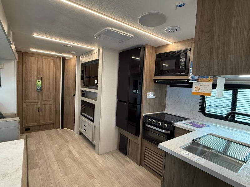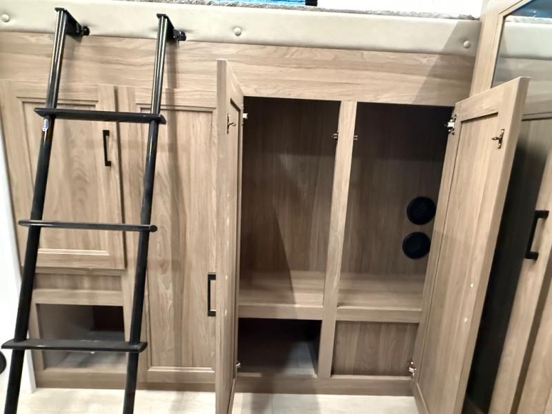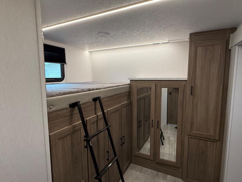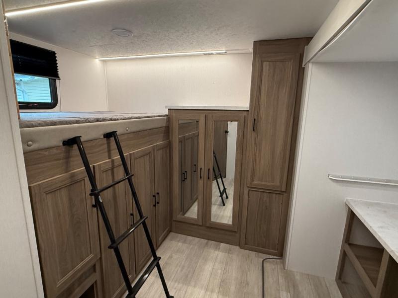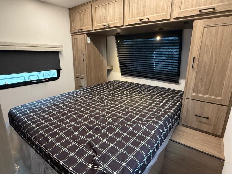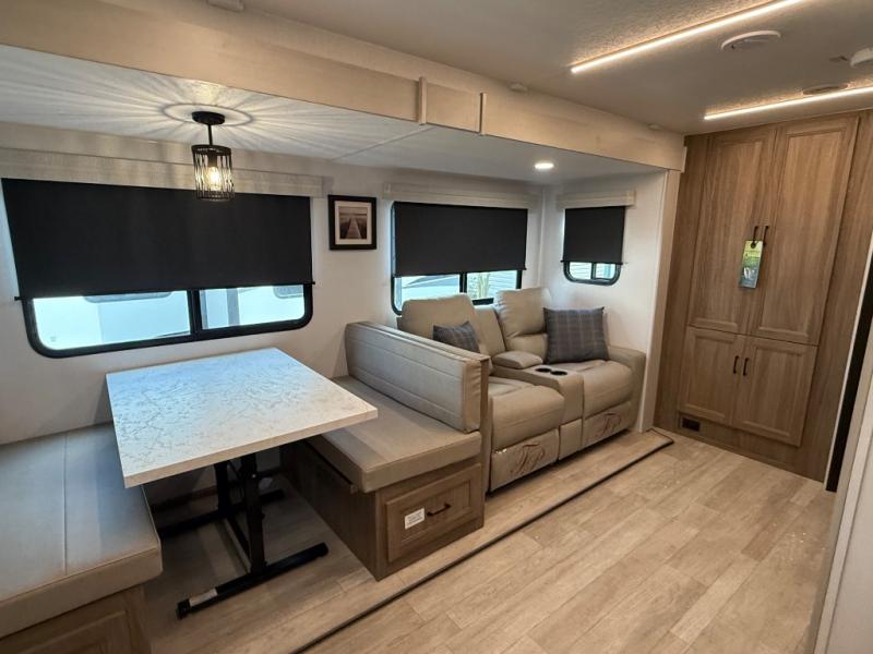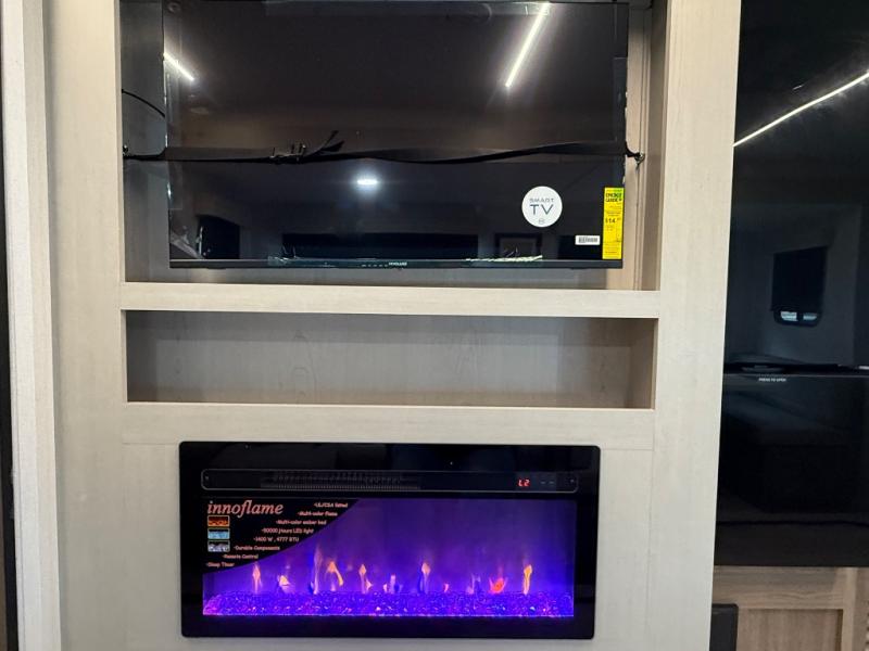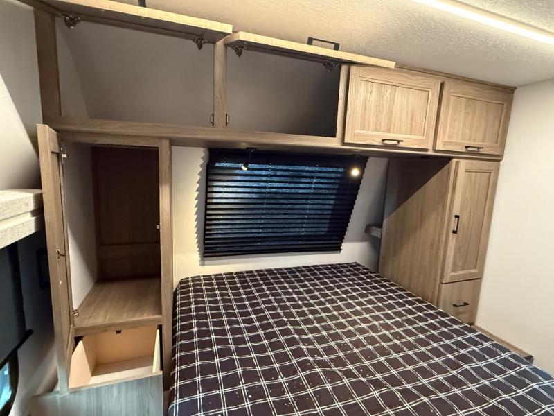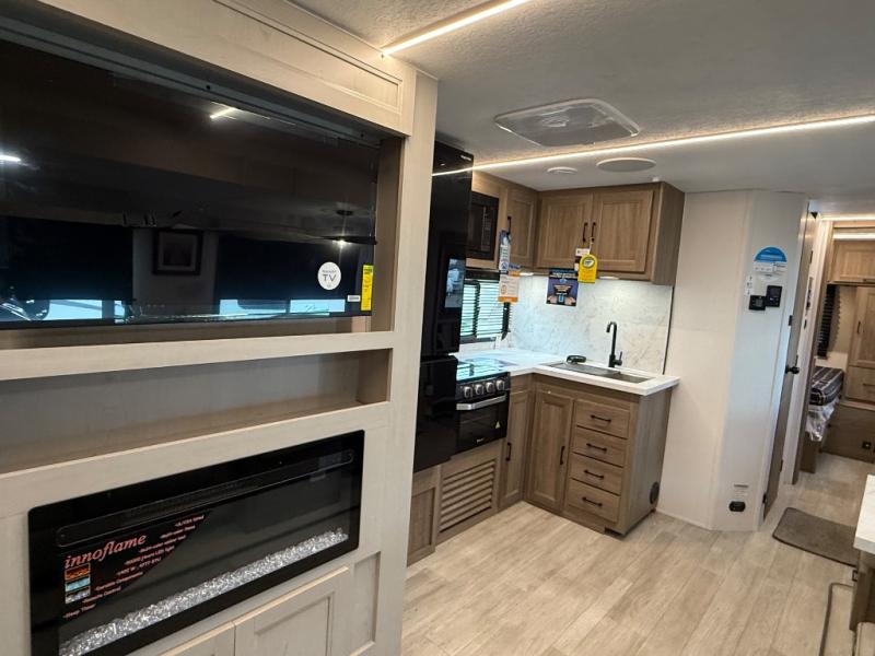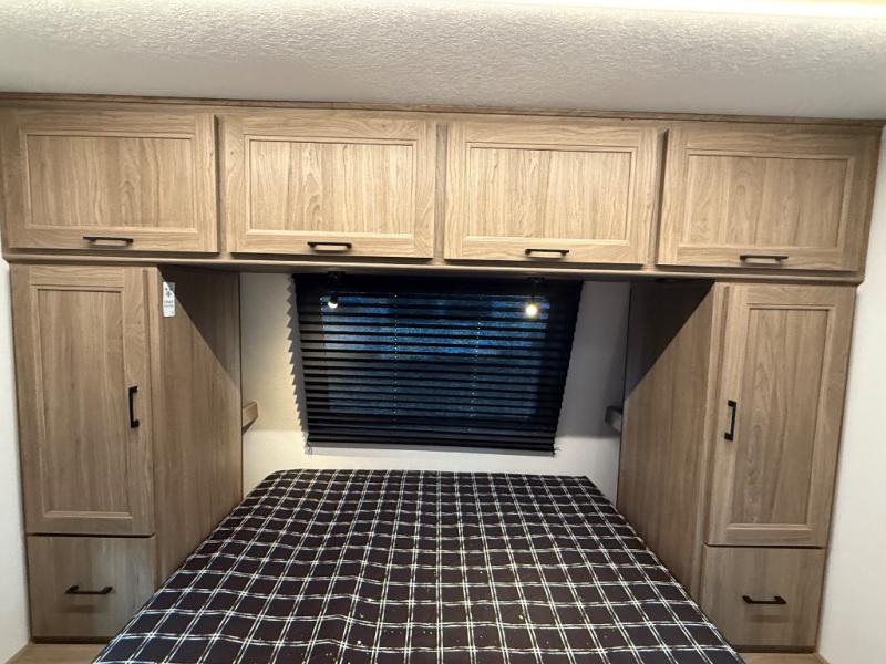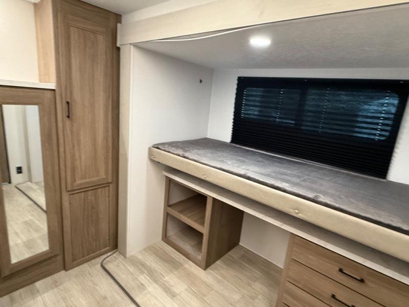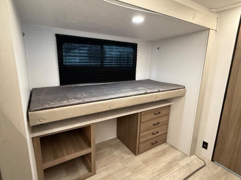 You will love taking a big group camping in this spacious travel trailer! The rear bunkhouse offers a flexible space with bunks plus a roll-over sofa. A half bath in the bunkhouse is ultra convenient, while the full bath includes a 30" x 36" shower. At the front you will enjoy privacy in the queen bedroom, which has vaulted underbed storage, dual wardrobes, plus a linen closet with its own laundry bag for extra convenience. Everyone will want to gather in the living area with its entertainment center with fireplace. The living space has theater seats for extra relaxation. The kitchen is well-equipped and the 76" dinette booth will have plenty of room. There's an outdoor camp kitchen as well if you'd prefer to cook outside.