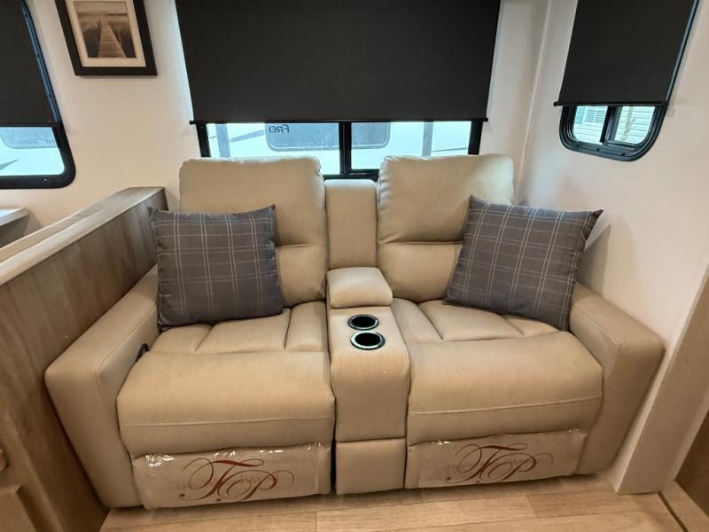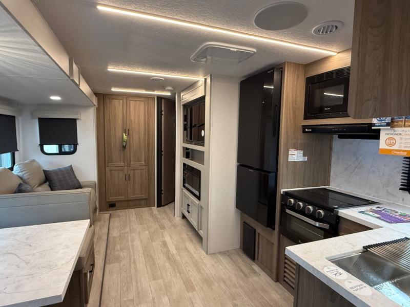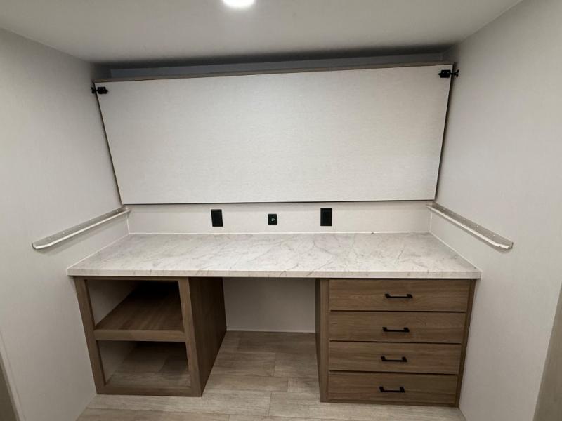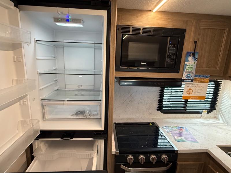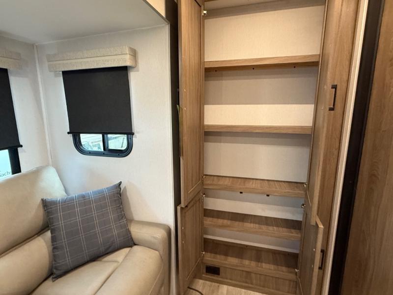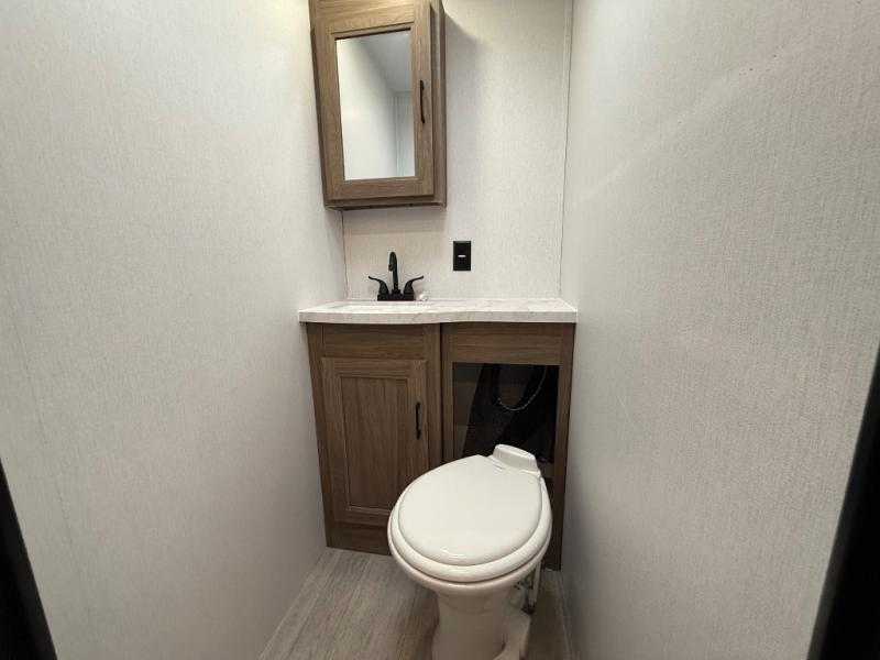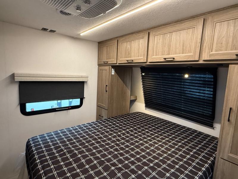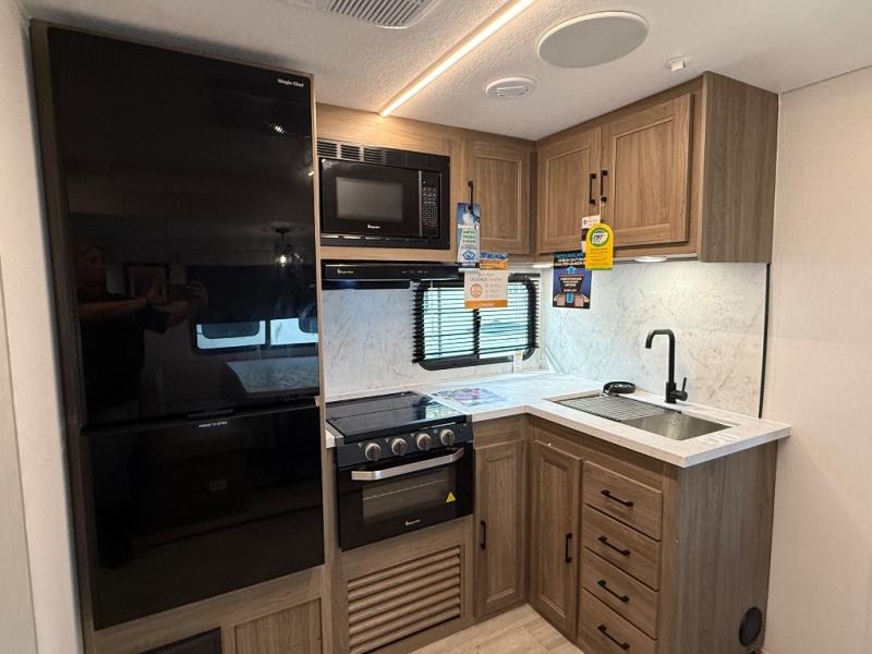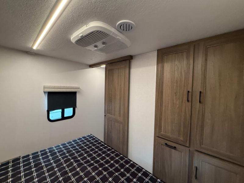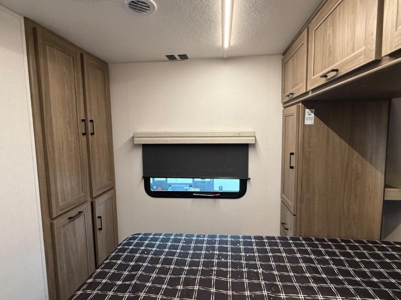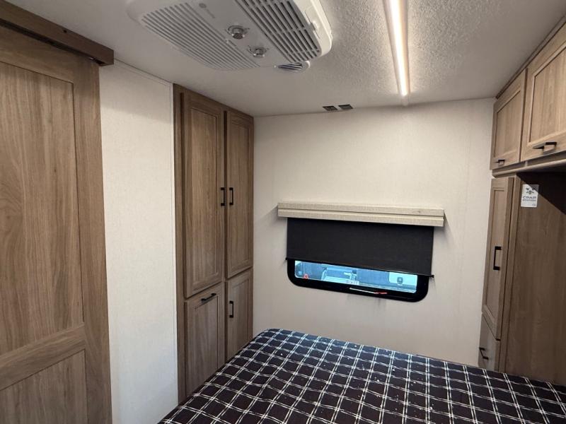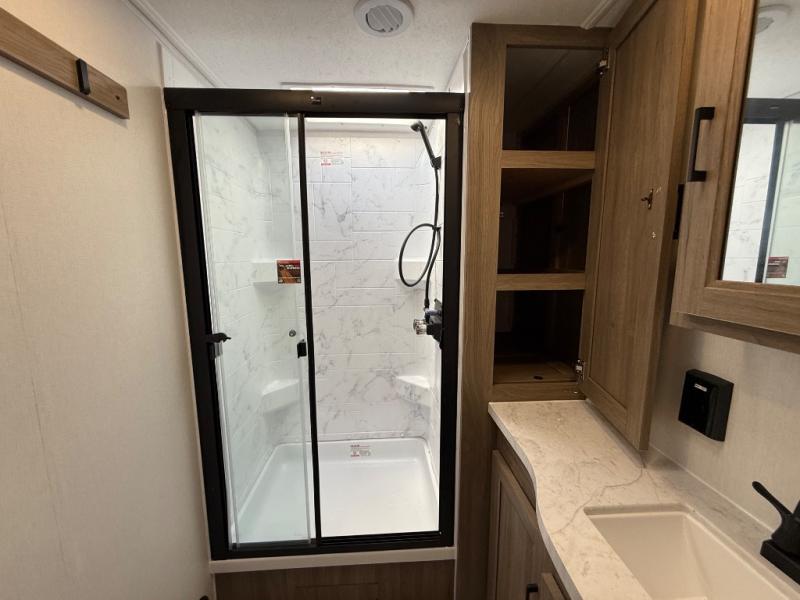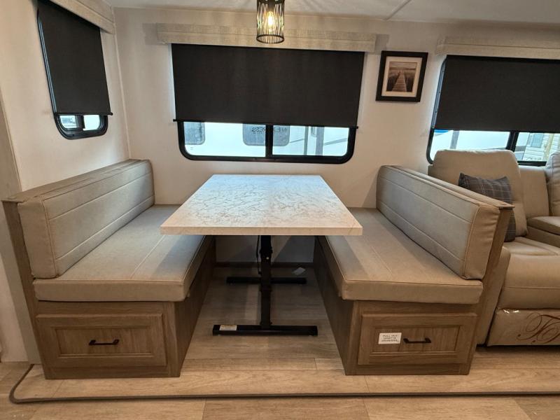 You will love taking a big group camping in this spacious travel trailer! The rear bunkhouse offers a flexible space with bunks plus a roll-over sofa. A half bath in the bunkhouse is ultra convenient, while the full bath includes a 30" x 36" shower. At the front you will enjoy privacy in the queen bedroom, which has vaulted underbed storage, dual wardrobes, plus a linen closet with its own laundry bag for extra convenience. Everyone will want to gather in the living area with its entertainment center with fireplace. The living space has theater seats for extra relaxation. The kitchen is well-equipped and the 76" dinette booth will have plenty of room. There's an outdoor camp kitchen as well if you'd prefer to cook outside.