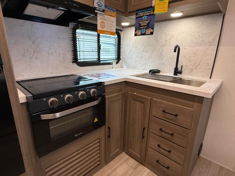 With any Freedom Express Ultra Lite travel trailer by Coachmen you will appreciate quality construction materials, such as vacuum bonded walls with Azdel composite, a 3/4 gel coated fiberglass cap with an automotive glass windshield, and a heated enclosed underbelly. Each model also features Tufflex PVC roofing, front rock guard, and E-Z Lube axles for smooth towing. Inside, you'll find kitchen backsplash, hidden hinge cabinetry, and wear-resistant vinyl flooring throughout. The power tongue jack included with the Ultra Lite Express Package will make set-up a breeze, and each model includes back-up camera prep and they are Freedom solar ready if you plan to go off-grid. Enjoy lightweight camping with a Freedom Express Ultra Lite travel trailer today!