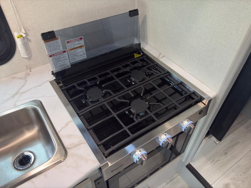 Three-burner cooktop and oven for preparing home-cooked meals.