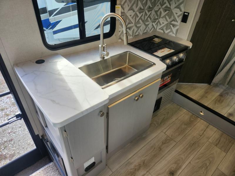 Experience the perfect getaway in this motorhome! Featuring a 60" x 80" queen-sized bed and a 57" x 95" cab-over bunk, there's ample room for everyone to relax. Enjoy your meals at the spacious U-shaped dinette, which can also be used for spreading out a board game once the table is cleared. The kitchen is equipped to rival any home setup, complete with a pantry, microwave, and a stainless steel farmhouse sink with a high-rise faucet. This model is also equipped with the CRV Supersprings Ride system, including heavy-duty stabilizer bars, chassis electronic stability control, SumoSprings front shock absorbers, and more for a smooth and stable journey.