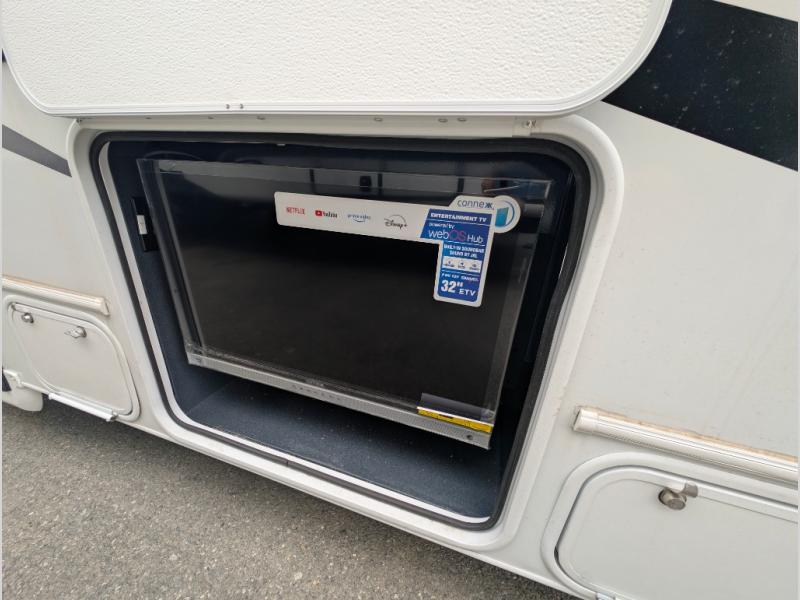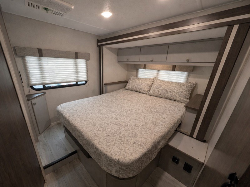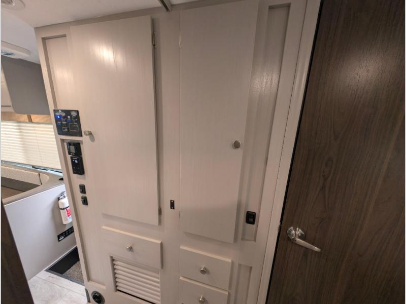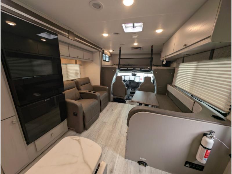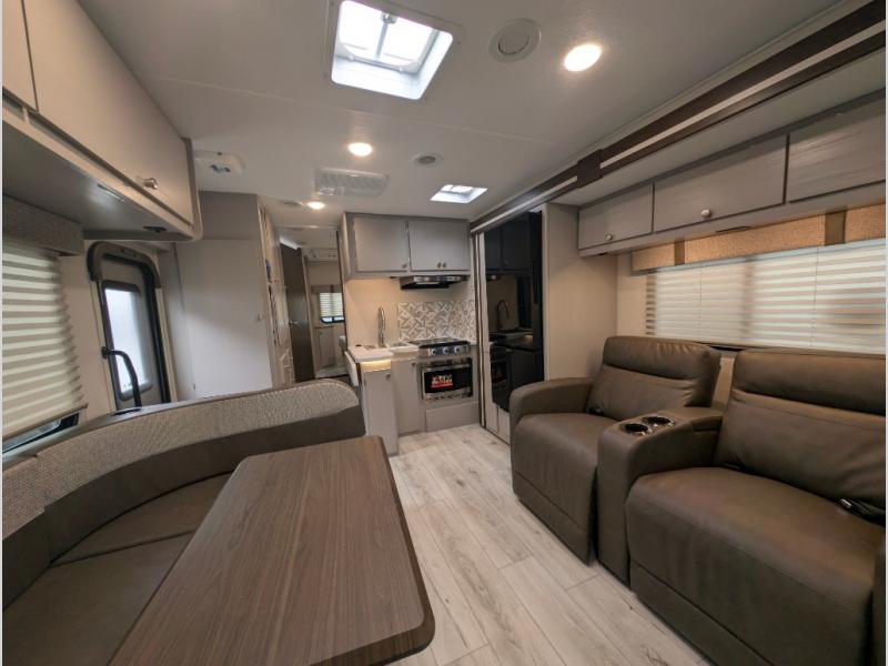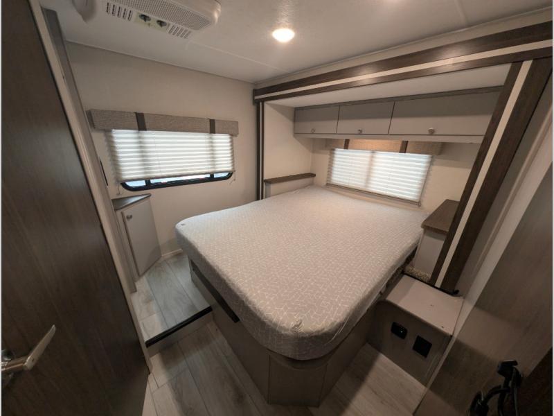 Two slide outs expand your vacation in this fun motorhome! Relax in the living area with a 62” sofa, or swap it out for optional recliners. The J-lounge dinette with an 18” extension provides another space for leisure time or gourmet meals. The kitchen layout feels spacious with two pantries and thermofoil countertops with a flip-down extension for extra prep space. In the rear, you’ll find a queen bed with overhead cabinet and dual nightstands, plus a roomy bath with shower and linen closet. Outside is an awning and you can even add on an optional outdoor kitchen table for more fun in the sun! This model also includes the CRV Supersprings Ride with heavy duty stabilizer bars, chassis electronic stability control, SumoSprings front shock absorbers, and more!