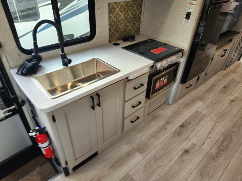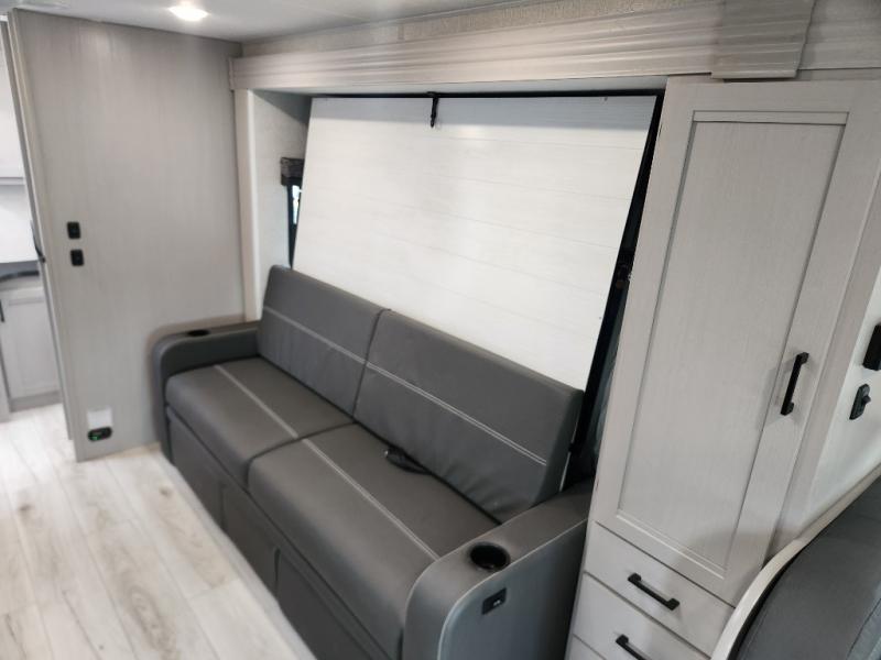 This motorhome is designed for ultimate versatility! It features a 72" x 74" Murphy bed that transforms into an 84" sofa for daytime lounging. Opposite the bed, you'll find a 40" Smart TV with an optional fireplace below, as well as hookups for an optional washer and dryer. The 57" x 80" bunk over the cab provides extra sleeping or storage space, and the 44" x 82" U-shaped dinette can also be converted into an additional bed. The fully equipped kitchen includes a pull-out countertop extension for easier meal prep, and there's even an outdoor kitchen for cooking in the fresh air!
