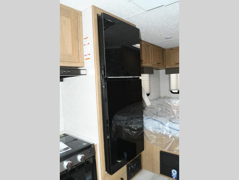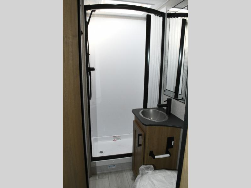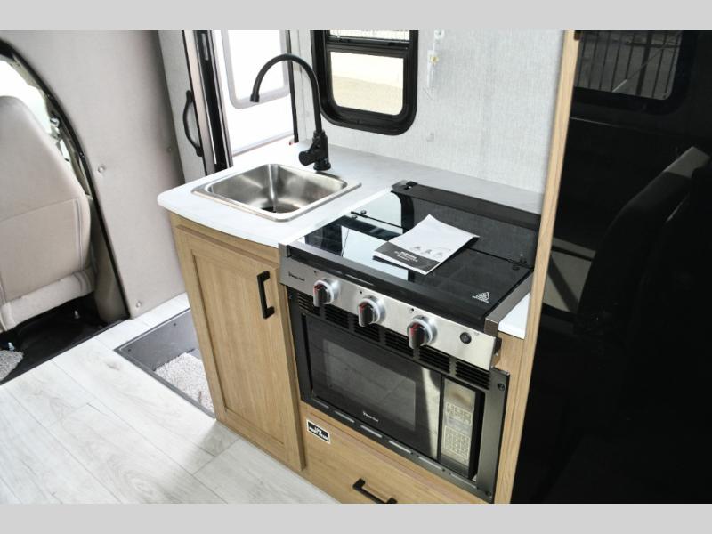 - Fully Equipped Kitchen: Features a 12V refrigerator, three-burner cooktop, microwave, and a deep sink with residential-style faucets for easy meal prep.
