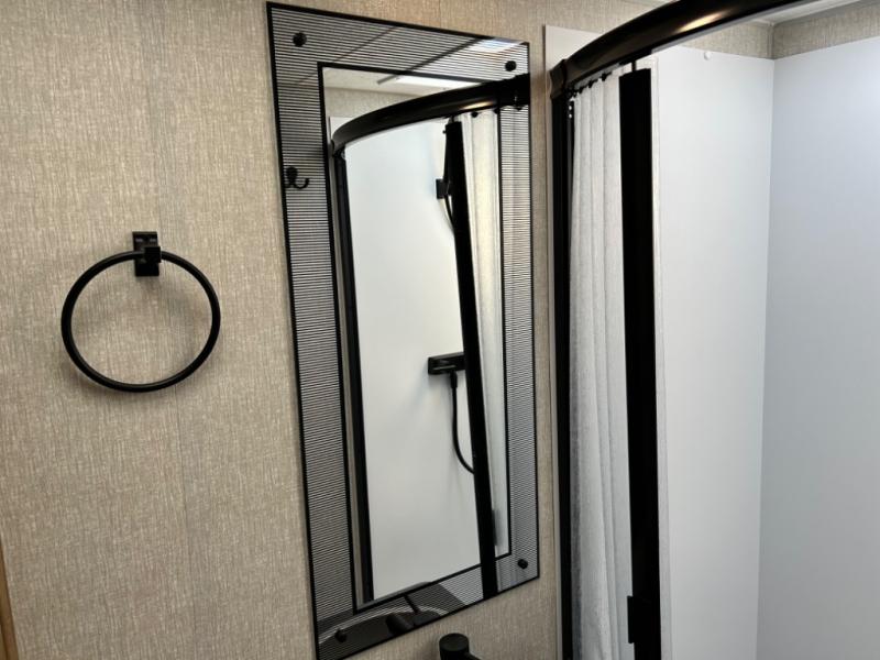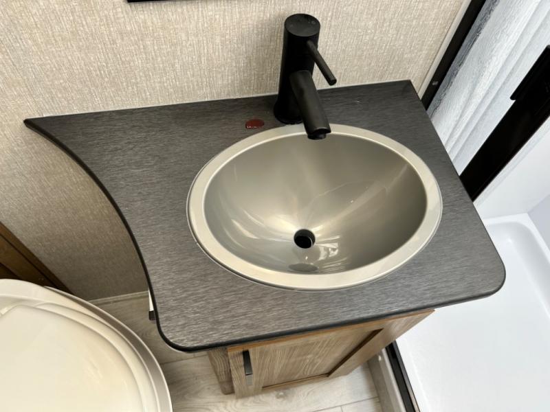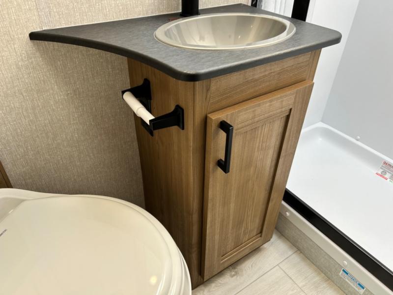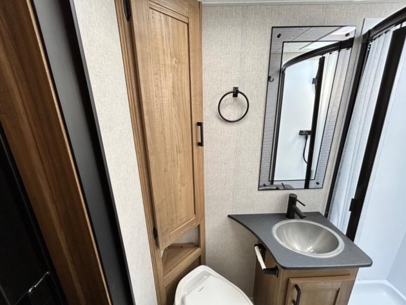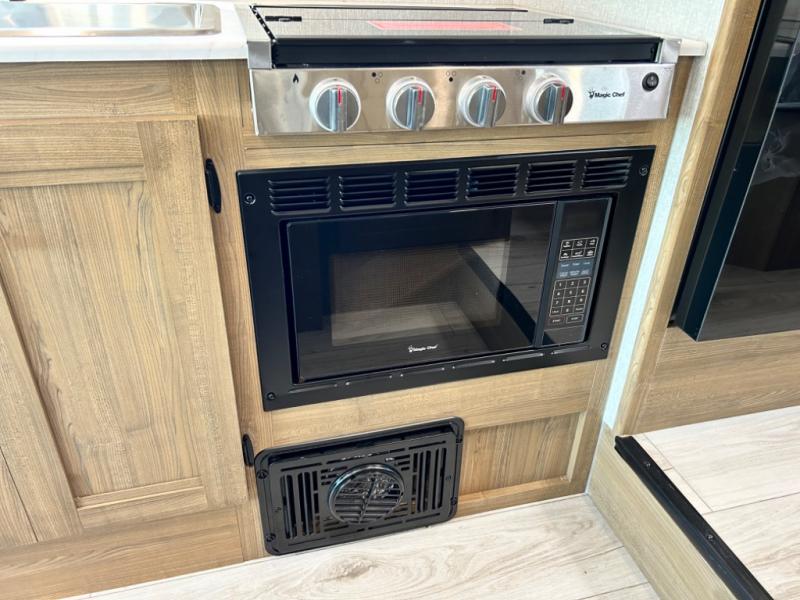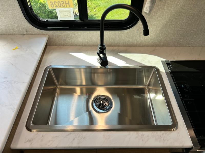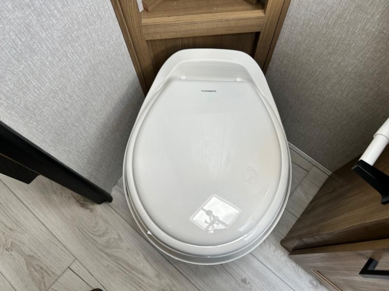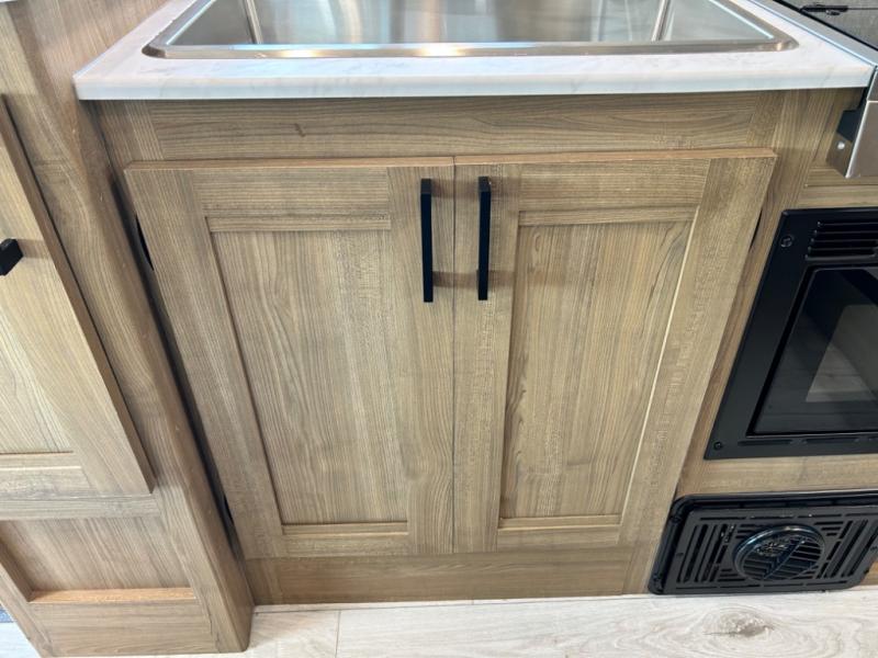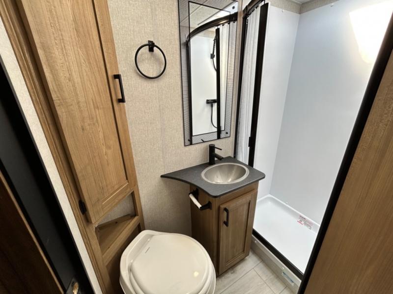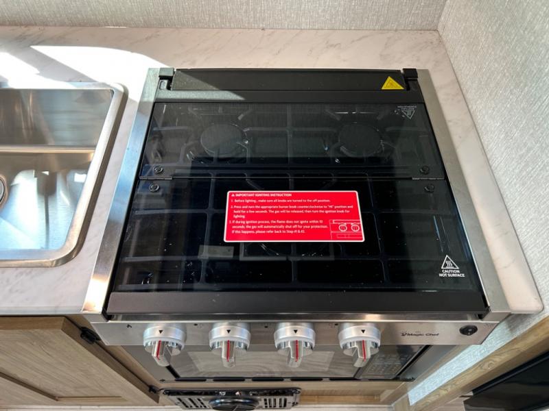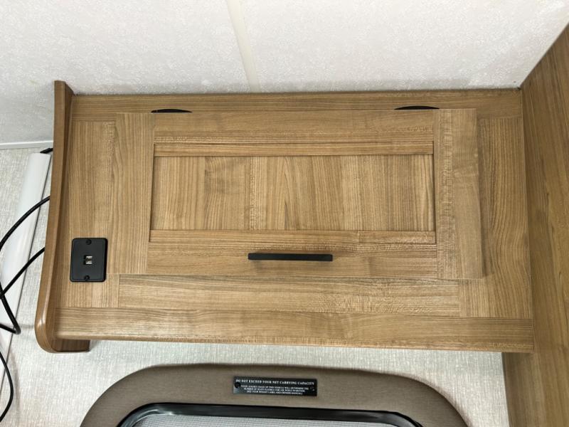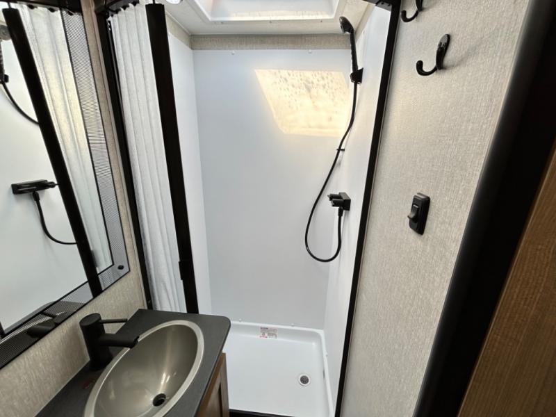 You will be met with comfort at every turn in this coach for six! Once you have stopped for the day, you can make lunch on the three burner cooktop and grab a cold drink from the 10 cu. ft. 12V refrigerator. There is a J-lounge with a pedestal table and extension where you can dine together, and the swing-arm TV in the cab will let you check the weather before heading outdoors. The rear corner full bath will let everyone freshen up when you return from hiking, and you'll enjoy a queen bed slide out to sleep on each night, while your guest take the J-lounge and cab-over bunk!