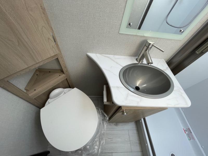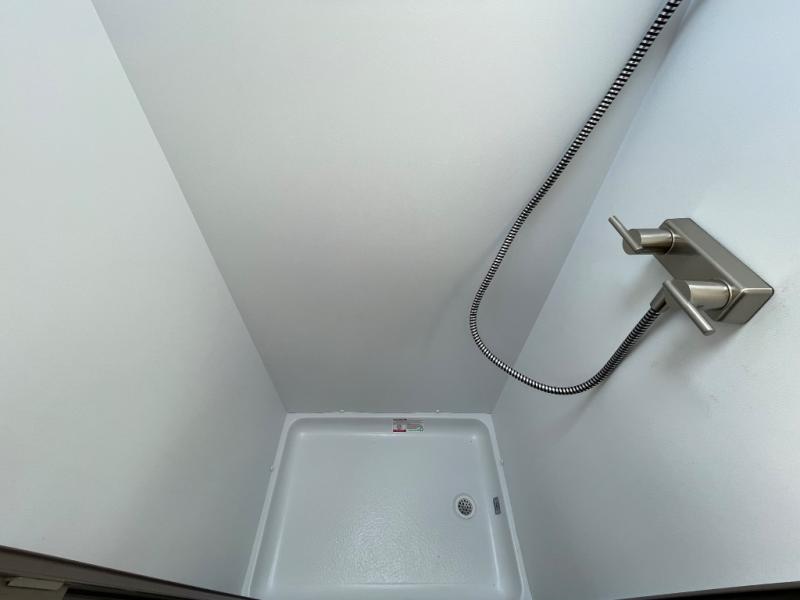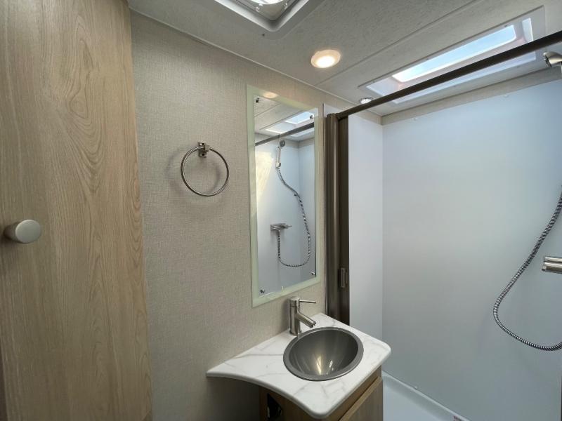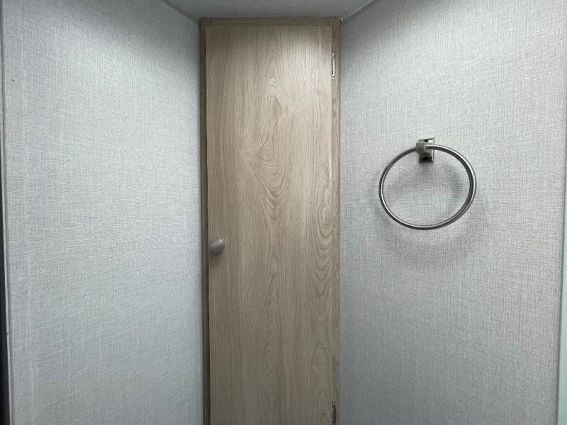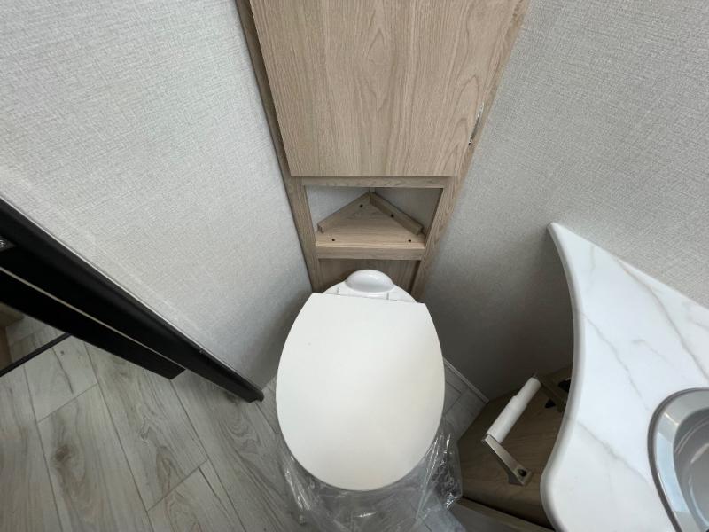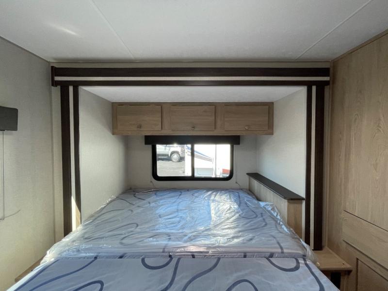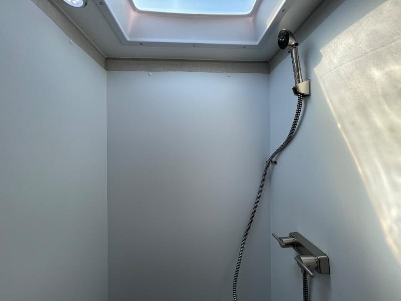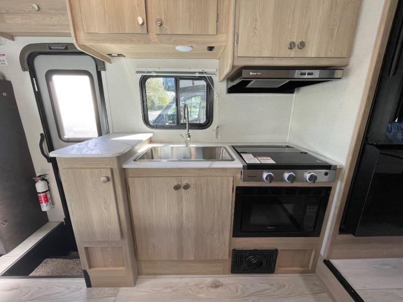 You will be met with comfort at every turn in this coach for six! Once you have stopped for the day, you can make lunch on the three burner cooktop and grab a cold drink from the 10 cu. ft. 12V refrigerator. There is a J-lounge with a pedestal table and extension where you can dine together, and the swing-arm TV in the cab will let you check the weather before heading outdoors. The rear corner full bath will let everyone freshen up when you return from hiking, and you'll enjoy a queen bed slide out to sleep on each night, while your guest take the J-lounge and cab-over bunk!