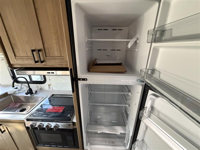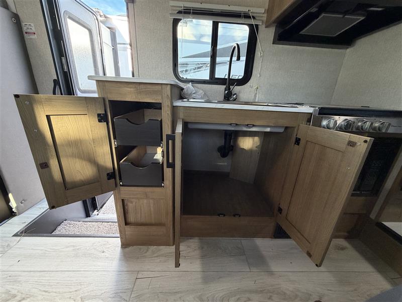 You will be met with comfort at every turn in this coach for six! Once you have stopped for the day, you can make lunch on the three burner cooktop and grab a cold drink from the 10 cu. ft. 12V refrigerator. There is a J-lounge with a pedestal table and extension where you can dine together, and the swing-arm TV in the cab will let you check the weather before heading outdoors. The rear corner full bath will let everyone freshen up when you return from hiking, and you'll enjoy a queen bed slide out to sleep on each night, while your guest take the J-lounge and cab-over bunk!