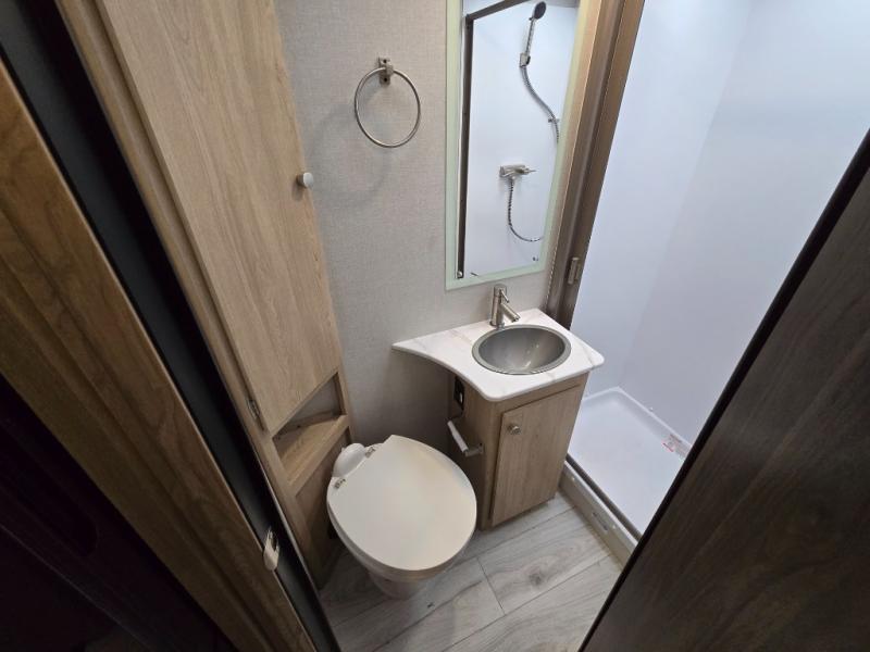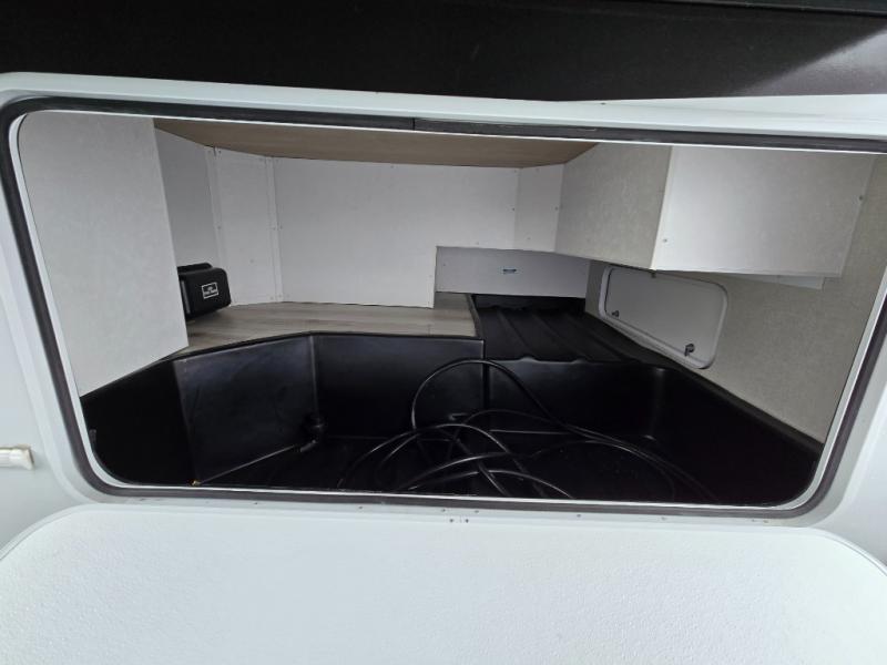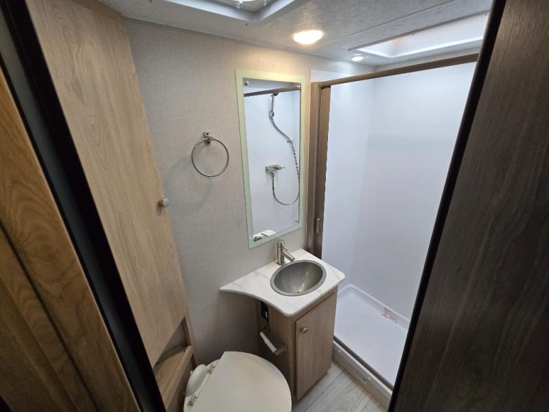 You will be met with comfort at every turn in this coach for six! Once you have stopped for the day, you can make lunch on the three burner cooktop and grab a cold drink from the 10 cu. ft. 12V refrigerator. There is a J-lounge with a pedestal table and extension where you can dine together, and the swing-arm TV in the cab will let you check the weather before heading outdoors. The rear corner full bath will let everyone freshen up when you return from hiking, and you'll enjoy a queen bed slide out to sleep on each night, while your guest take the J-lounge and cab-over bunk!