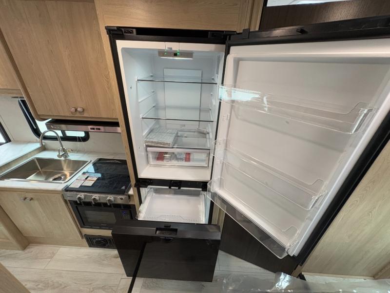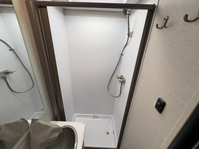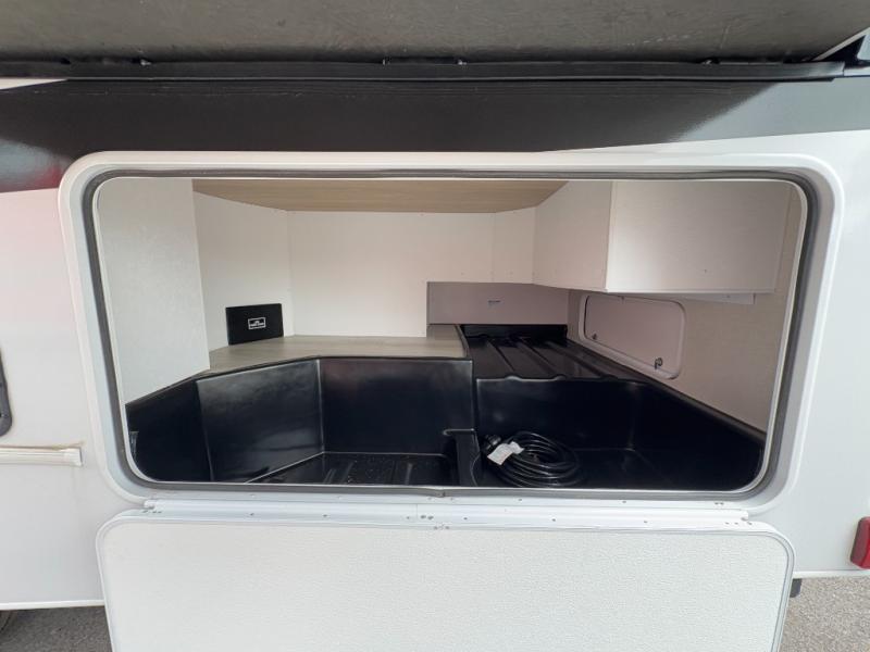 You will be met with comfort at every turn in this coach for six! Once you have stopped for the day, you can make lunch on the three burner cooktop and grab a cold drink from the 10 cu. ft. 12V refrigerator. There is a J-lounge with a pedestal table and extension where you can dine together, and the swing-arm TV in the cab will let you check the weather before heading outdoors. The rear corner full bath will let everyone freshen up when you return from hiking, and you'll enjoy a queen bed slide out to sleep on each night, while your guest take the J-lounge and cab-over bunk!