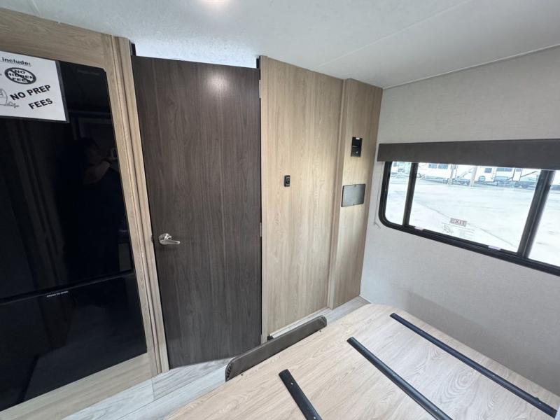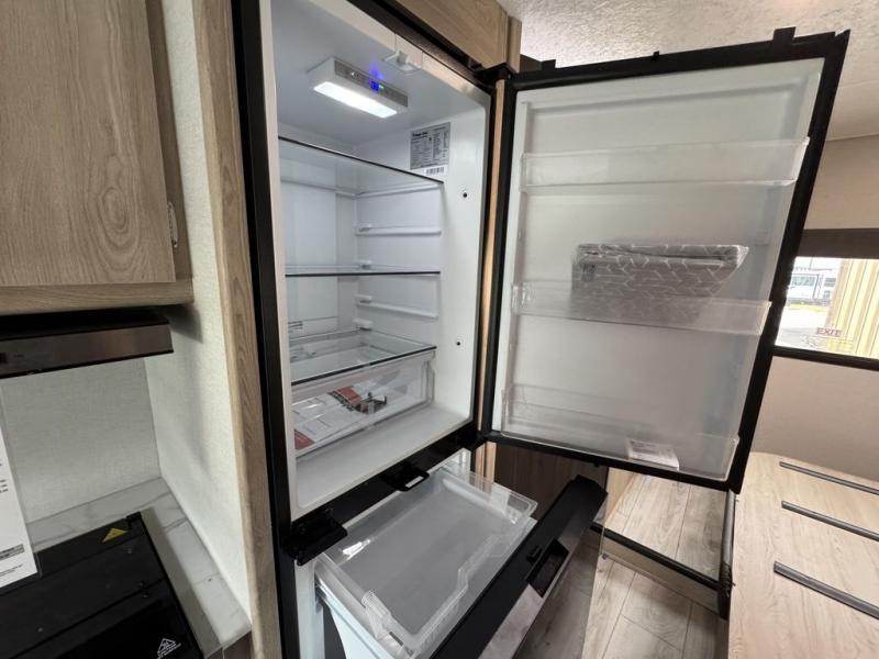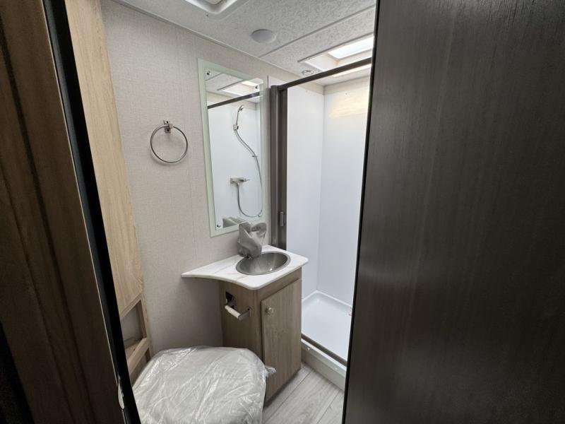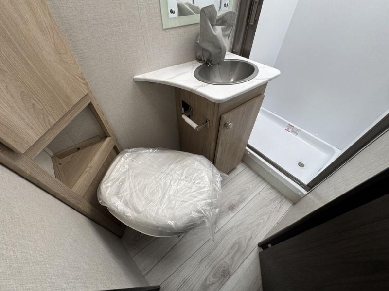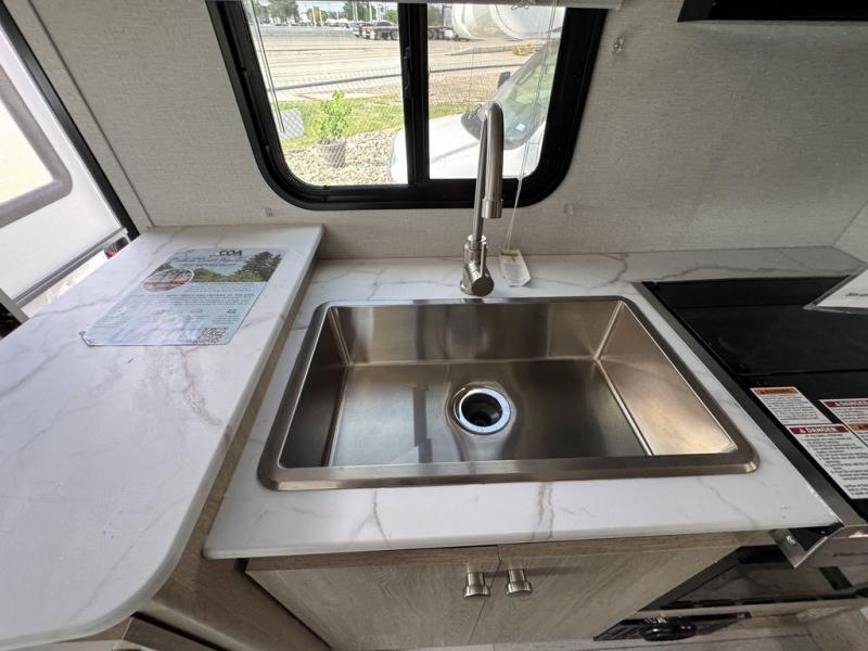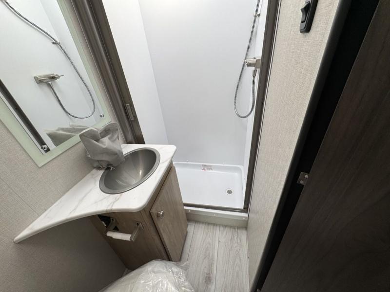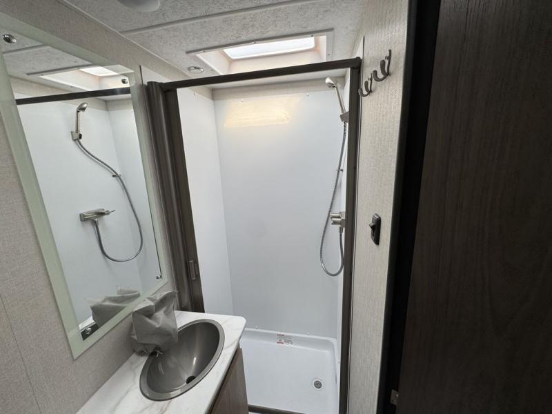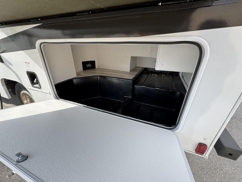 You will be met with comfort at every turn in this coach for six! Once you have stopped for the day, you can make lunch on the three burner cooktop and grab a cold drink from the 10 cu. ft. 12V refrigerator. There is a J-lounge with a pedestal table and extension where you can dine together, and the swing-arm TV in the cab will let you check the weather before heading outdoors. The rear corner full bath will let everyone freshen up when you return from hiking, and you'll enjoy a queen bed slide out to sleep on each night, while your guest take the J-lounge and cab-over bunk!