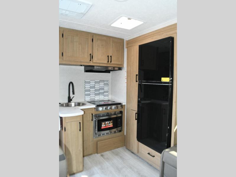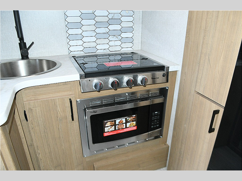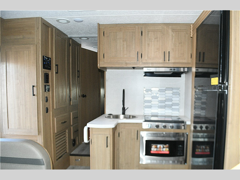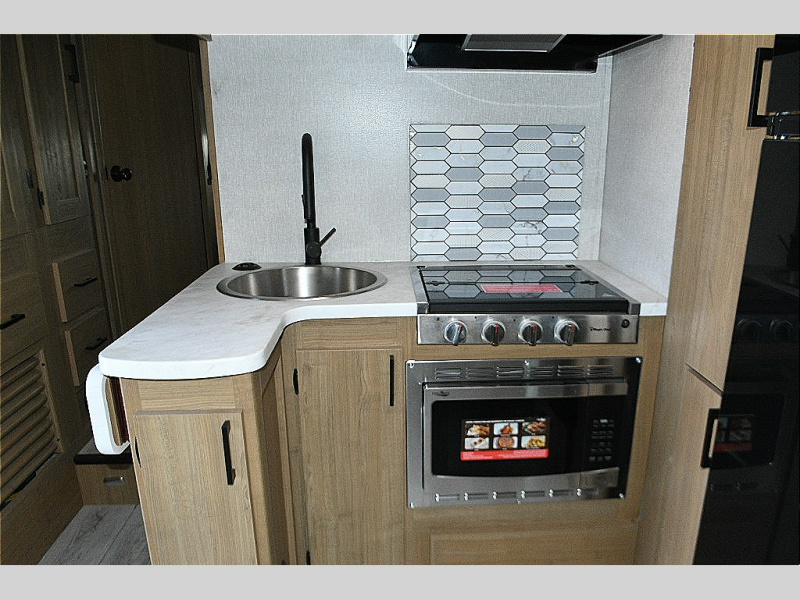 - Full Kitchen: Equipped with a flip-down extension, a three-burner cooktop, microwave, and a large sink, making it easy to prepare meals on the road.