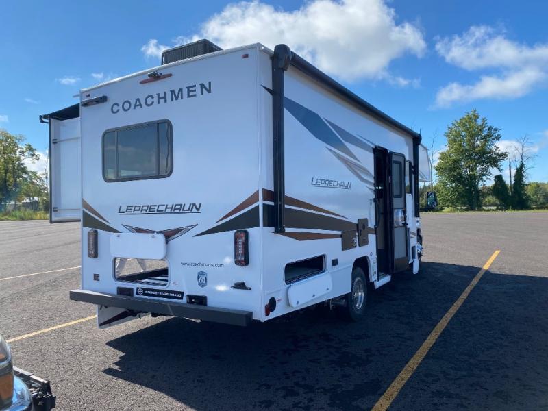 With each Leprechaun Class C gas motorhome by Coachmen you will enjoy "better" interior appointments, like the raised panel cabinetry, the one-piece thermofoil countertops, and the premium vinyl flooring. You will sleep soundly each night on the mattress with a bedspread, and staying clean will be easy with the premium showerhead and faucet in the bath. These models include reclining cockpit seats, cruise control, and a rear backup camera so you can easily get in and out of the campground. The Leprechaun is constructed with Azdel composite sidewalls, a seamless, one-piece roof membrane, and vacu-bond laminated walls, roof, and floor for a durable motorhome made to last.