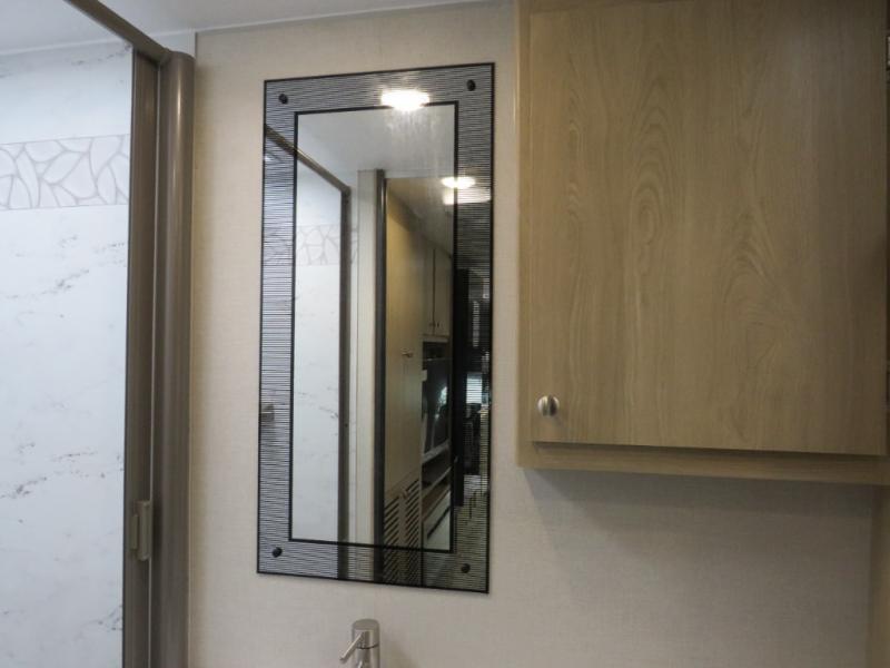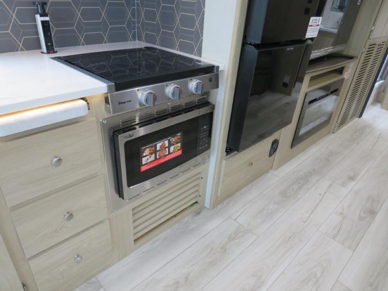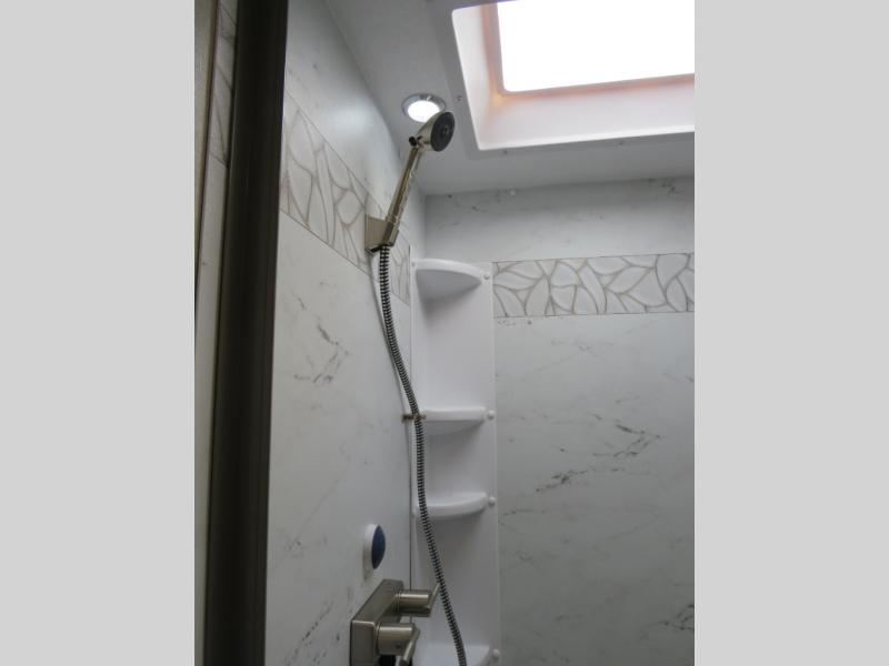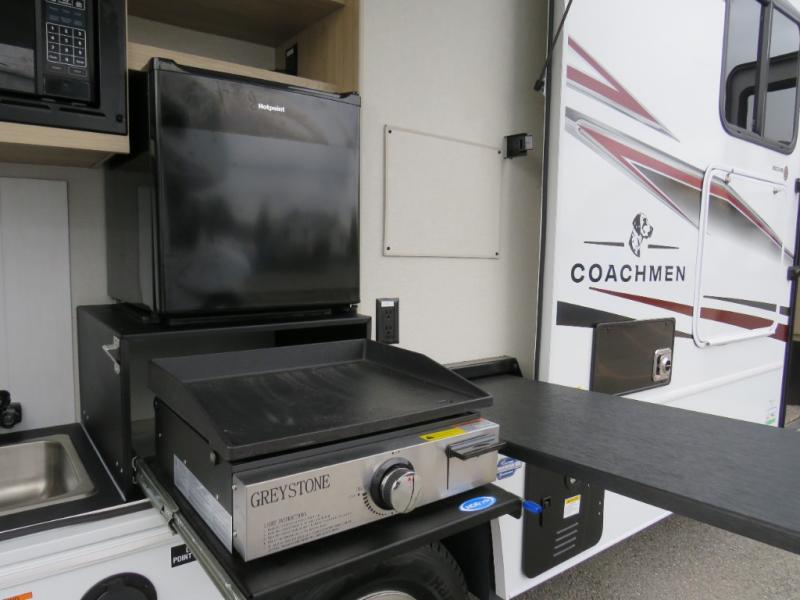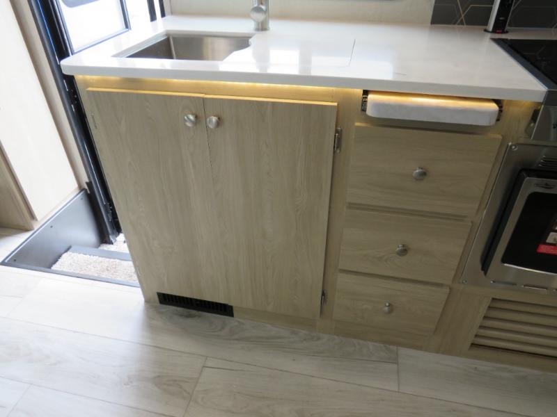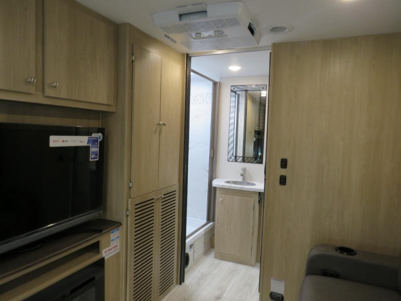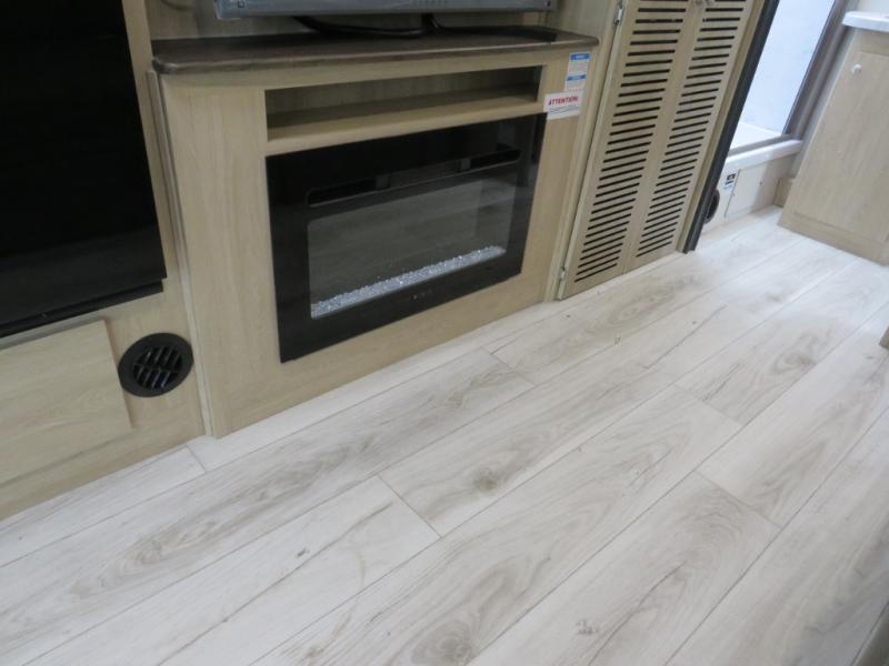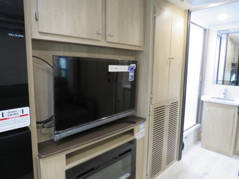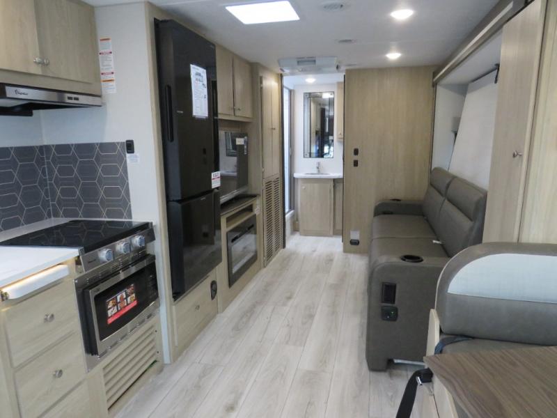 Your small family will love traveling in this motorhome! This coach is filled with exceptionally helpful amenities, like the pull-out extension in the kitchen, the 44" x 82" U-shaped dinette, the full bathroom with skylight and upgraded glass 30" x 36" shower door, and the fireplace. The chef will have an easy time cooking in the fully equipped kitchen, but also love cooking at the outside kitchen, plus there is outside storage for all of your gear and an outside TV for entertainment. You will get a good night's rest each night on the 72" x 74" king Murphy bed and the kiddos can sleep on the 57" x 80" bunk over cab!