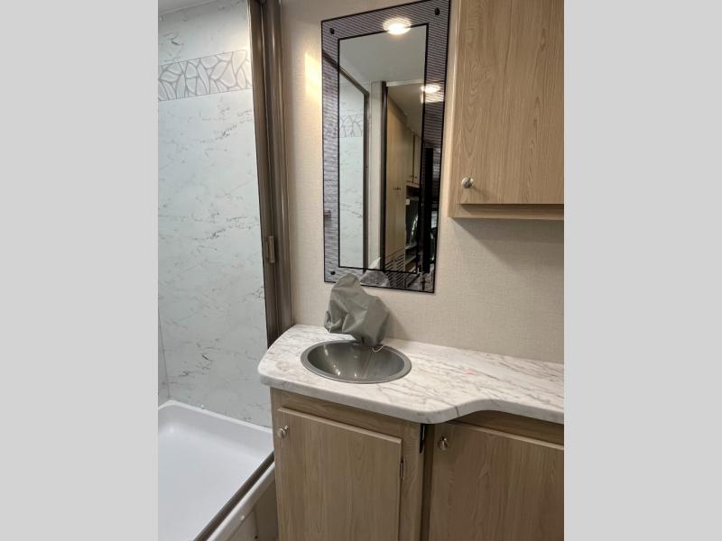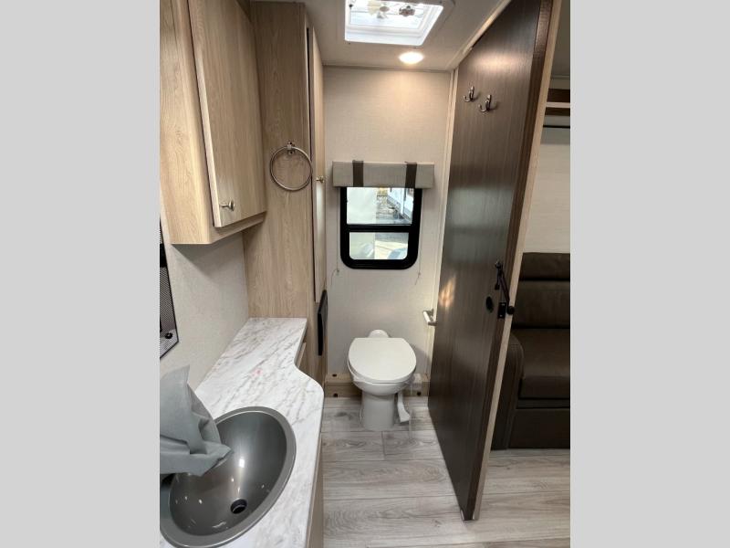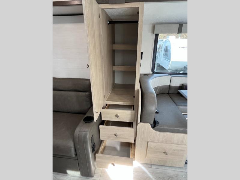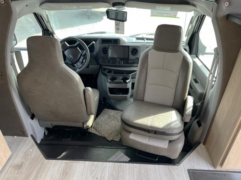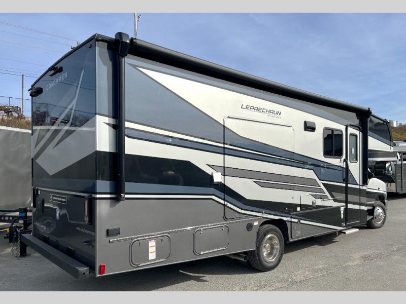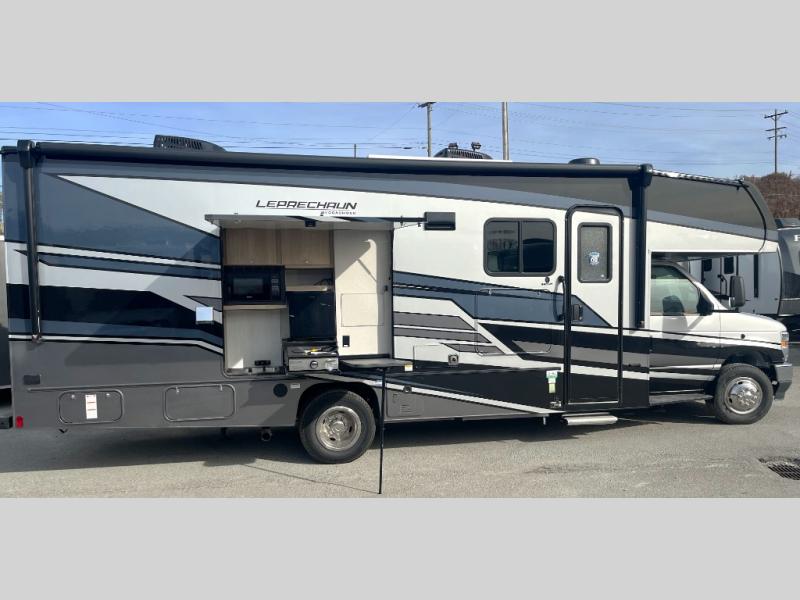 With each Leprechaun Class C gas motorhome by Coachmen you will enjoy "better" interior appointments, like the raised panel cabinetry, the one-piece thermofoil countertops, and the premium vinyl flooring. You will sleep soundly each night on the mattress with a bedspread, and staying clean will be easy with the premium showerhead and faucet in the bath. These models include reclining cockpit seats, cruise control, and a rear backup camera so you can easily get in and out of the campground. The Leprechaun is constructed with Azdel composite sidewalls, a seamless, one-piece roof membrane, and vacu-bond laminated walls, roof, and floor for a durable motorhome made to last.