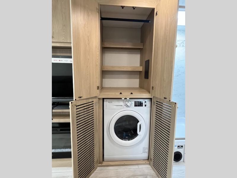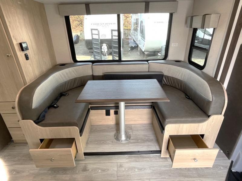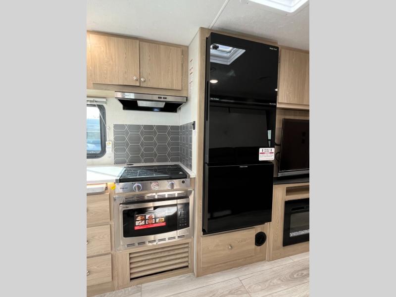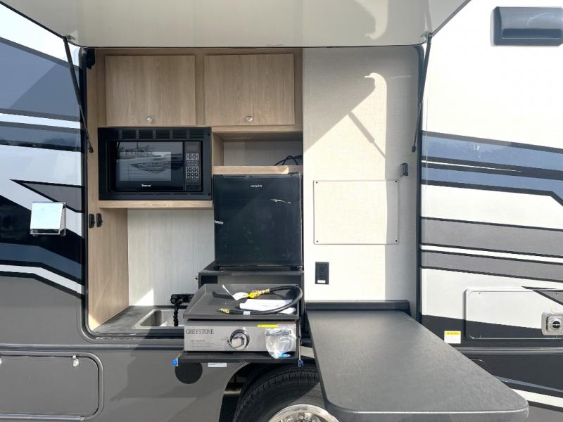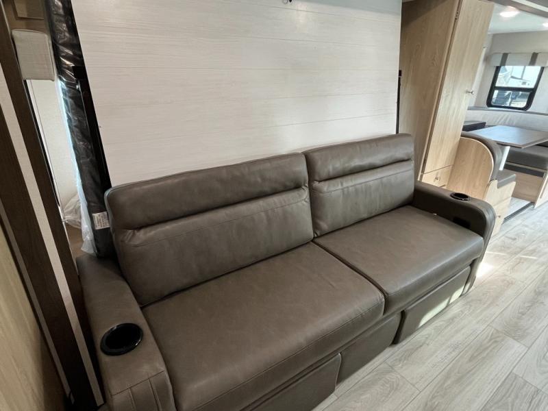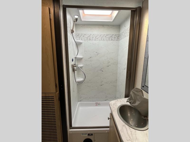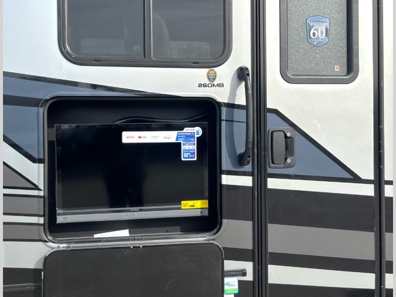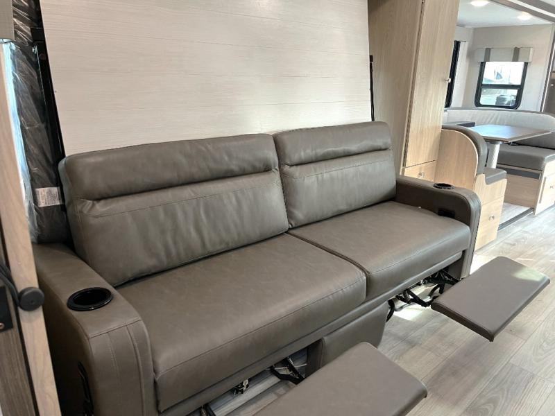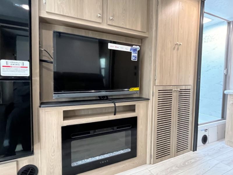 Your small family will love traveling in this motorhome! This coach is filled with exceptionally helpful amenities, like the pull-out extension in the kitchen, the 44" x 82" U-shaped dinette, the full bathroom with skylight and upgraded glass 30" x 36" shower door, and the fireplace. The chef will have an easy time cooking in the fully equipped kitchen, but also love cooking at the outside kitchen, plus there is outside storage for all of your gear and an outside TV for entertainment. You will get a good night's rest each night on the 72" x 74" king Murphy bed and the kiddos can sleep on the 57" x 80" bunk over cab!