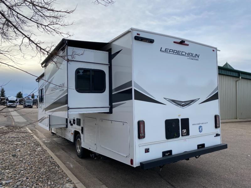 Take in the charm and style found on this Leprechaun Class C gas motorhome! The king bed slide is the perfect complement to the rear master suite, and the 44" x 76" J-lounge with 18" extension and 62" sofa are excellent additions to the living area. The kitchen has a three-burner cooktop with cover as well as a microwave oven for preparing easy meals. The 21' power awning will provide protection when you're enjoying time outdoors, and you might want to add the optional outside entertainment center for movie nights!
